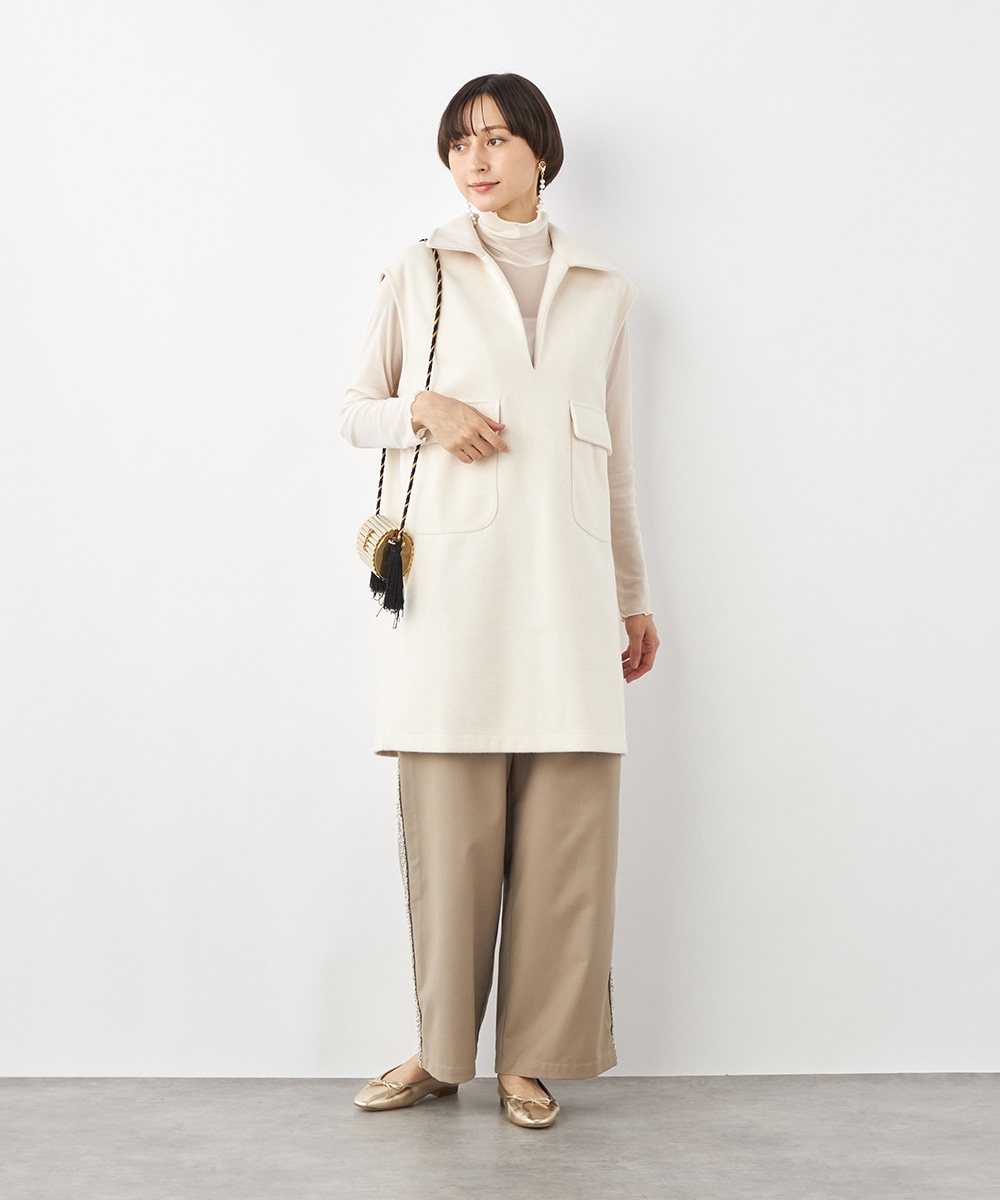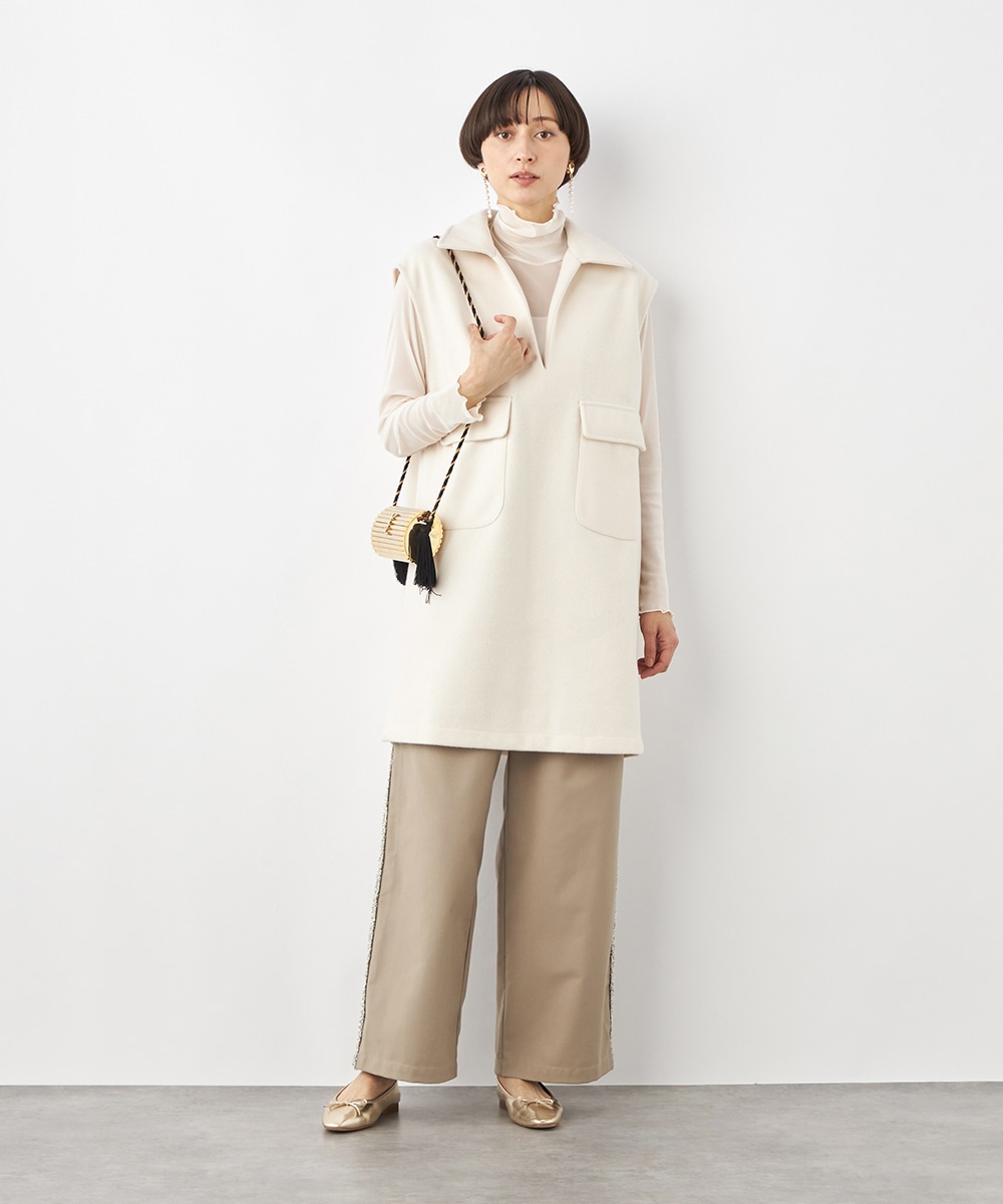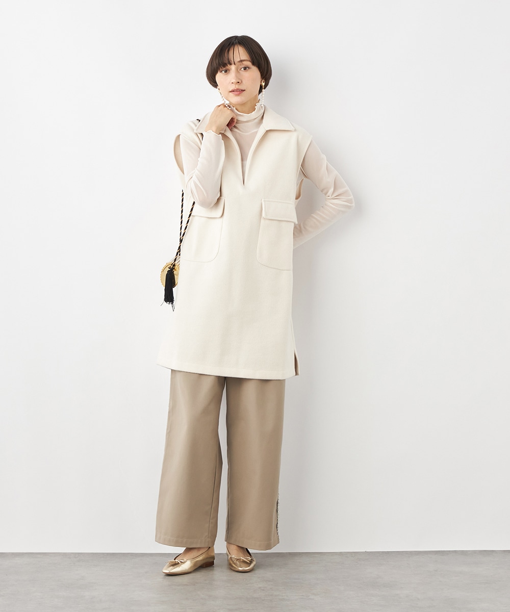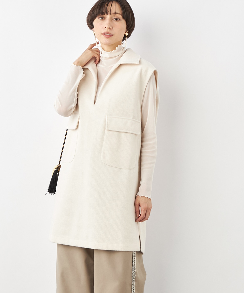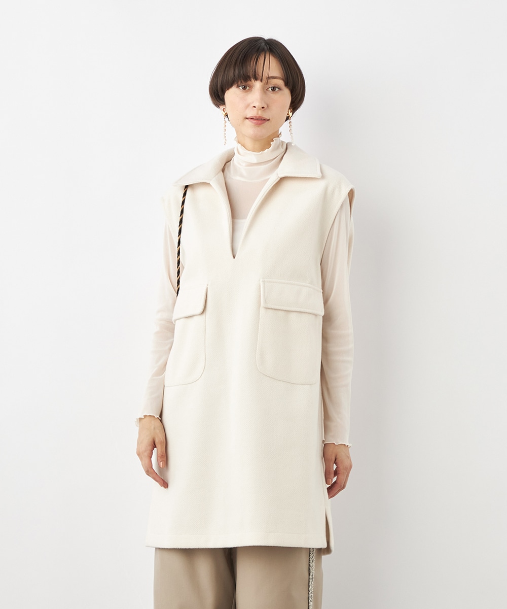 スタイリッシュな印象が加わる襟付きのデザイン。ネックの深めのカッティングにより、フェイスラインがすっきりと見えるのもポイントです。シャツやタートルネックプルオーバーなど、インナーでのアレンジも多彩に楽しめます。パンツとのボトムレイヤードもおすすめです。