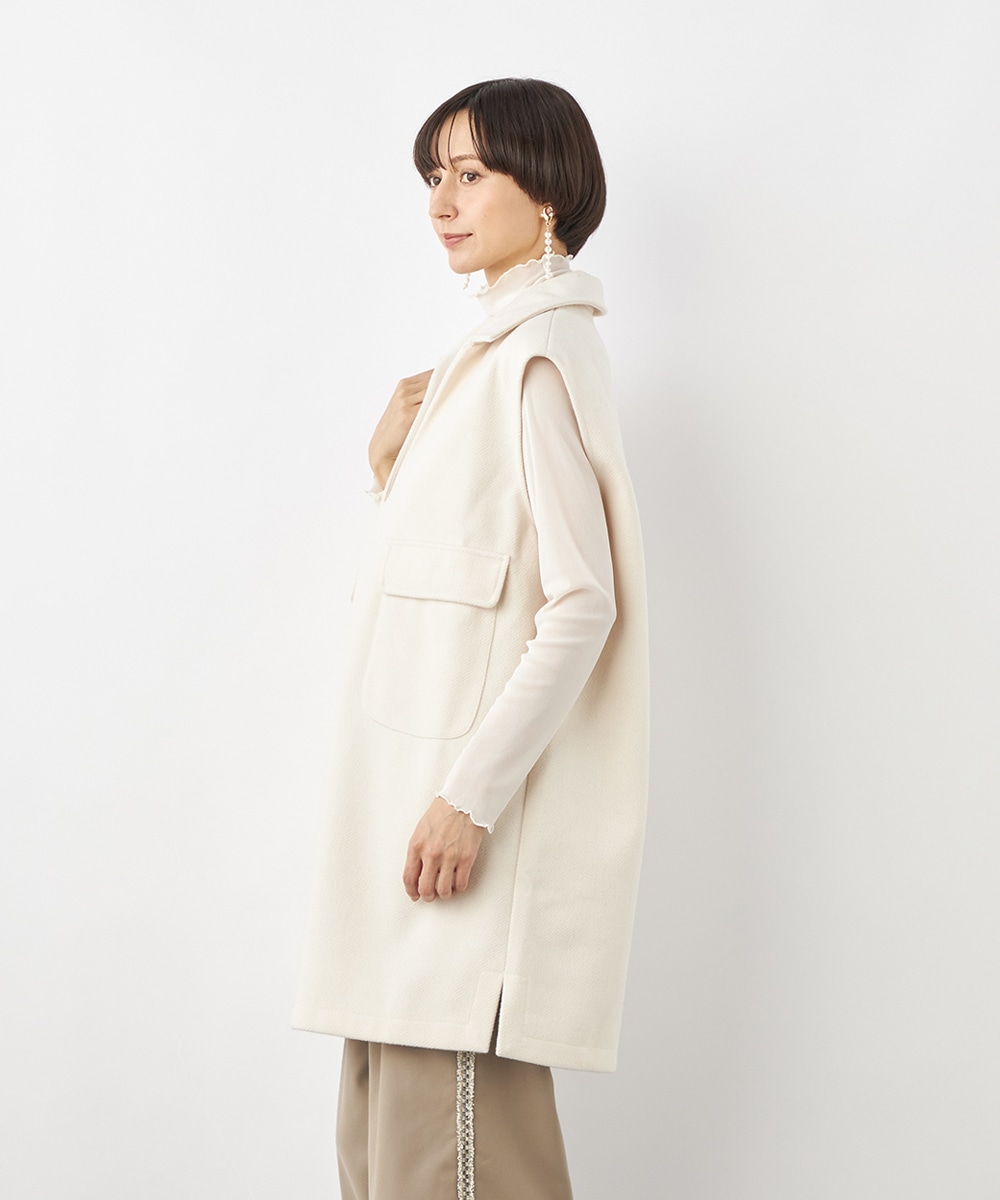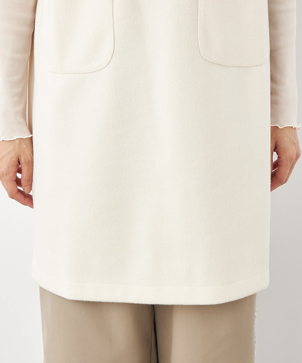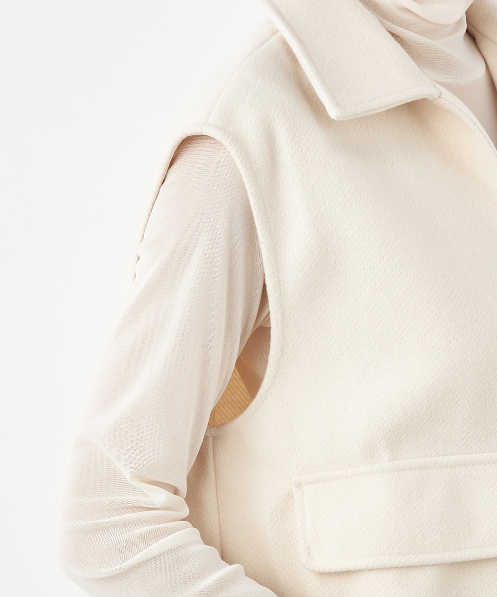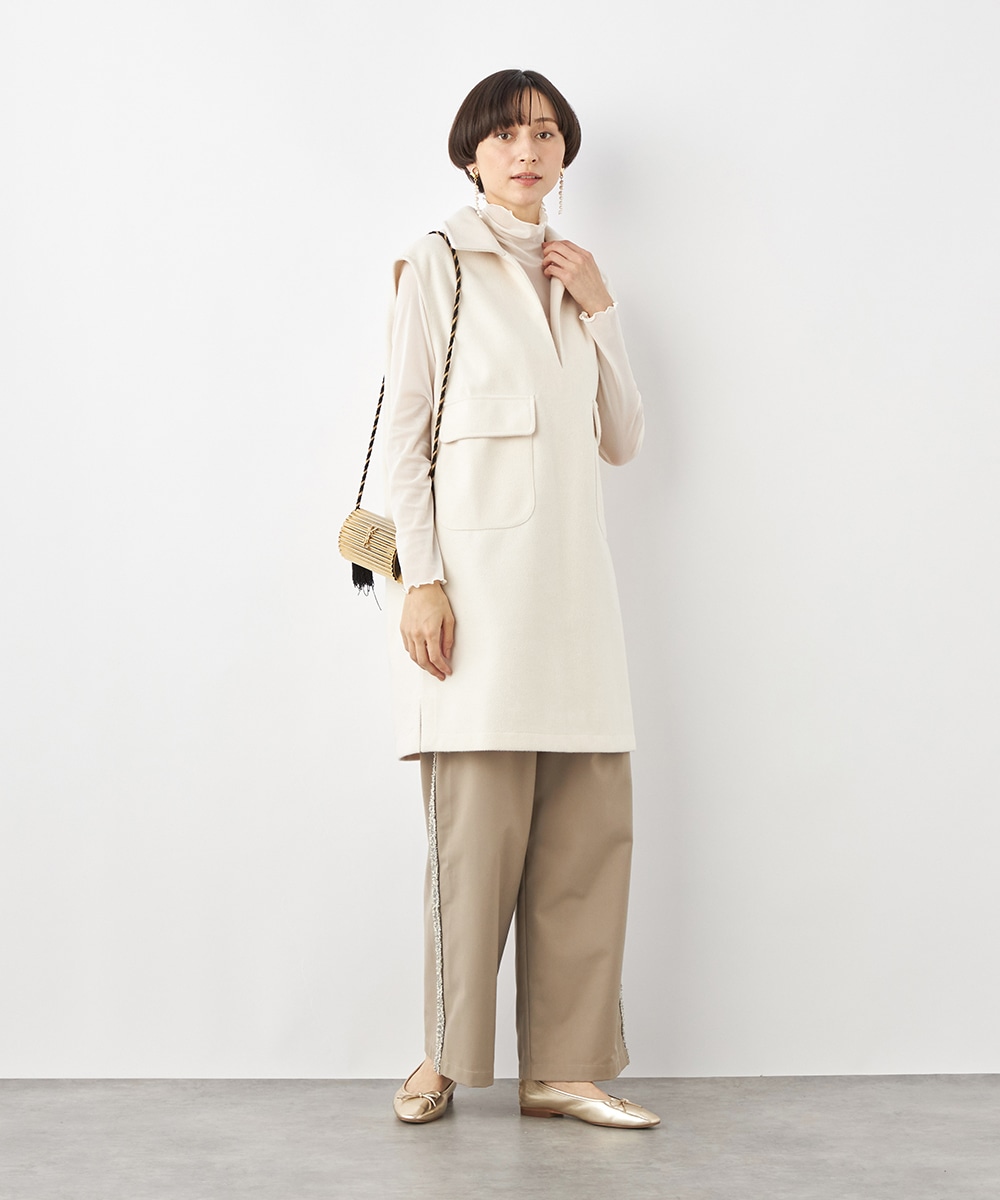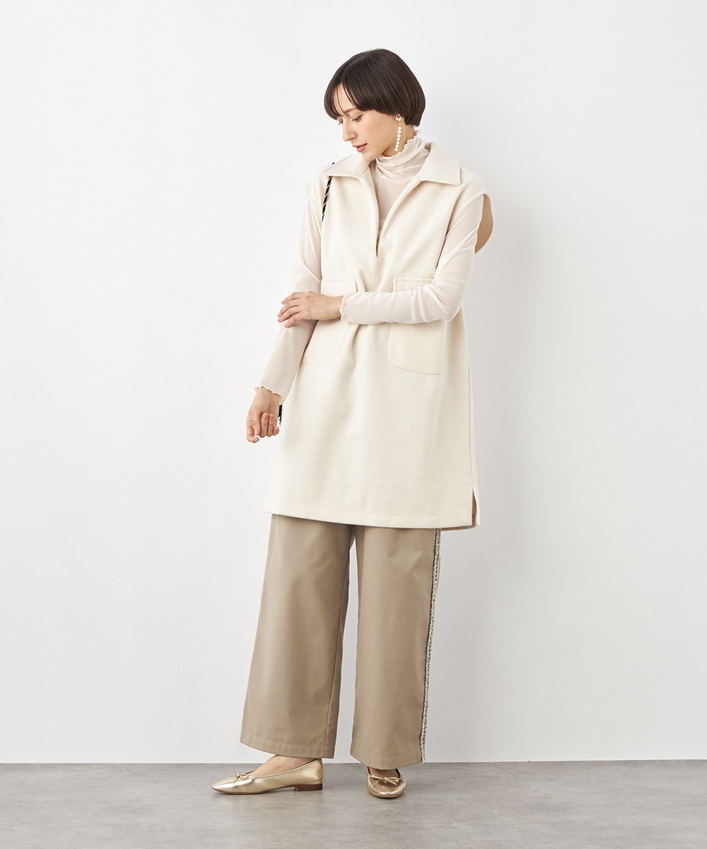 スタイリッシュな印象が加わる襟付きのデザイン。ネックの深めのカッティングにより、フェイスラインがすっきりと見えるのもポイントです。シャツやタートルネックプルオーバーなど、インナーでのアレンジも多彩に楽しめます。パンツとのボトムレイヤードもおすすめです。