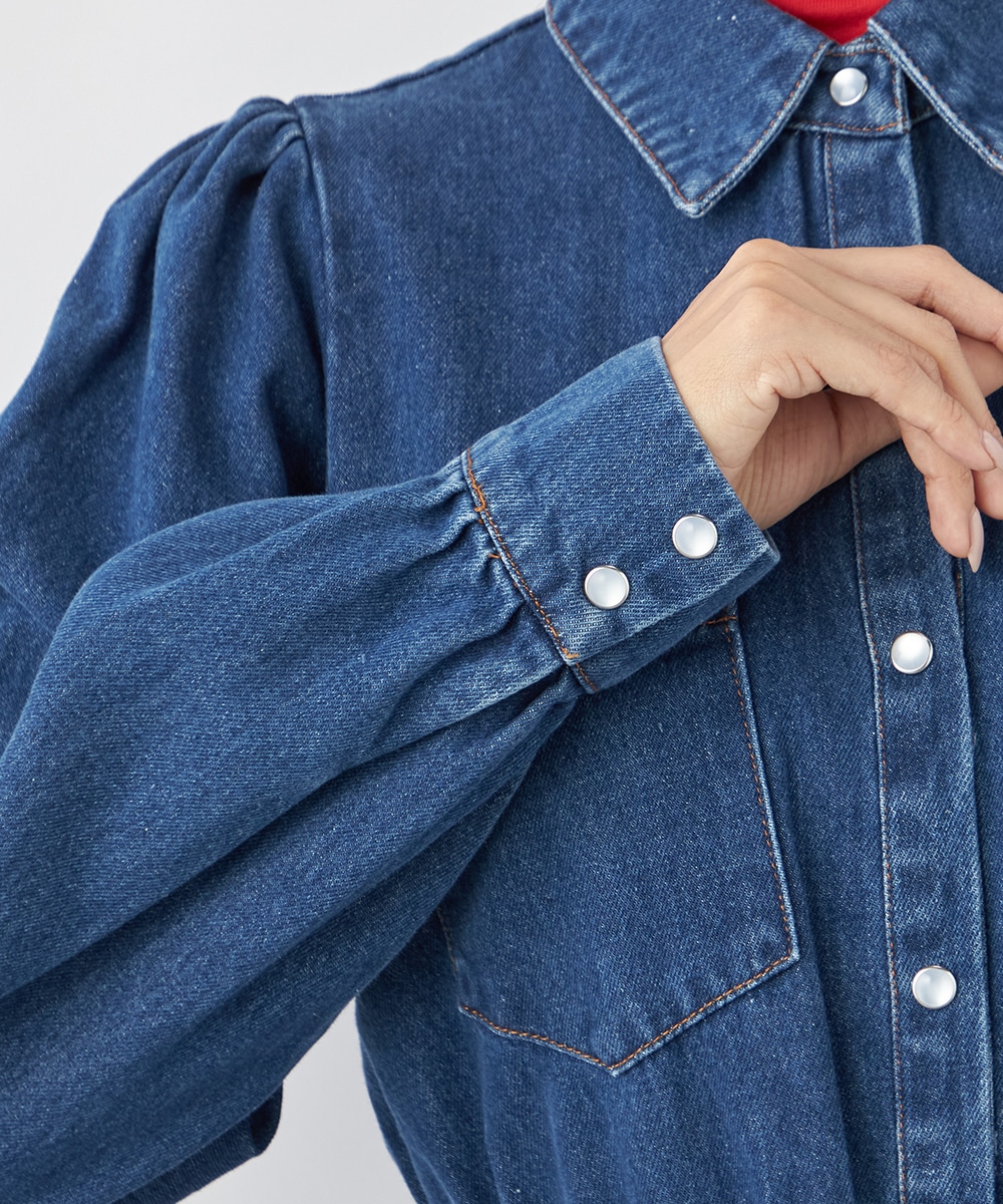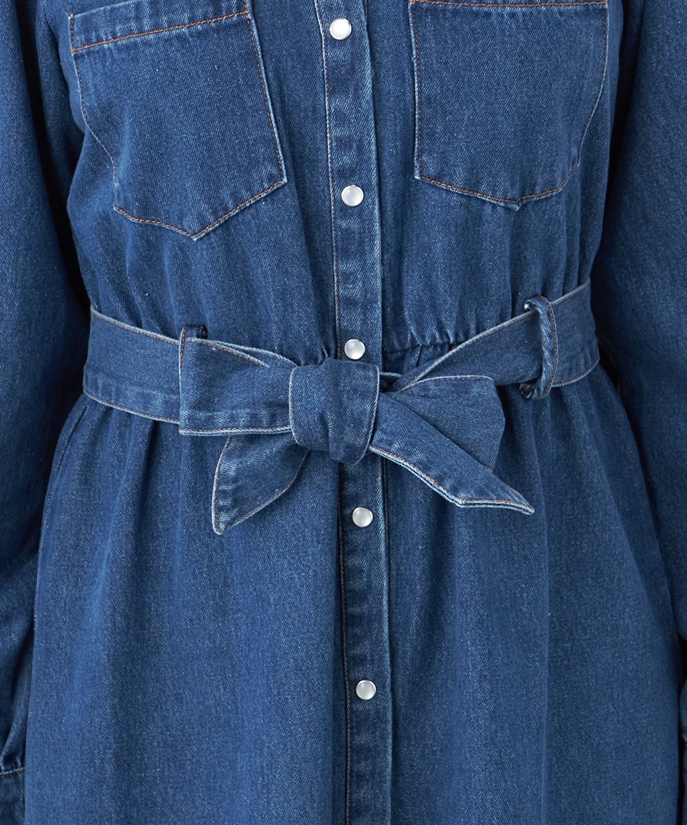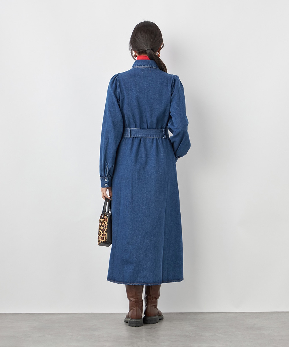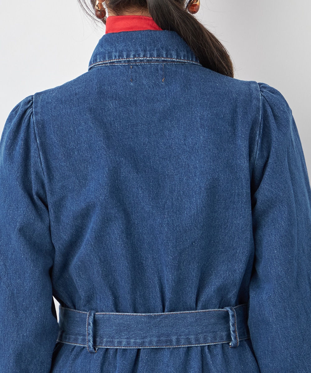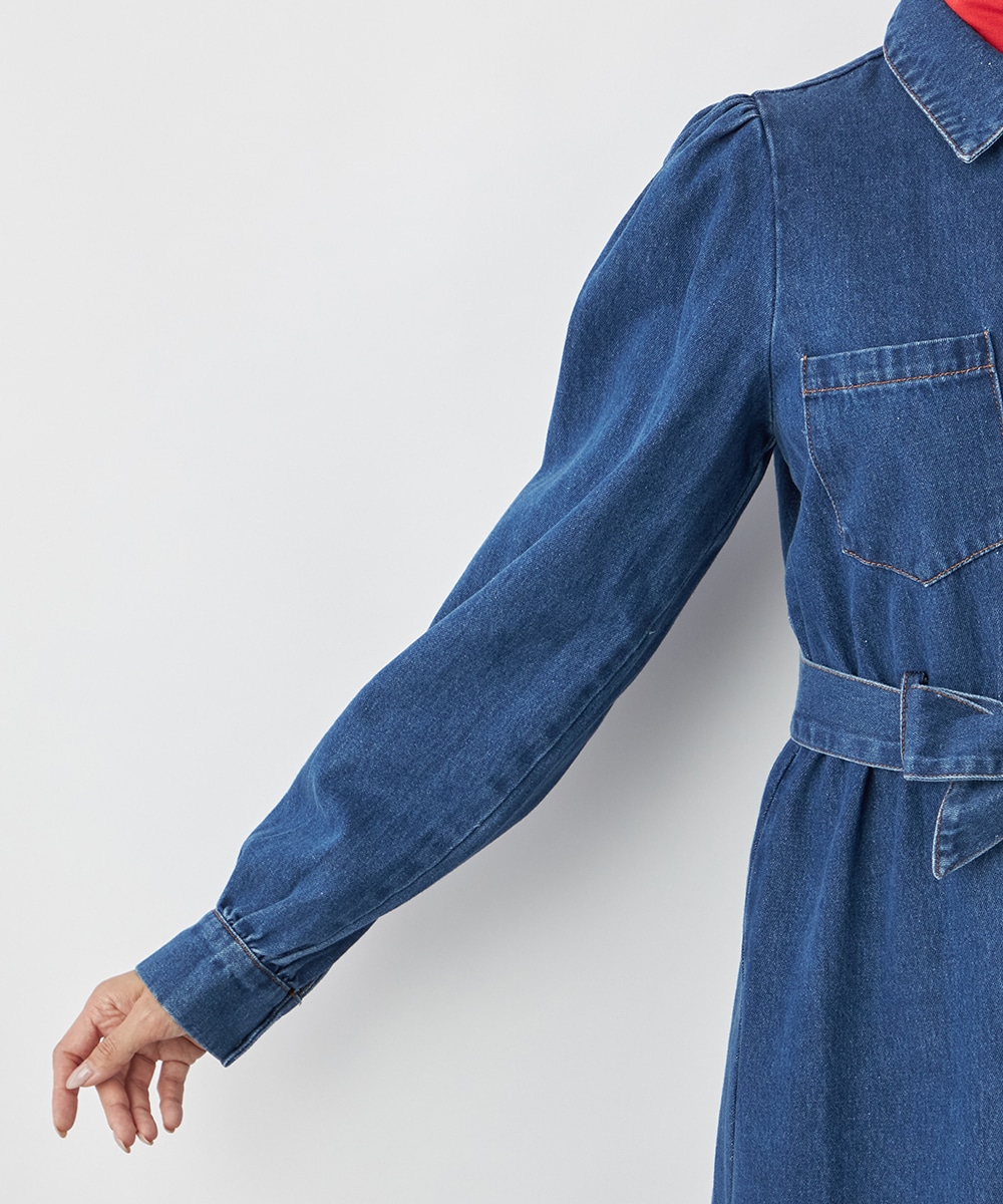 フィット&フレアシルエットやギャザーをさりげなくデザインしたパフスリーブが愛らしい印象です。長めの着丈に仕上がり、大人っぽく上品に着こなせます。配色のステッチやスナップボタンがカジュアル感を高めるアクセントとして有効です。同素材のリボンベルトが付属して、ウエストマークのアレンジも楽しめます。
