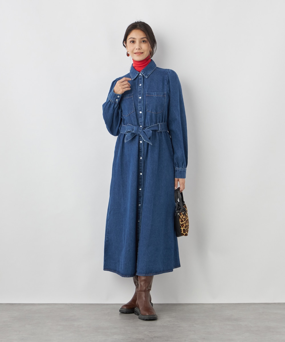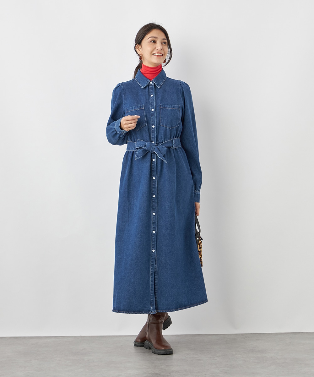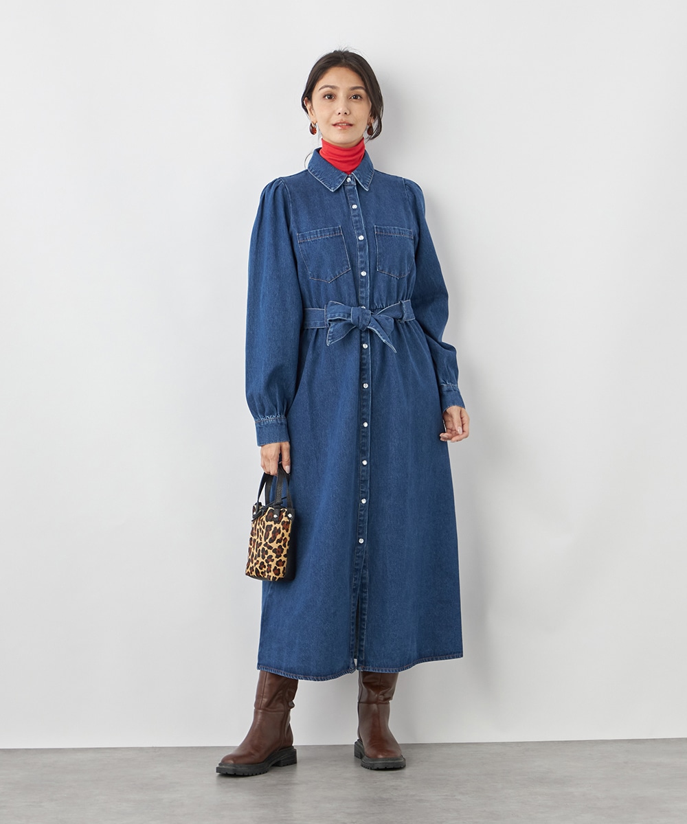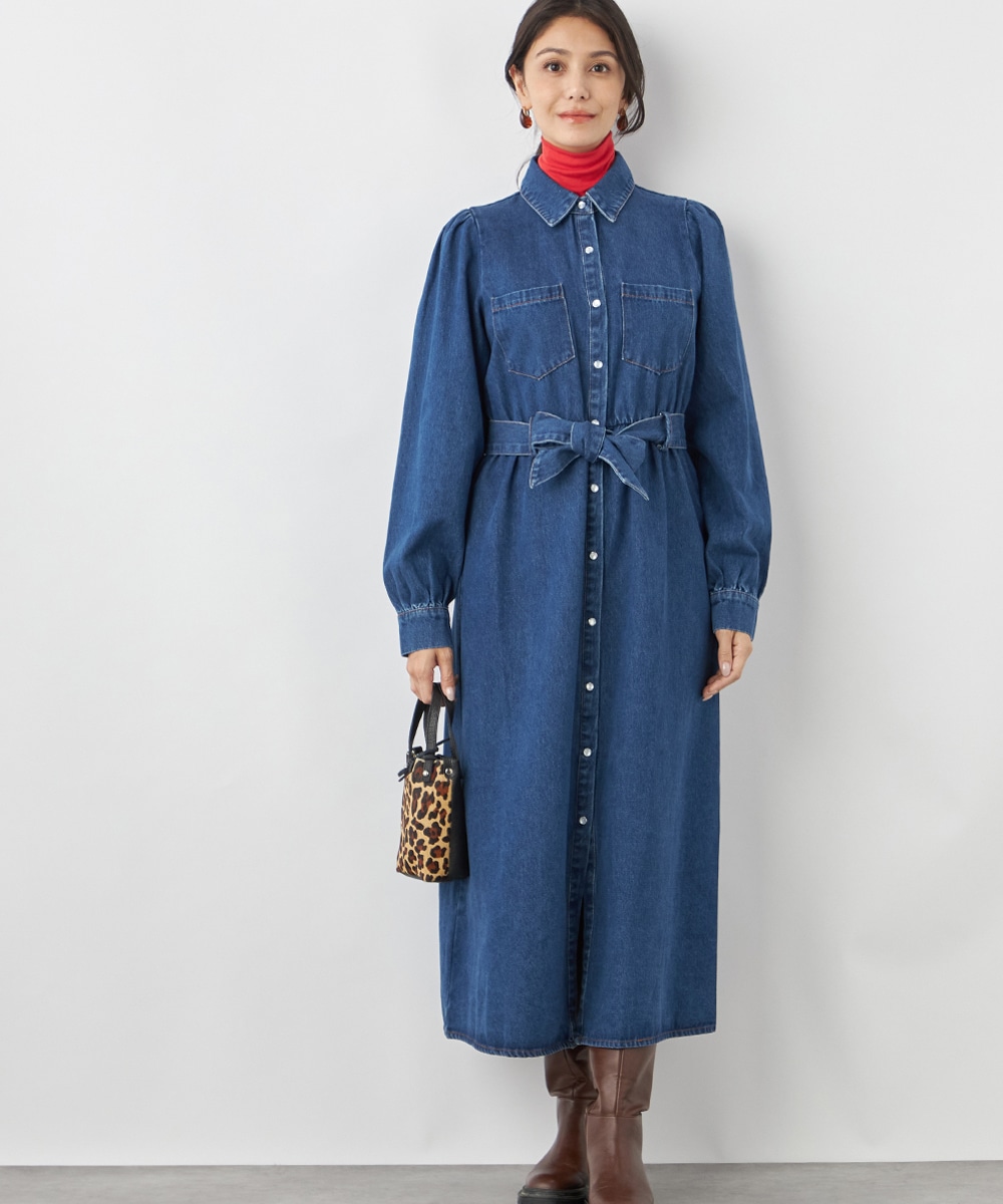 フィット&フレアシルエットやギャザーをさりげなくデザインしたパフスリーブが愛らしい印象です。長めの着丈に仕上がり、大人っぽく上品に着こなせます。配色のステッチやスナップボタンがカジュアル感を高めるアクセントとして有効です。同素材のリボンベルトが付属して、ウエストマークのアレンジも楽しめます。