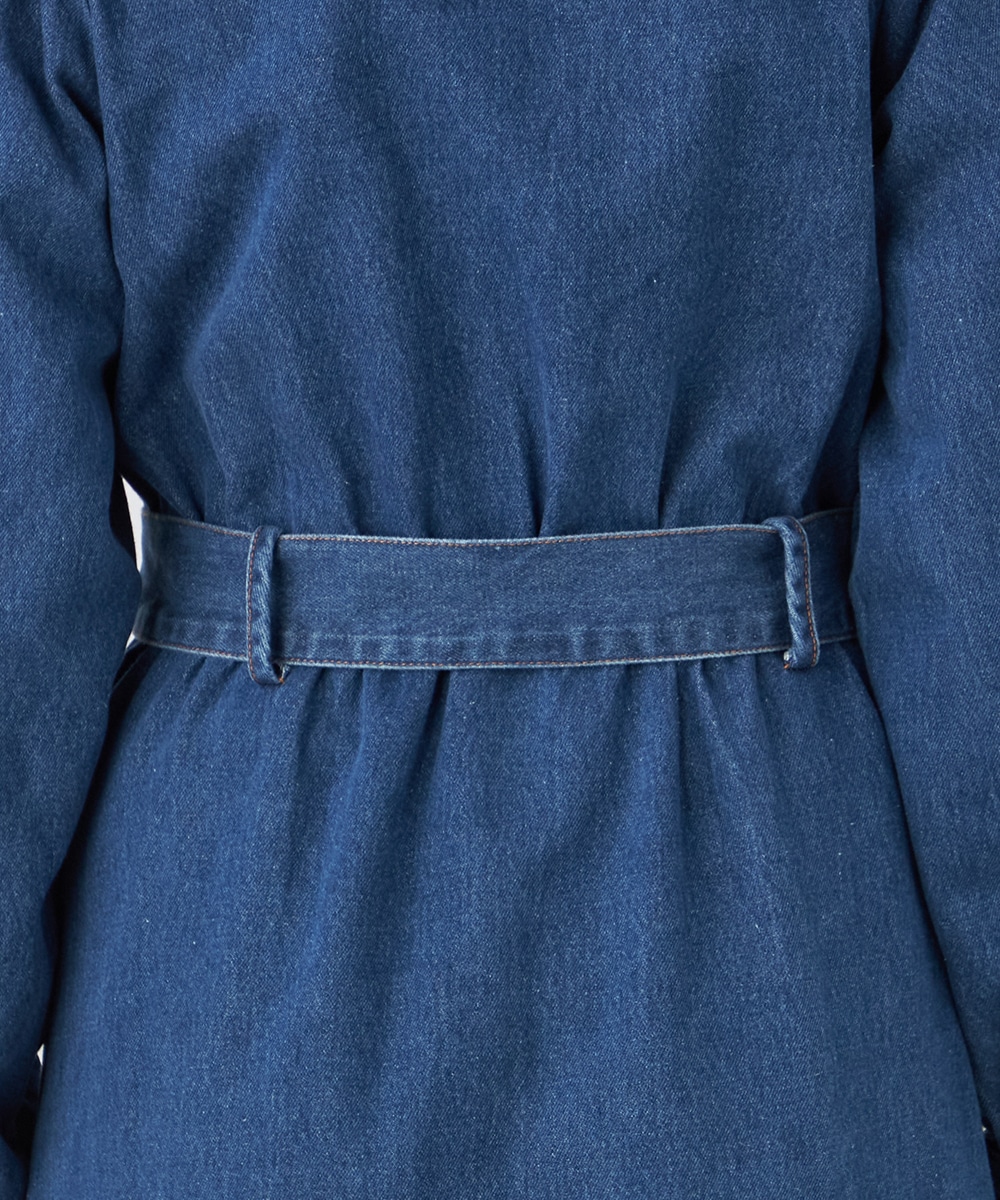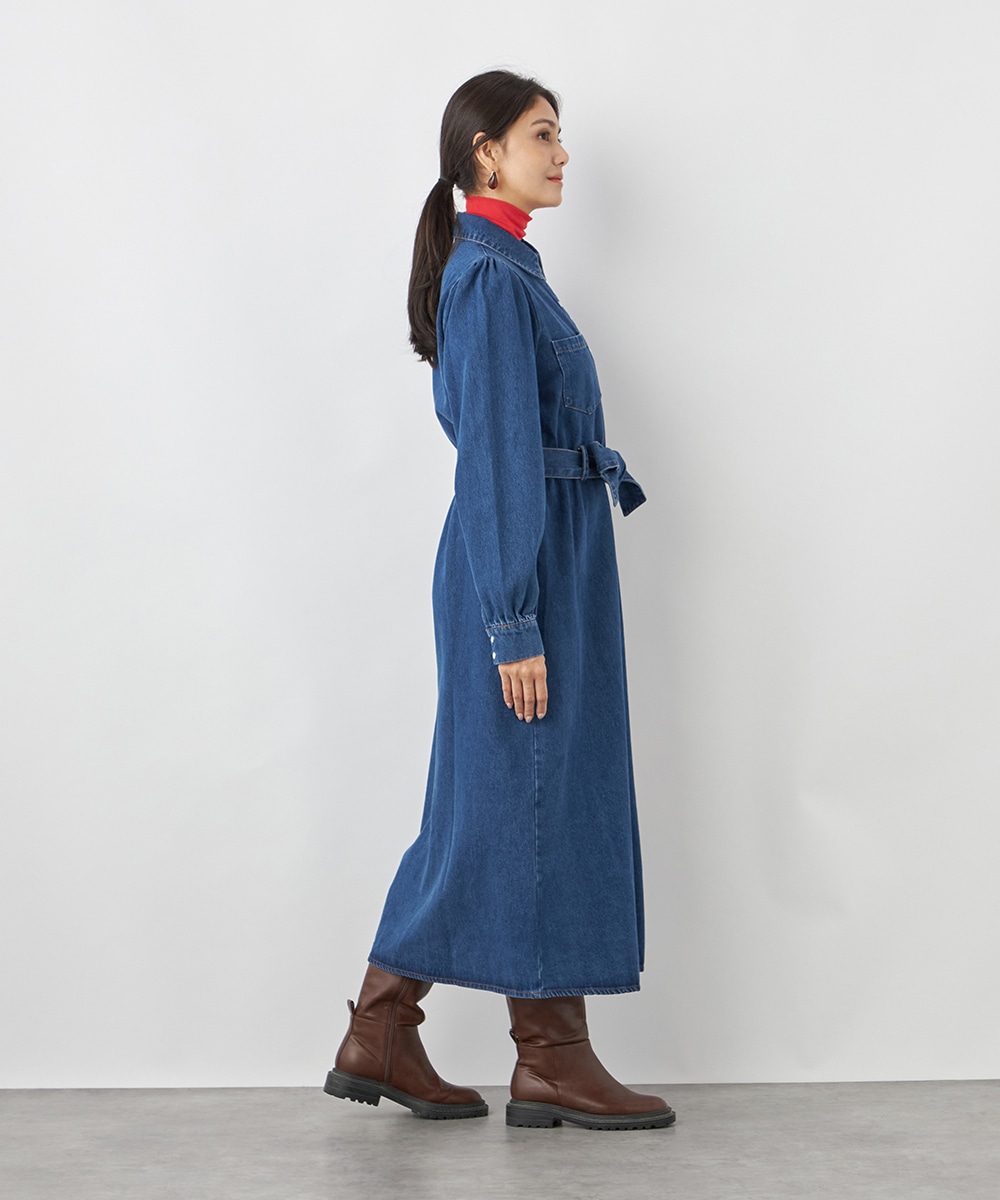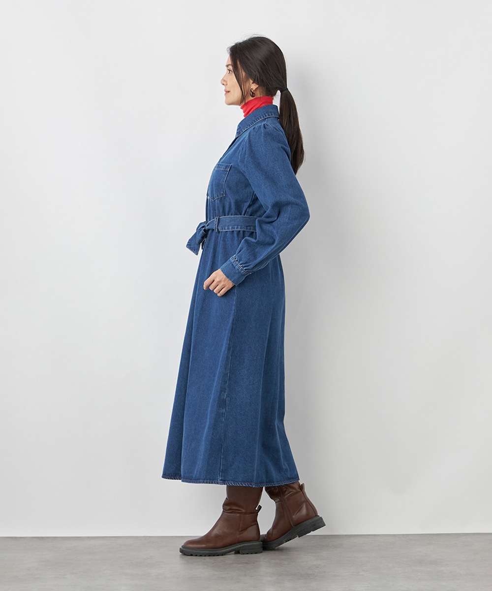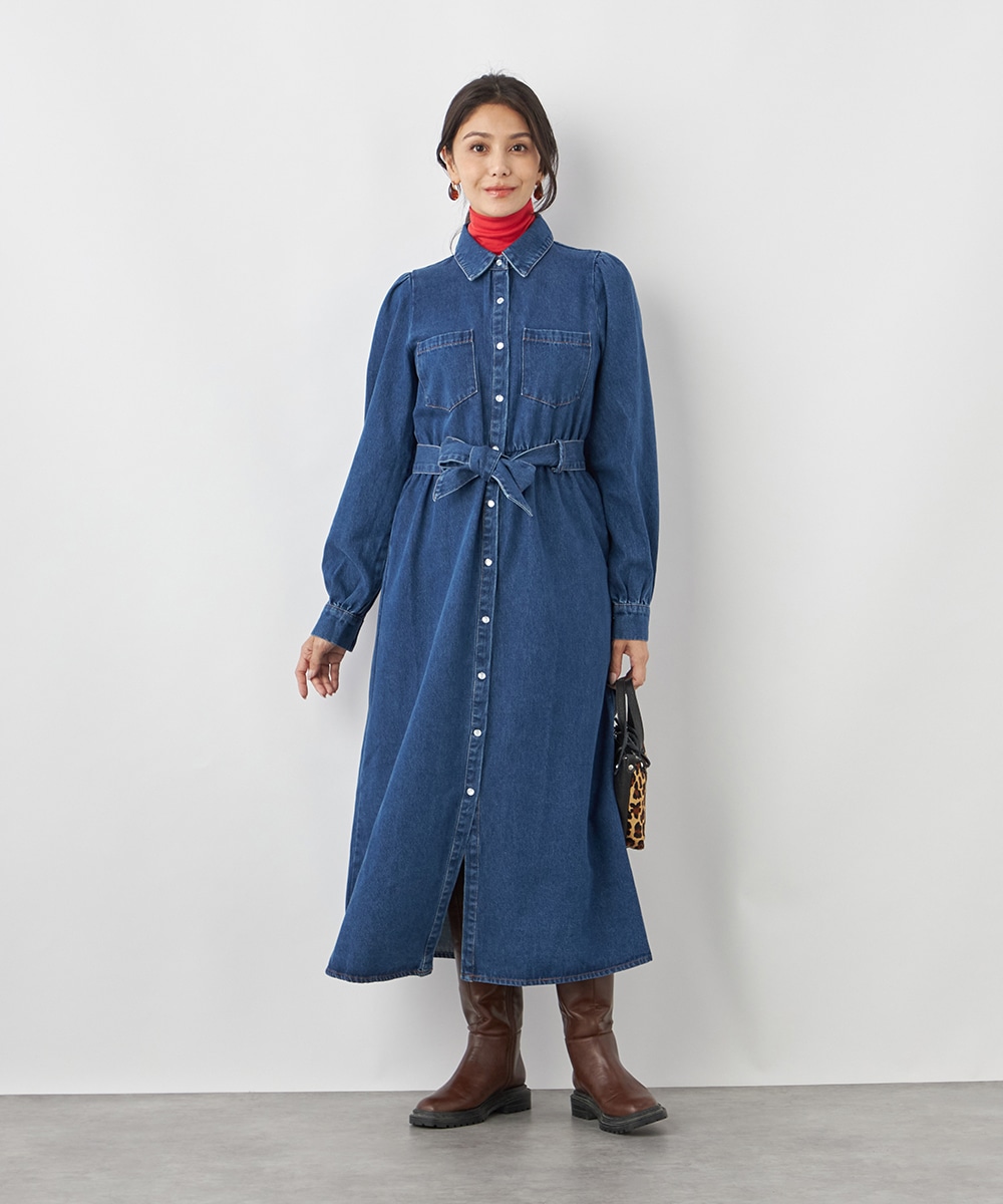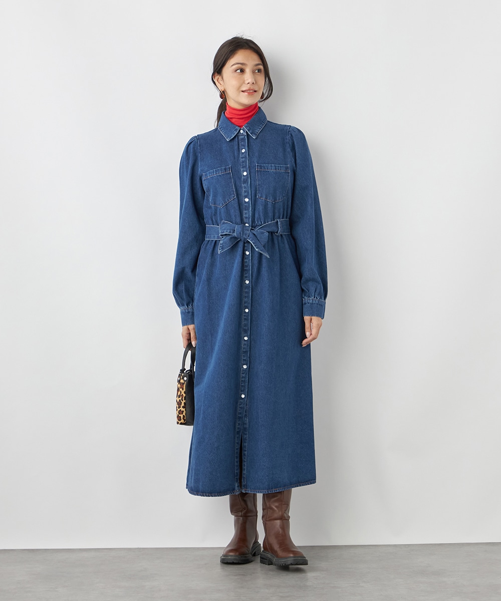 フィット&フレアシルエットやギャザーをさりげなくデザインしたパフスリーブが愛らしい印象です。長めの着丈に仕上がり、大人っぽく上品に着こなせます。配色のステッチやスナップボタンがカジュアル感を高めるアクセントとして有効です。同素材のリボンベルトが付属して、ウエストマークのアレンジも楽しめます。