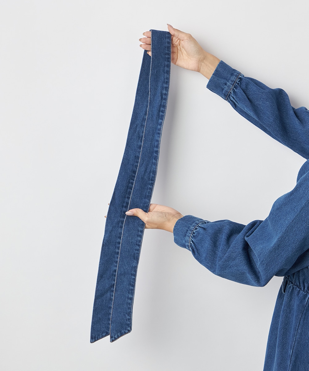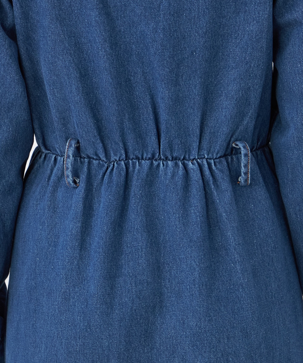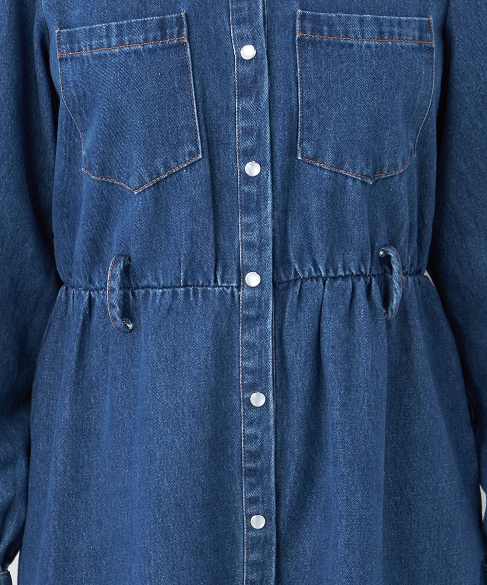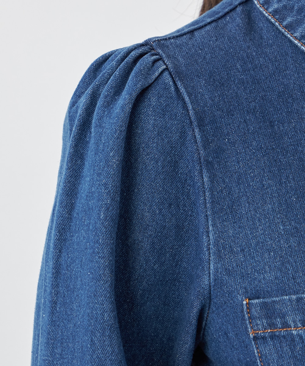フィット&フレアシルエットやギャザーをさりげなくデザインしたパフスリーブが愛らしい印象です。長めの着丈に仕上がり、大人っぽく上品に着こなせます。配色のステッチやスナップボタンがカジュアル感を高めるアクセントとして有効です。同素材のリボンベルトが付属して、ウエストマークのアレンジも楽しめます。