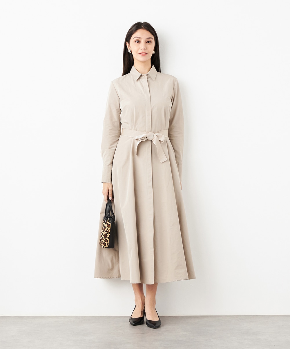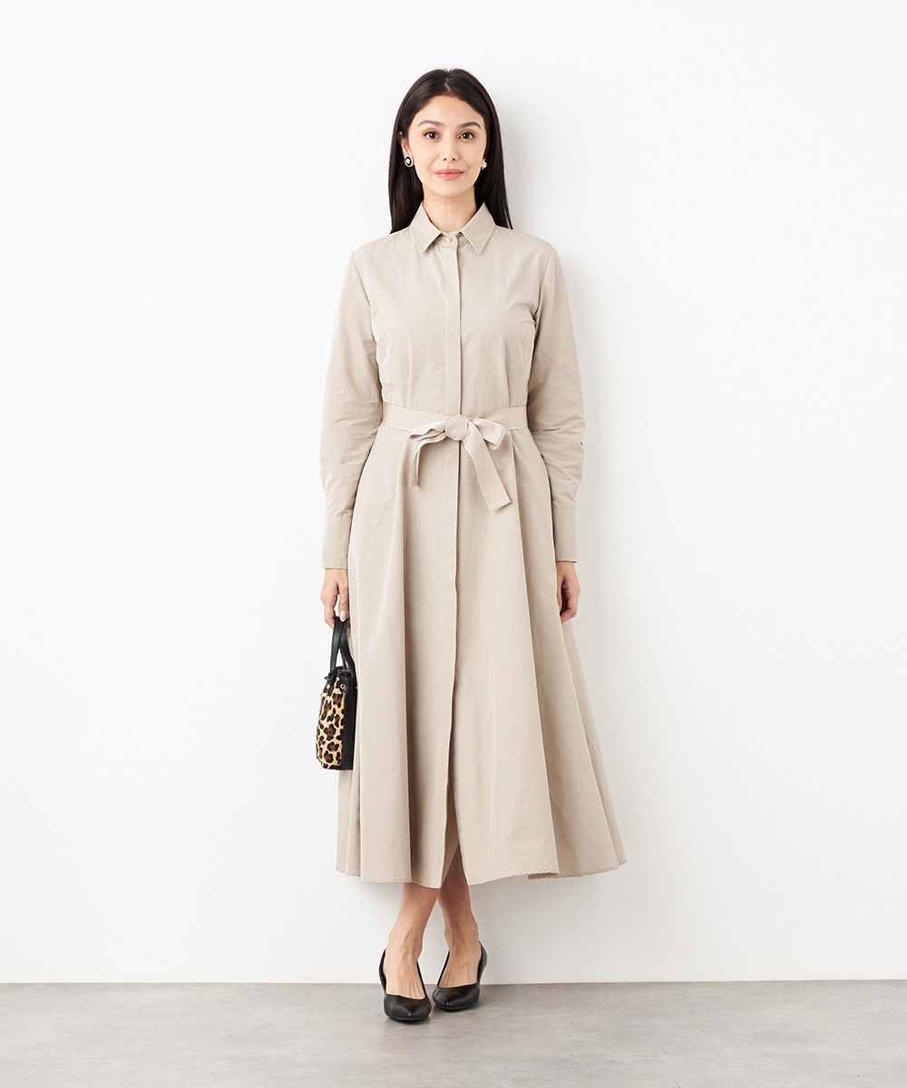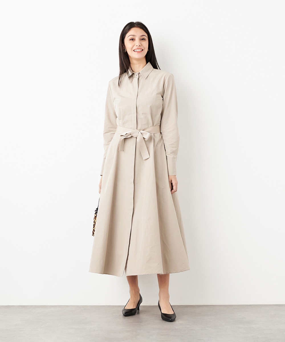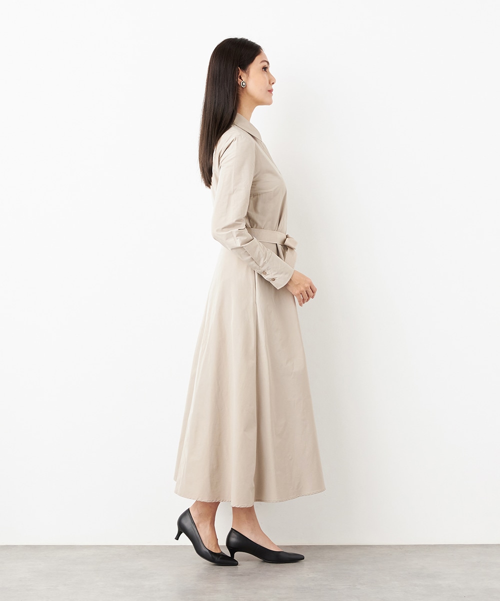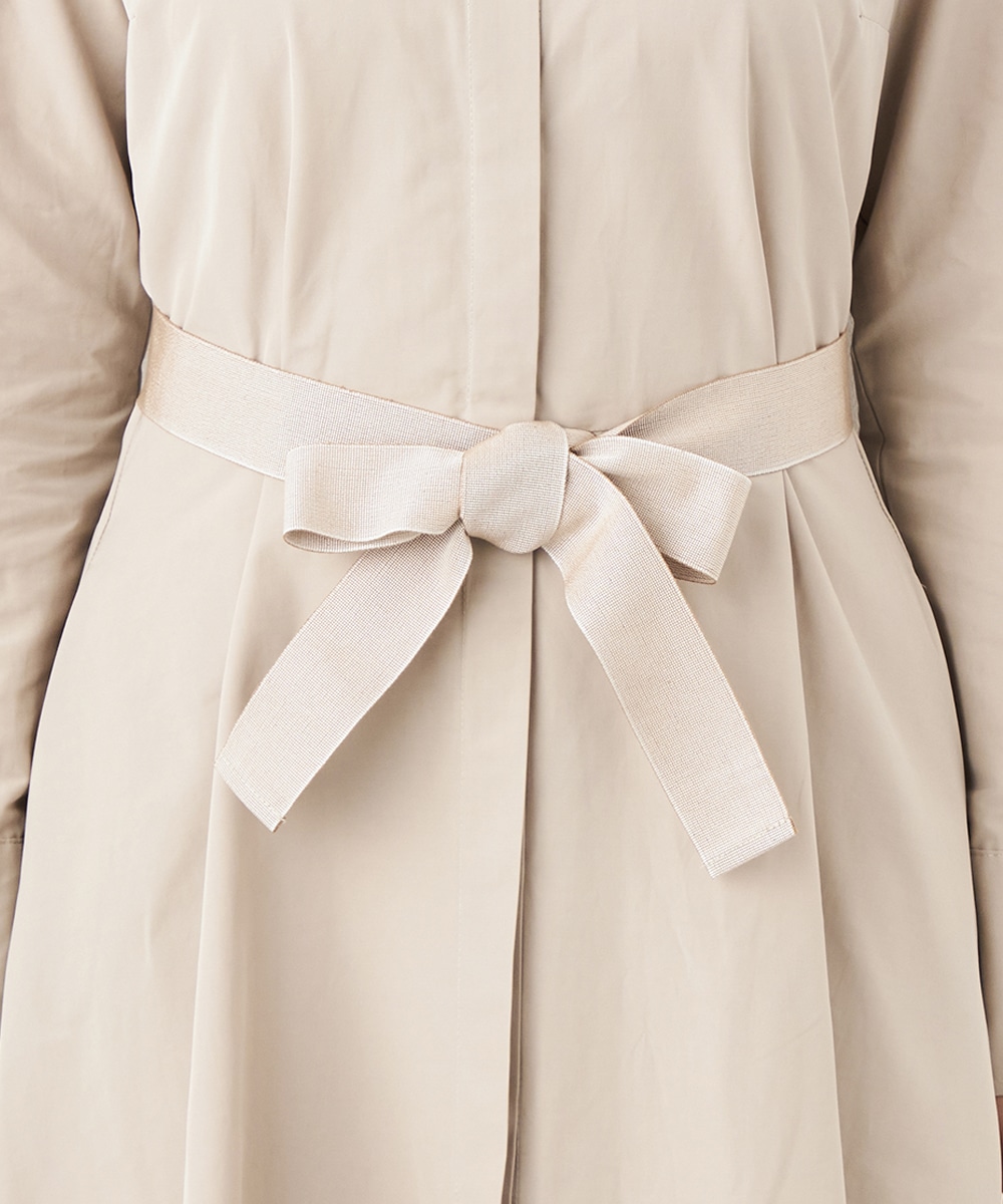 大人っぽく品良く着こなせるロング丈のデザイン。襟付きならではのシャープな印象も魅力です。同素材のリボンベルトが付属して、ウエストマークのアレンジも可能。前開き仕様で軽い羽織としても活用できます。スマートフォンなど小物の収納に便利なサイドポケット付きです。