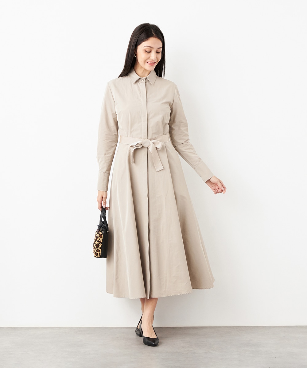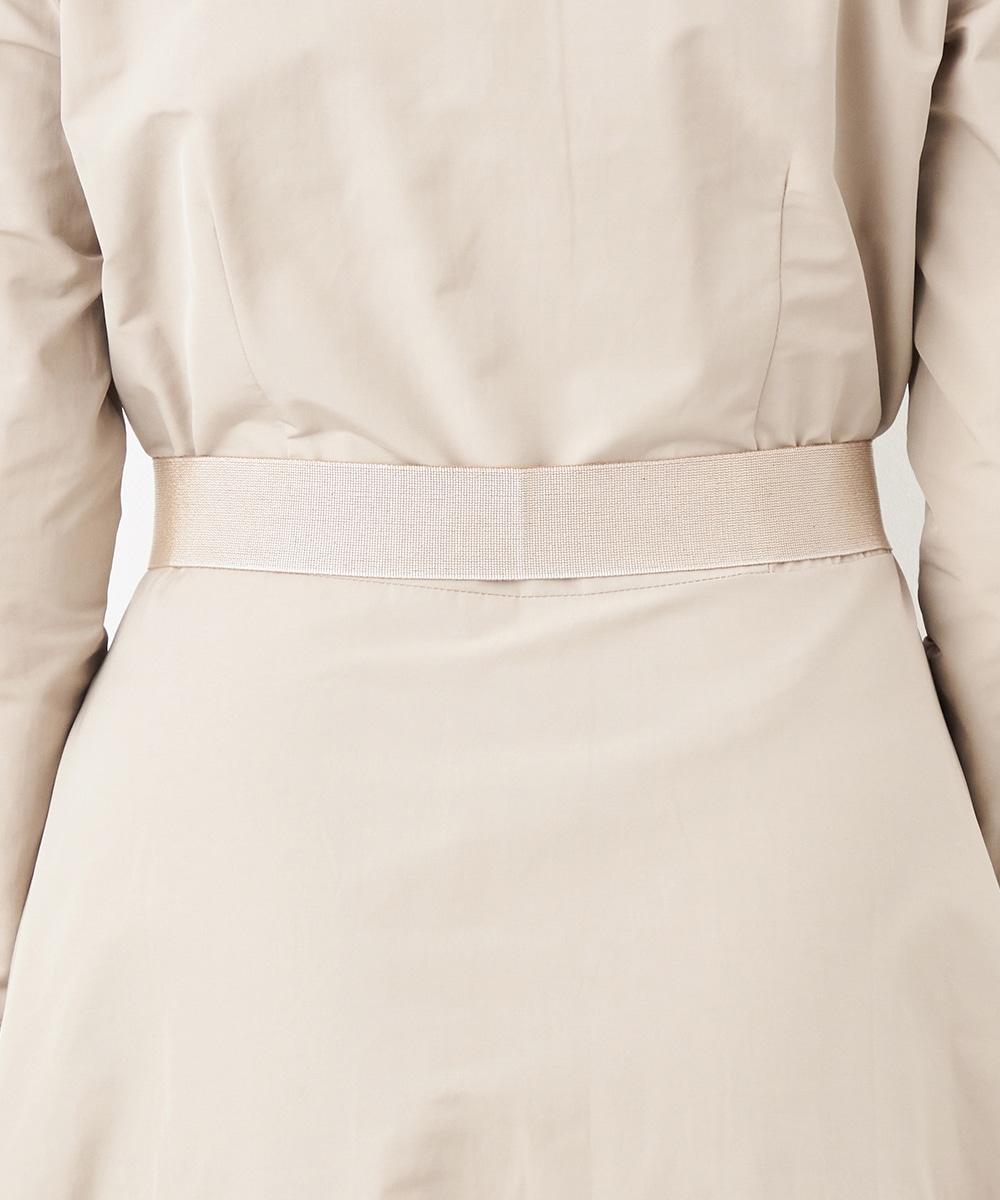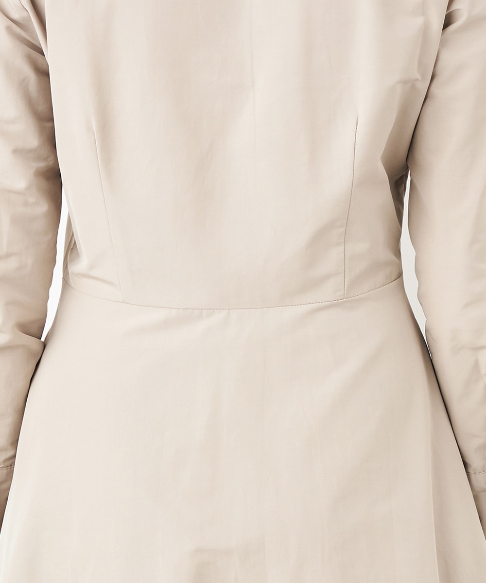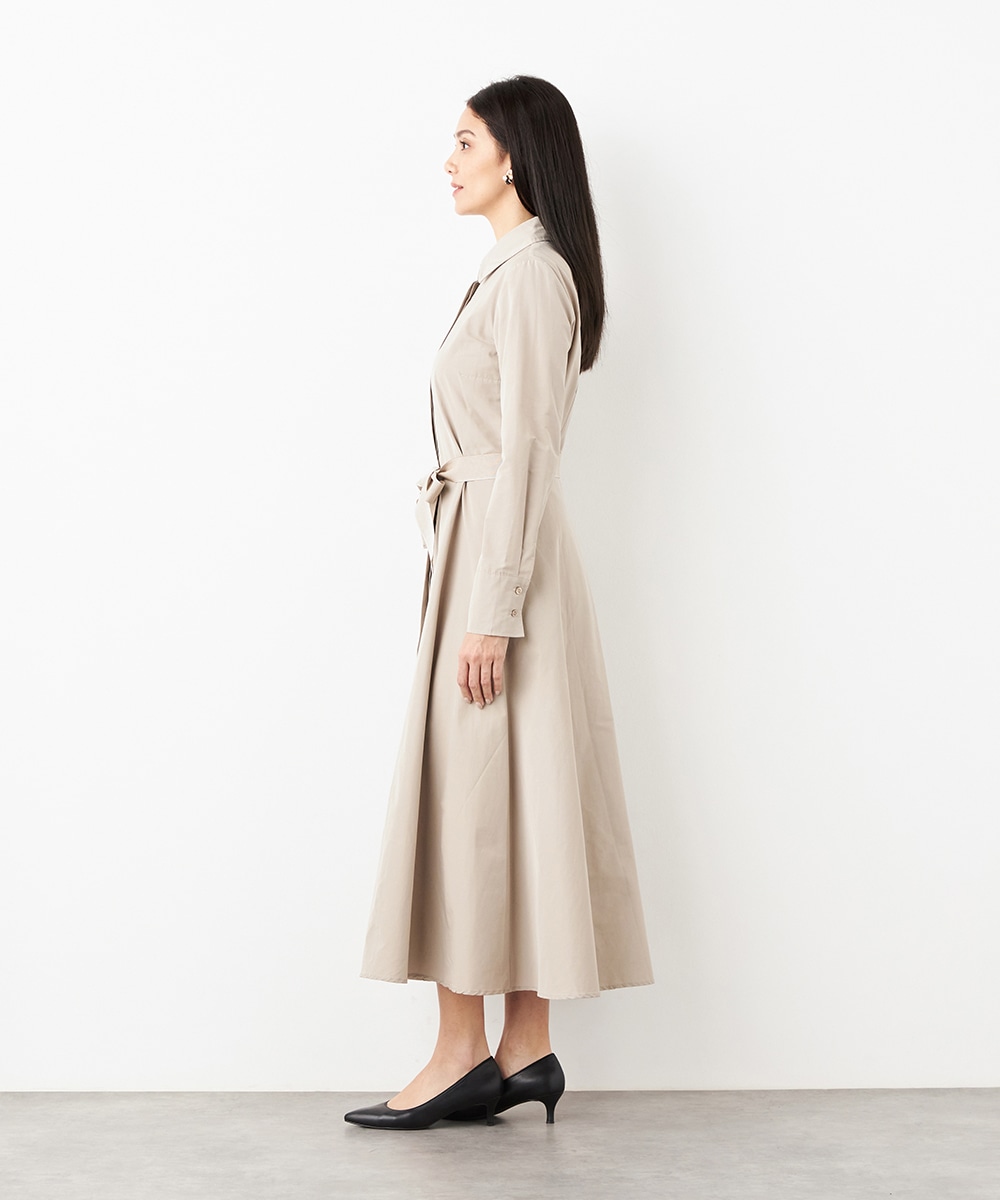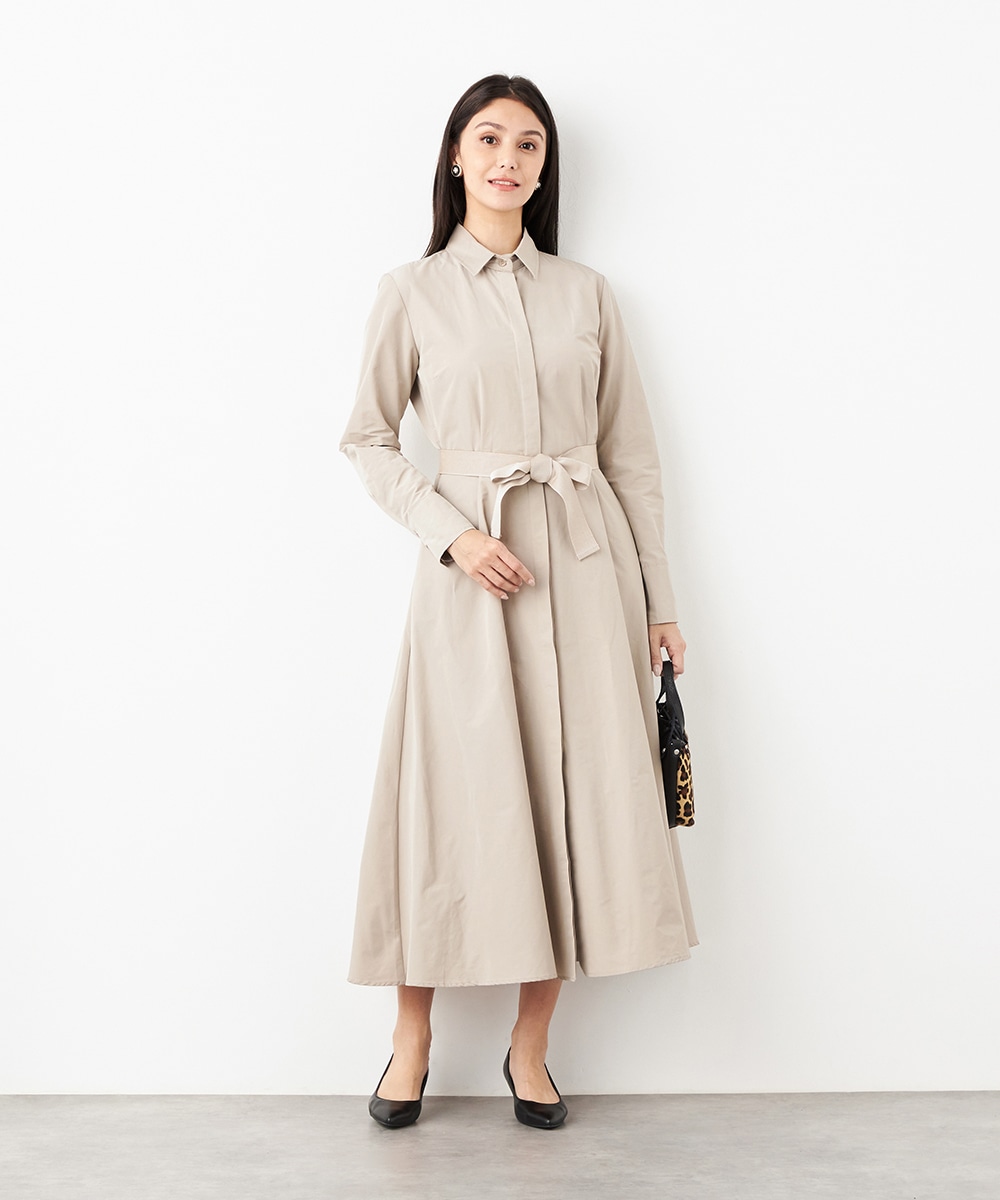 大人っぽく品良く着こなせるロング丈のデザイン。襟付きならではのシャープな印象も魅力です。同素材のリボンベルトが付属して、ウエストマークのアレンジも可能。前開き仕様で軽い羽織としても活用できます。スマートフォンなど小物の収納に便利なサイドポケット付きです。