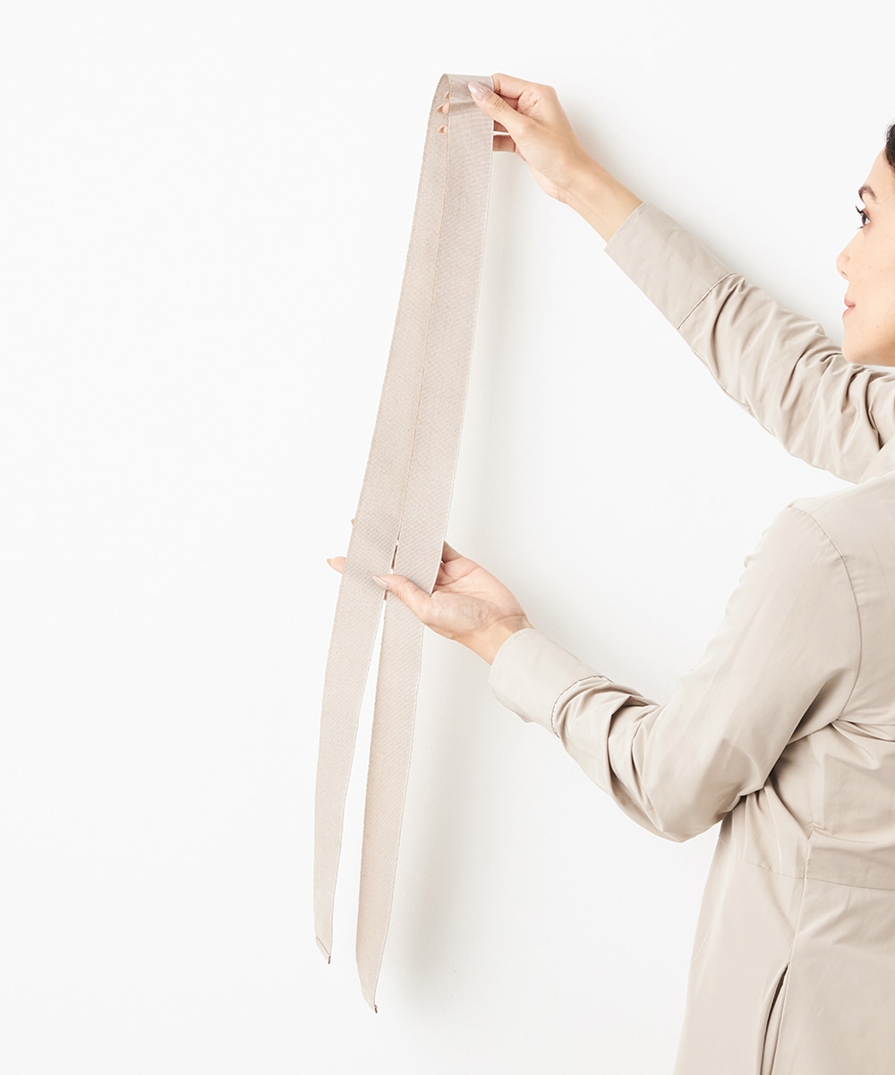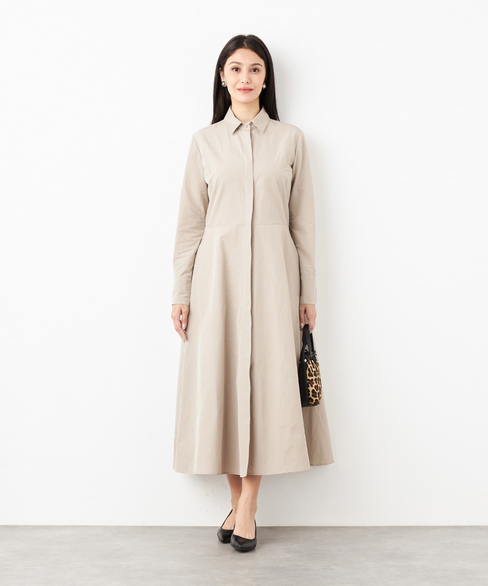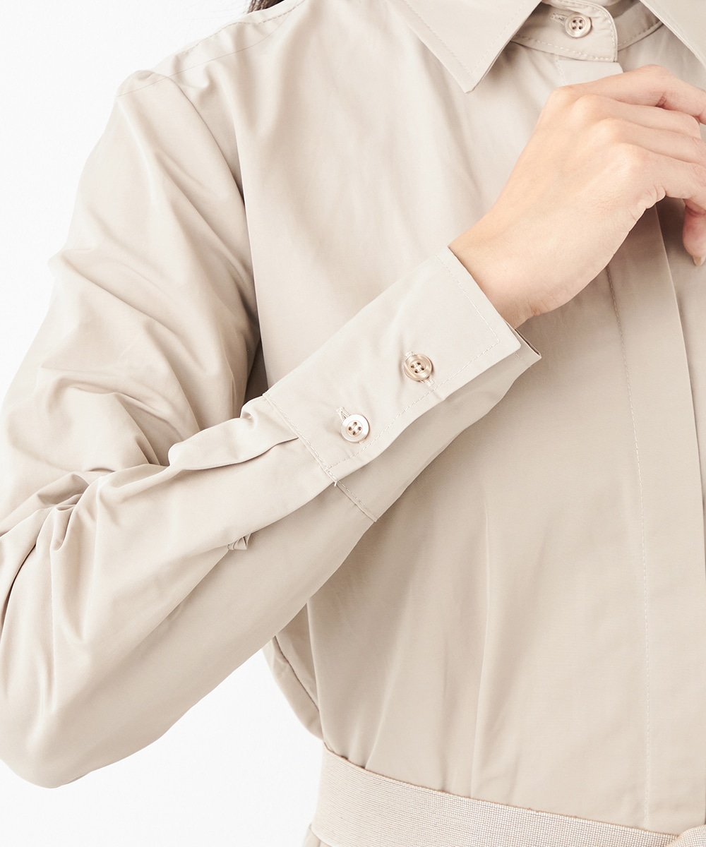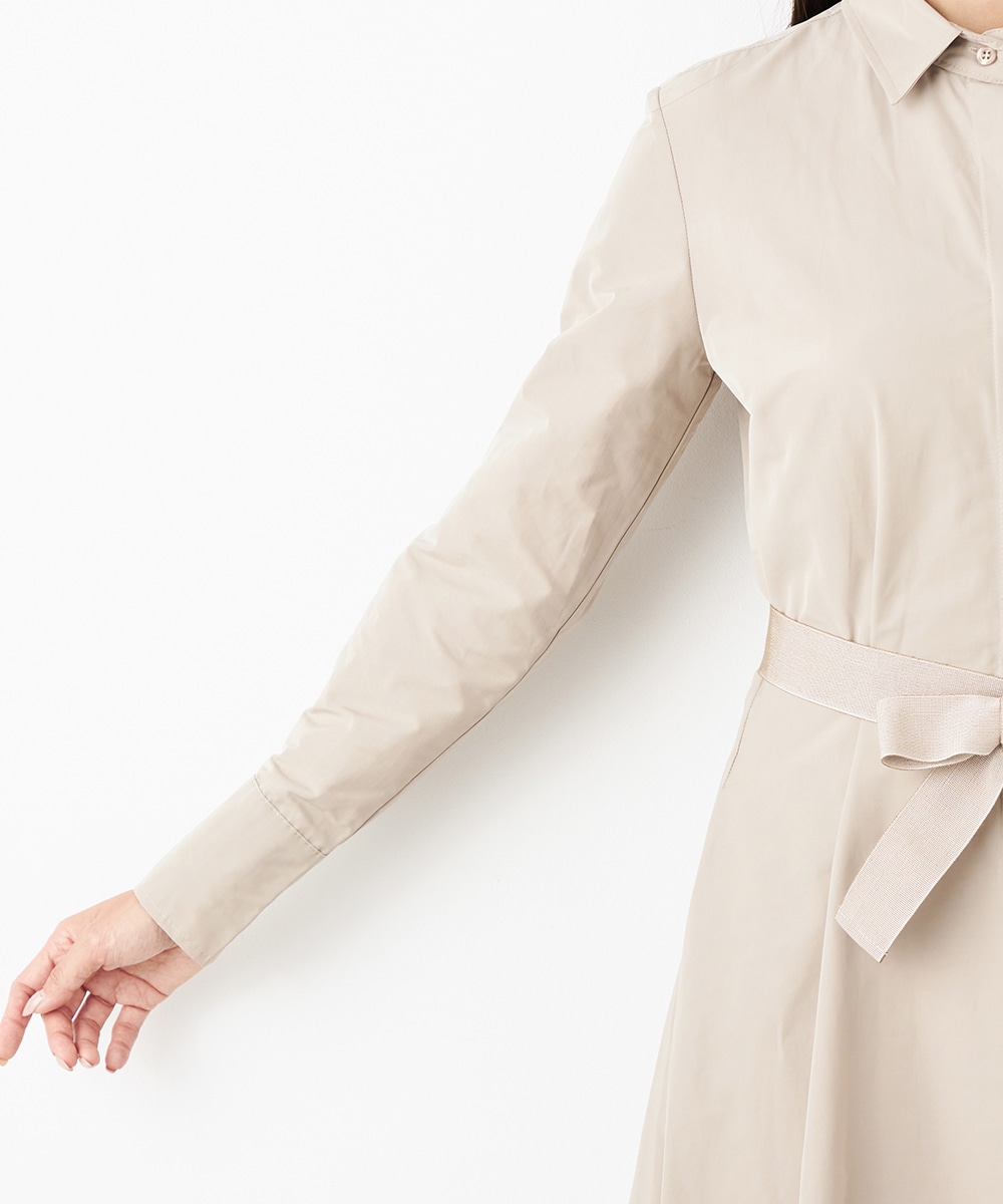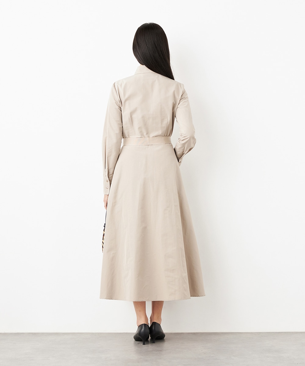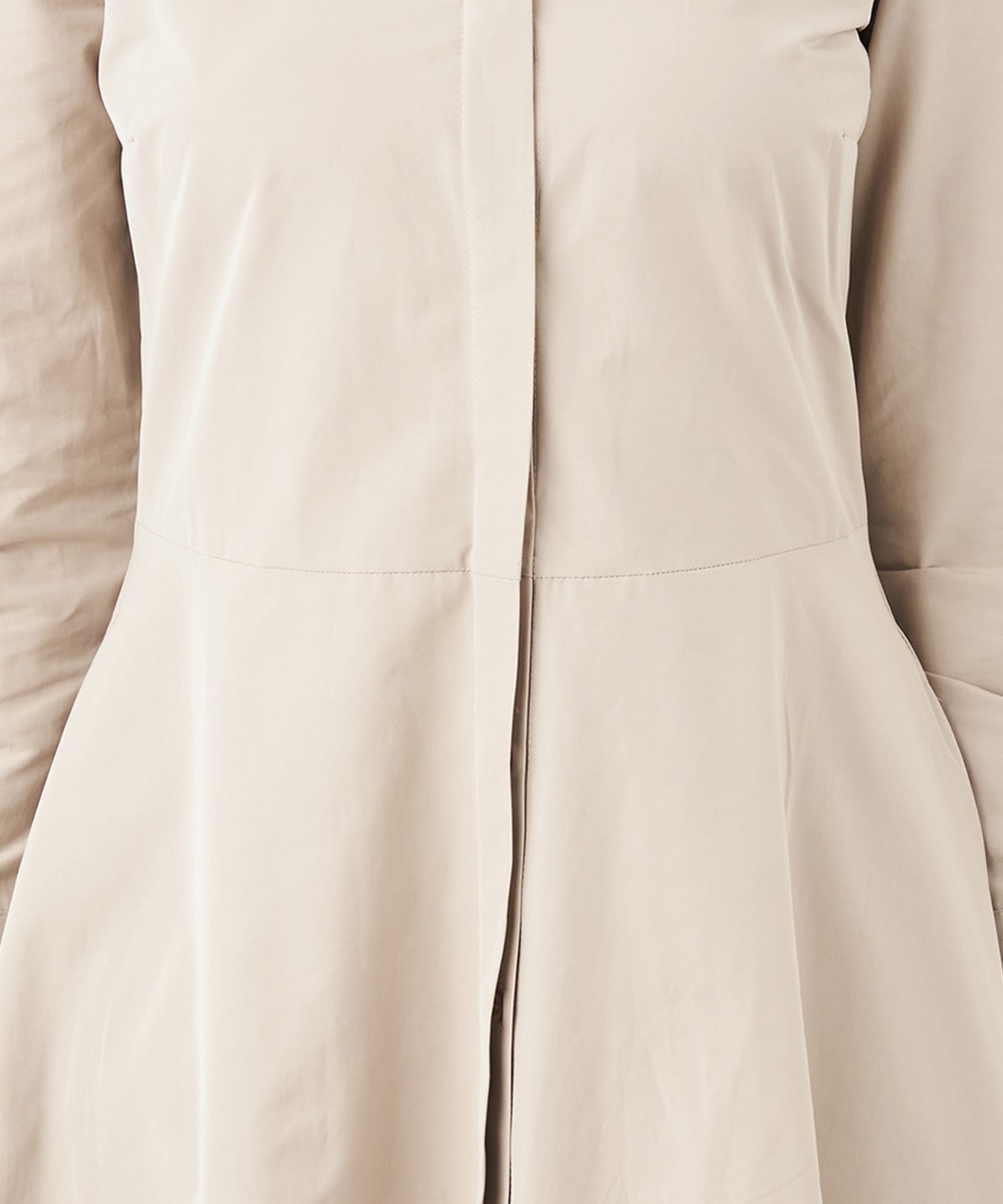 大人っぽく品良く着こなせるロング丈のデザイン。襟付きならではのシャープな印象も魅力です。同素材のリボンベルトが付属して、ウエストマークのアレンジも可能。前開き仕様で軽い羽織としても活用できます。スマートフォンなど小物の収納に便利なサイドポケット付きです。