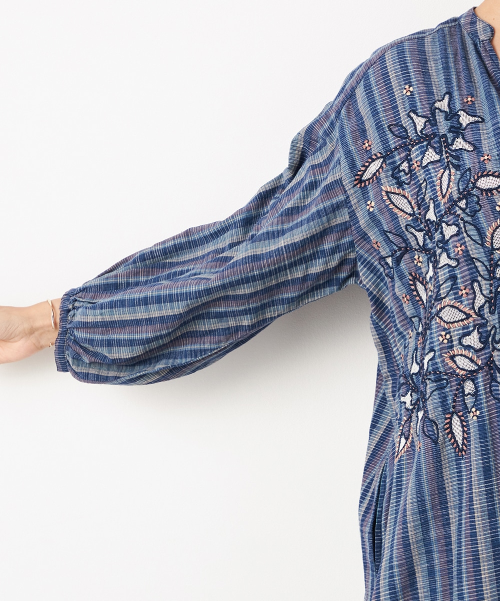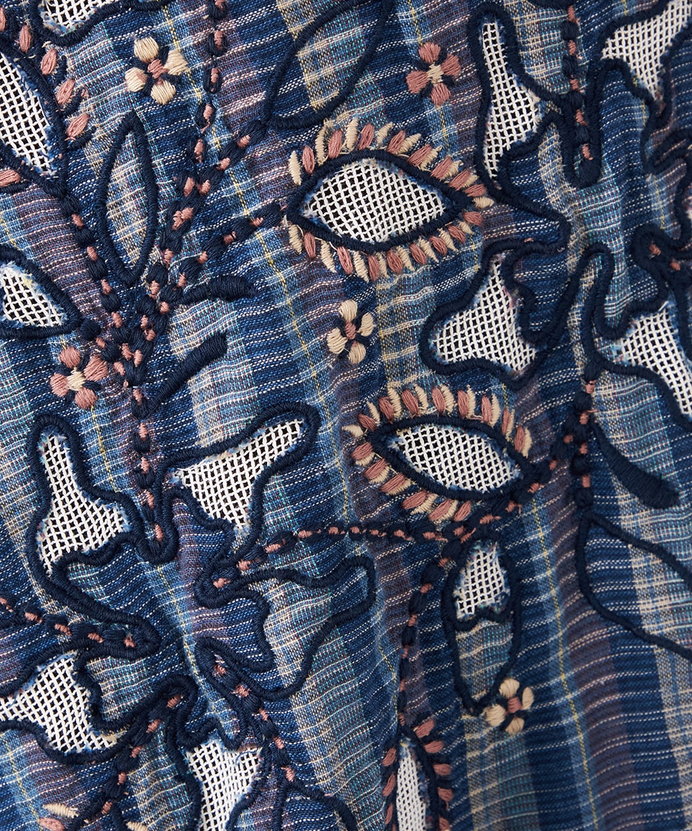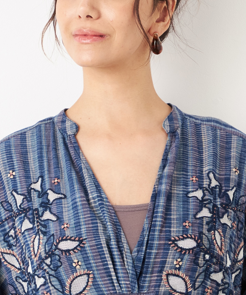 フロントには華やかな刺繍を施しています。ドロップショルダーやゆったりとしたシルエット、プチバルーンスリーブがリラックス感のポイント。裁ち切りの裾と七分袖、サイドスリットが軽やかさをプラスします。深Vネックでフェイスラインはすっきりとした印象です。スマートフォンや小物の収納に便利なサイドポケット付き。