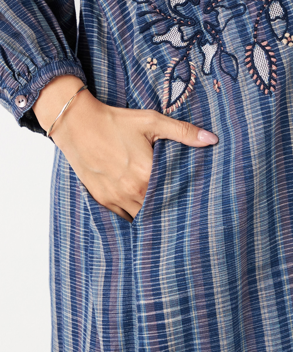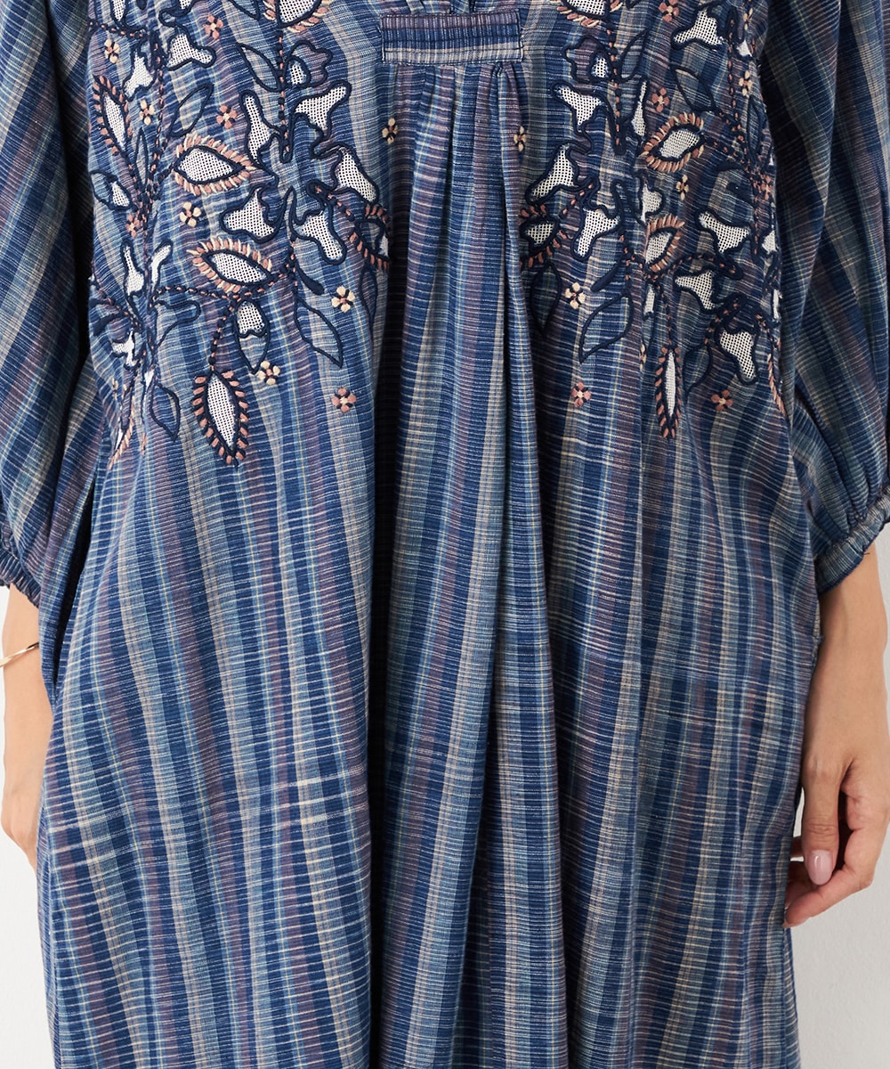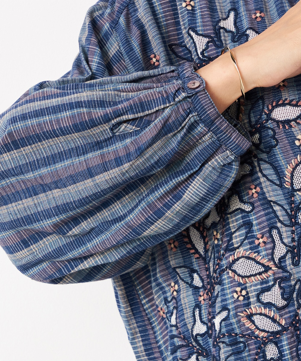 フロントには華やかな刺繍を施しています。ドロップショルダーやゆったりとしたシルエット、プチバルーンスリーブがリラックス感のポイント。裁ち切りの裾と七分袖、サイドスリットが軽やかさをプラスします。深Vネックでフェイスラインはすっきりとした印象です。スマートフォンや小物の収納に便利なサイドポケット付き。