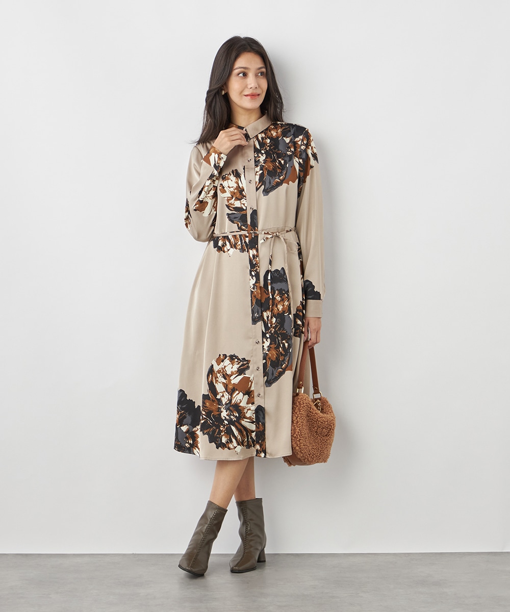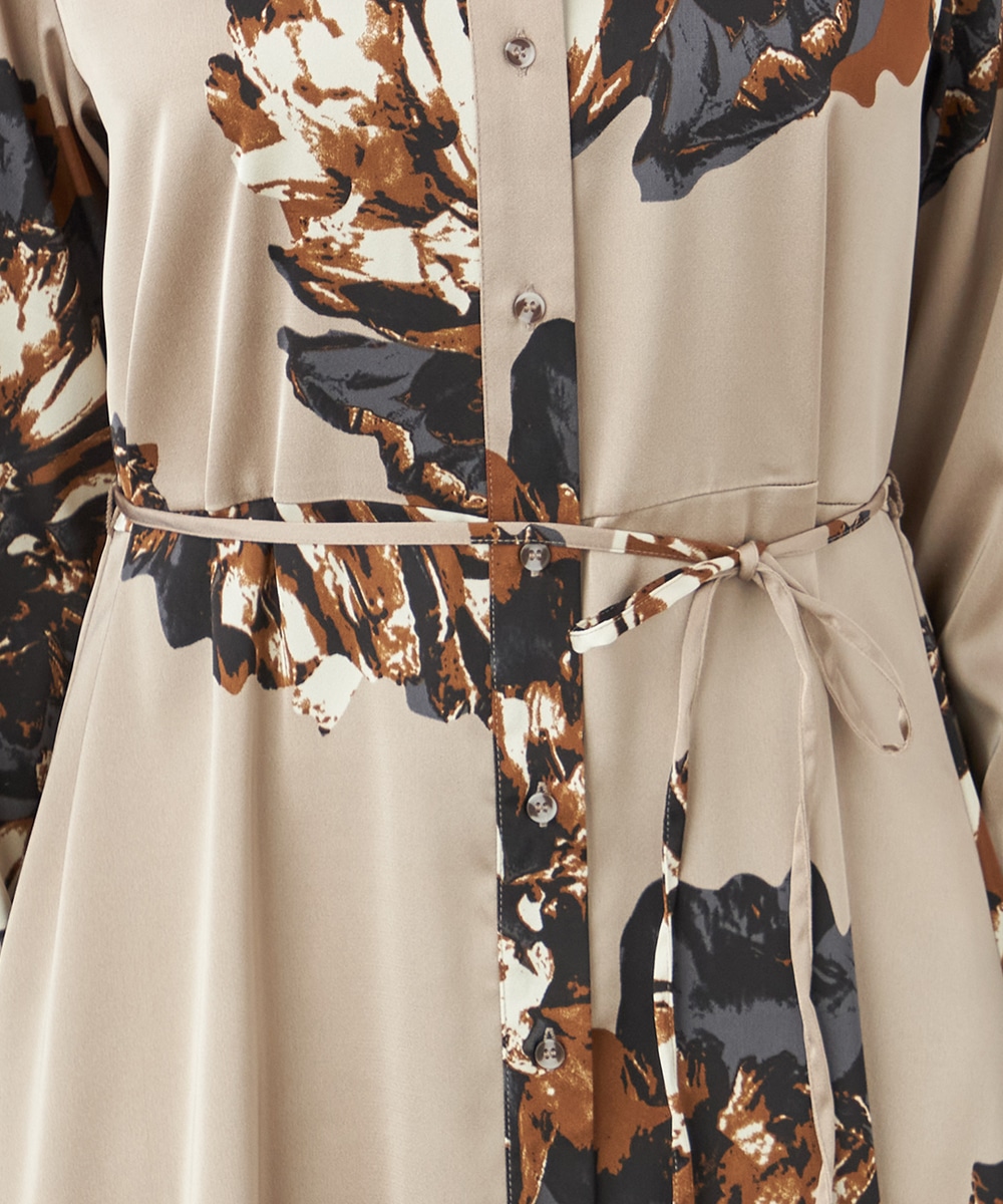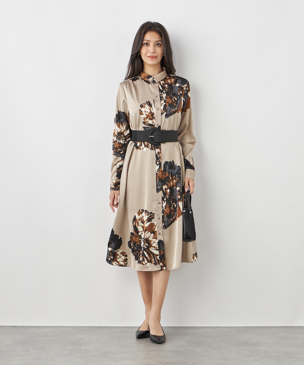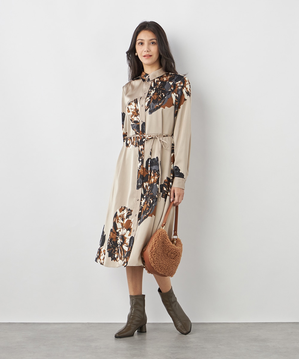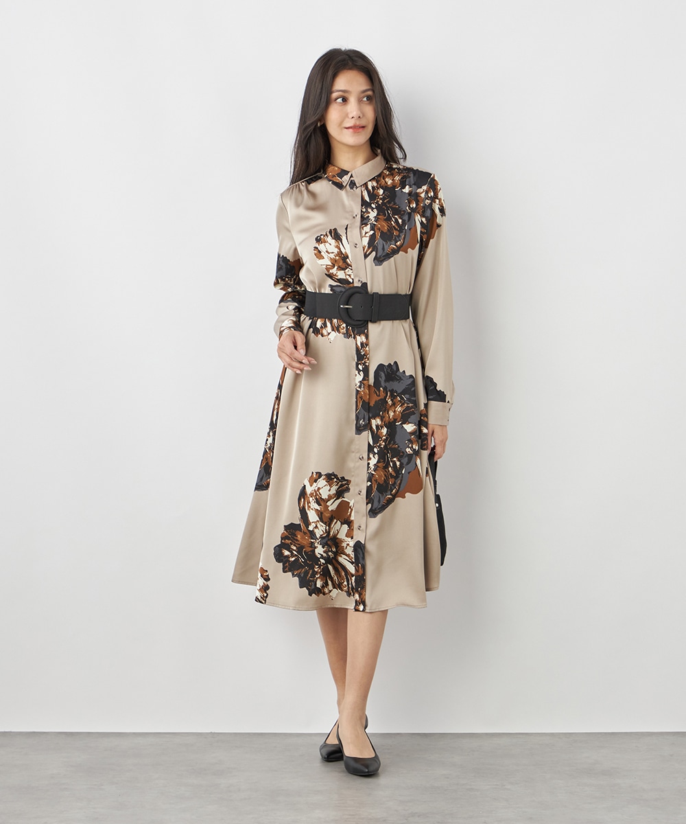 アーティスティックなタッチがモード感をプラスします。ふんわりとして適度な広がりのフレアシルエットと長めの丈が上品な印象です。センターにボタンをあしらったシャツタイプ。ウエストの切り替えがメリハリのポイントです。とろみ感のあるサテン風素材を使用しています。同素材のひもベルト付きです。