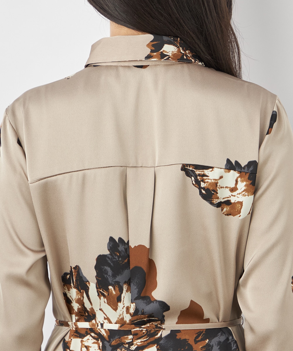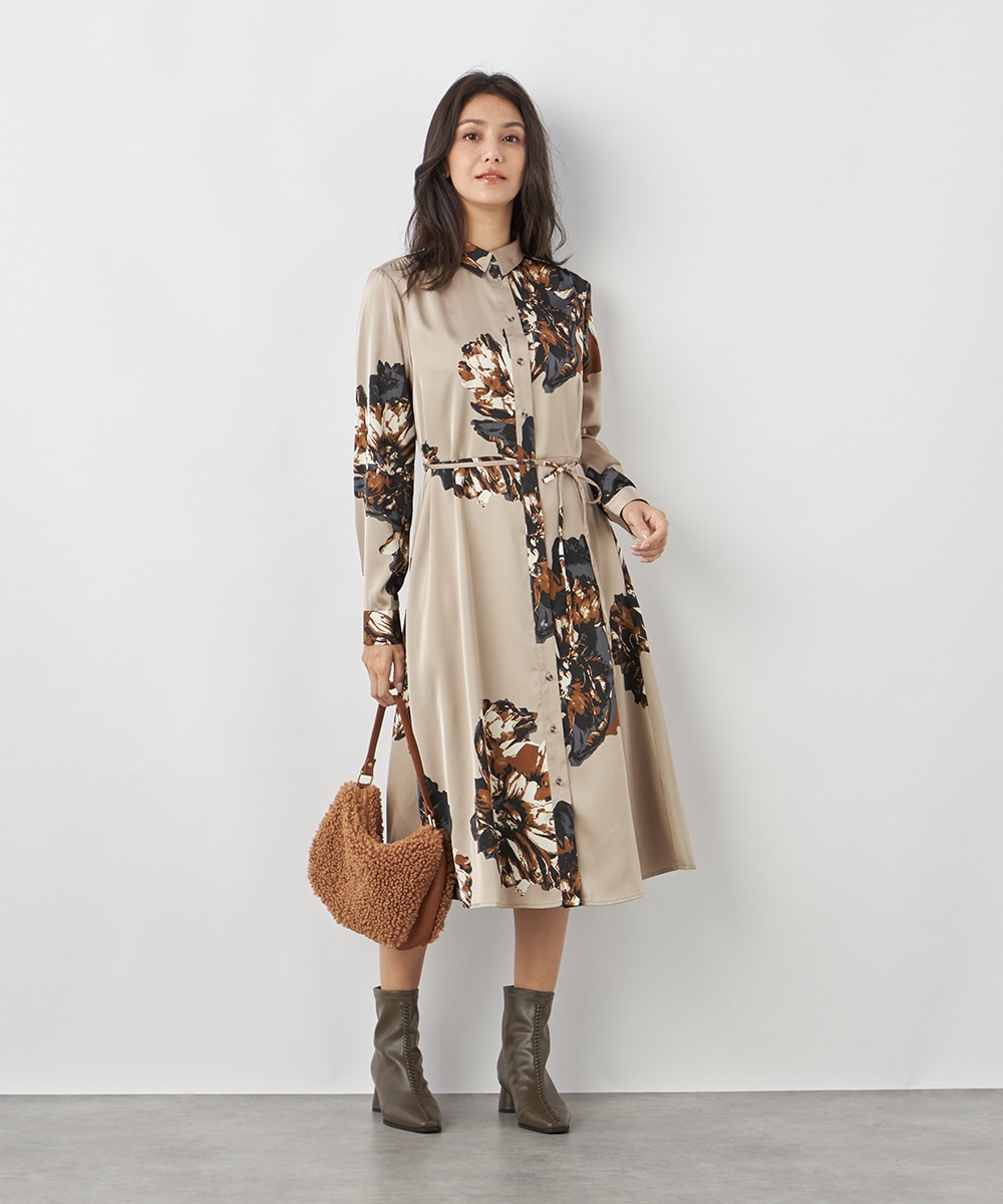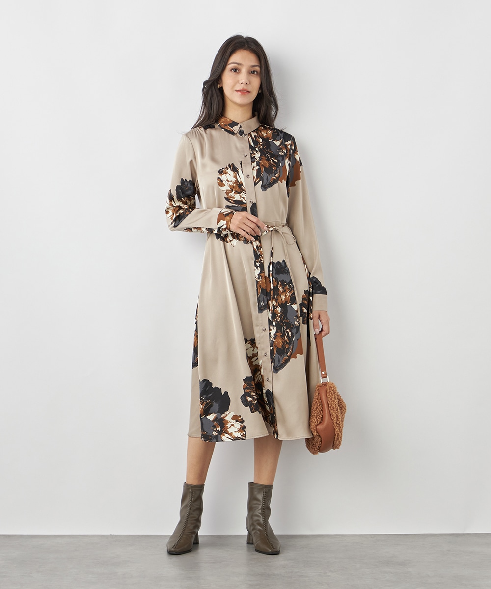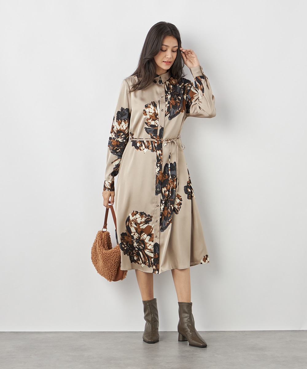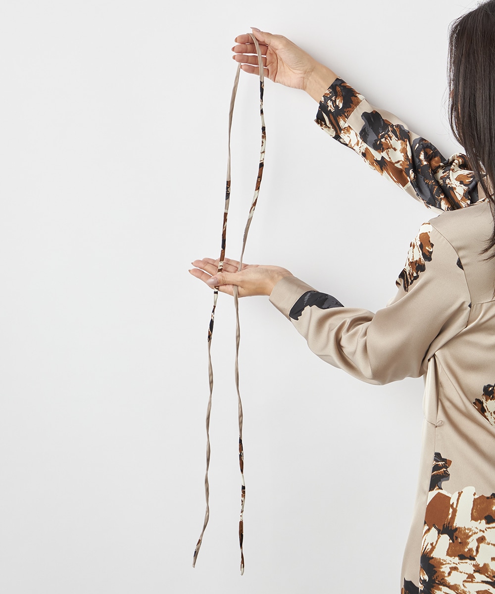 アーティスティックなタッチがモード感をプラスします。ふんわりとして適度な広がりのフレアシルエットと長めの丈が上品な印象です。センターにボタンをあしらったシャツタイプ。ウエストの切り替えがメリハリのポイントです。とろみ感のあるサテン風素材を使用しています。同素材のひもベルト付きです。