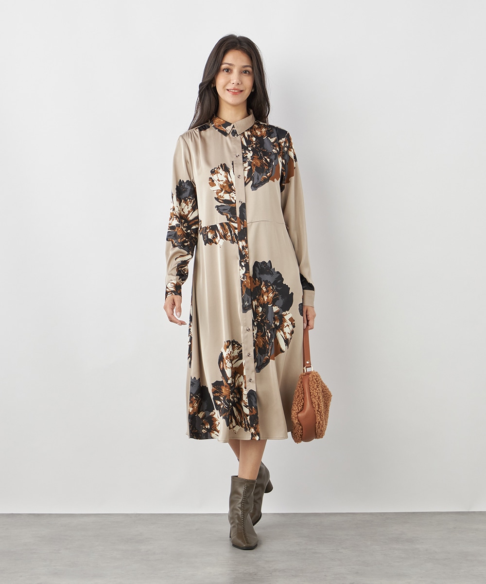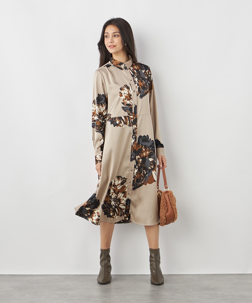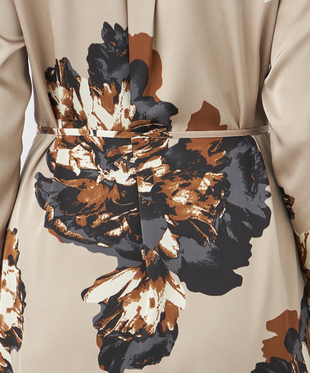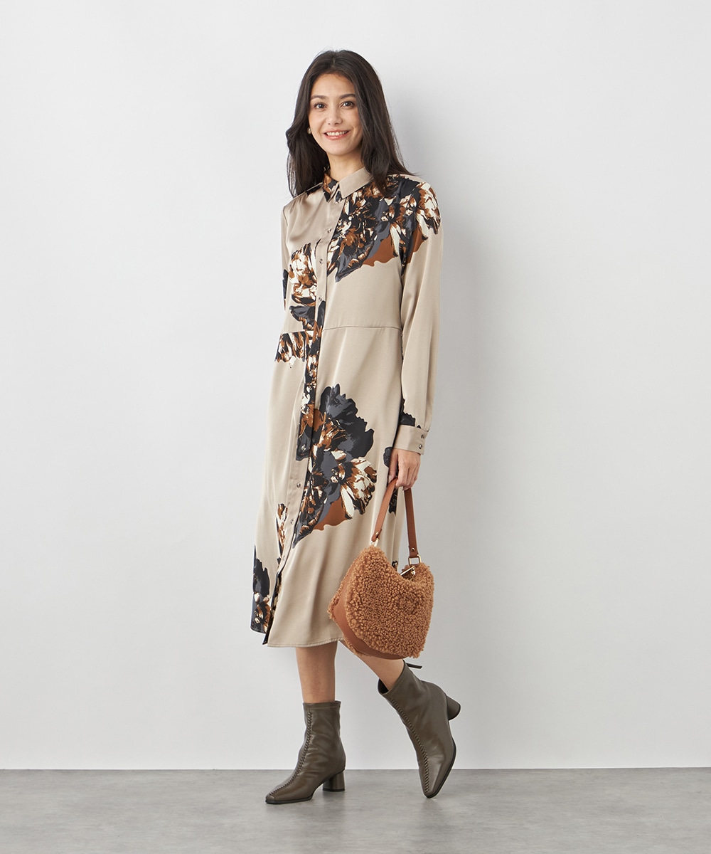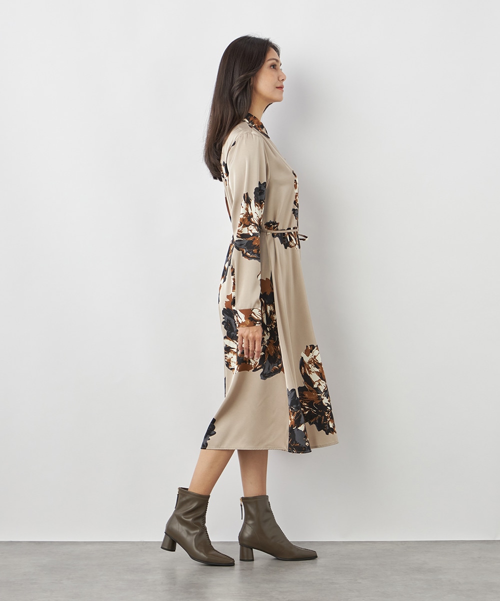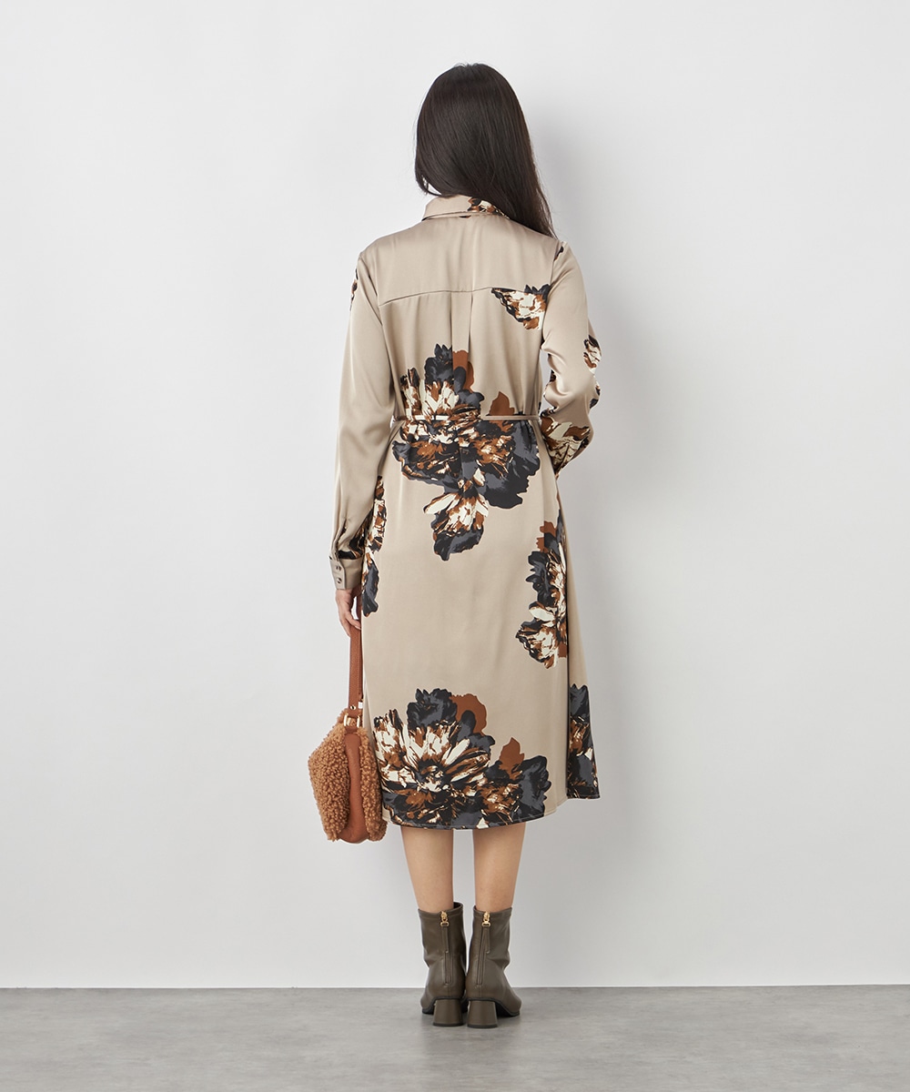 アーティスティックなタッチがモード感をプラスします。ふんわりとして適度な広がりのフレアシルエットと長めの丈が上品な印象です。センターにボタンをあしらったシャツタイプ。ウエストの切り替えがメリハリのポイントです。とろみ感のあるサテン風素材を使用しています。同素材のひもベルト付きです。