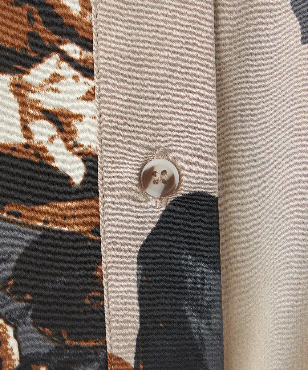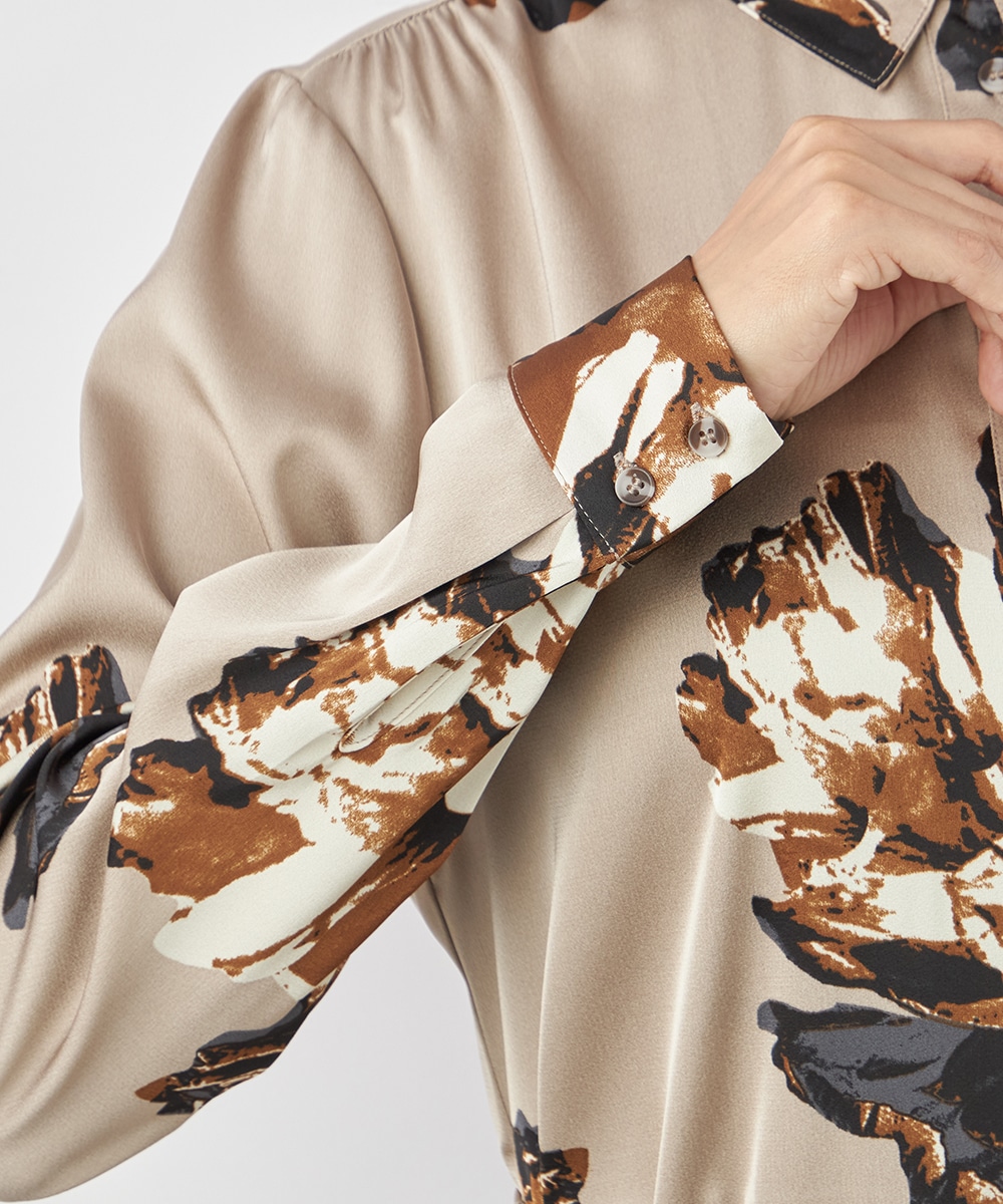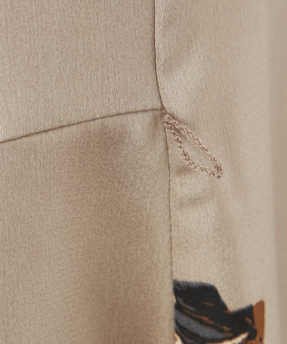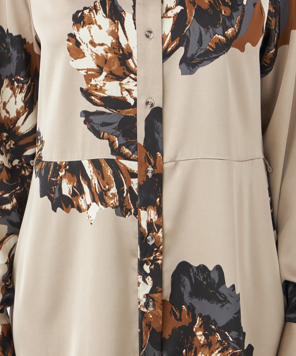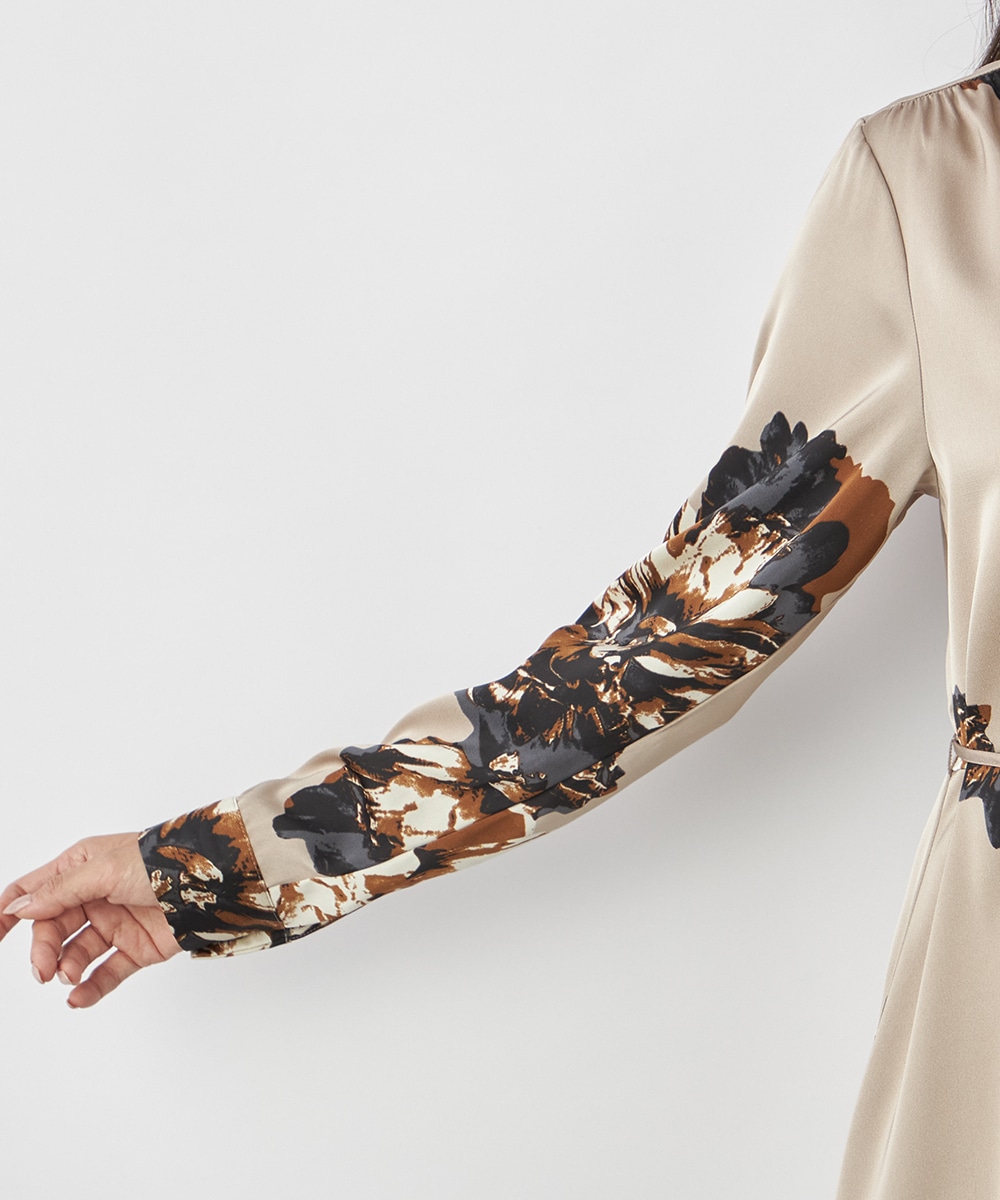 アーティスティックなタッチがモード感をプラスします。ふんわりとして適度な広がりのフレアシルエットと長めの丈が上品な印象です。センターにボタンをあしらったシャツタイプ。ウエストの切り替えがメリハリのポイントです。とろみ感のあるサテン風素材を使用しています。同素材のひもベルト付きです。