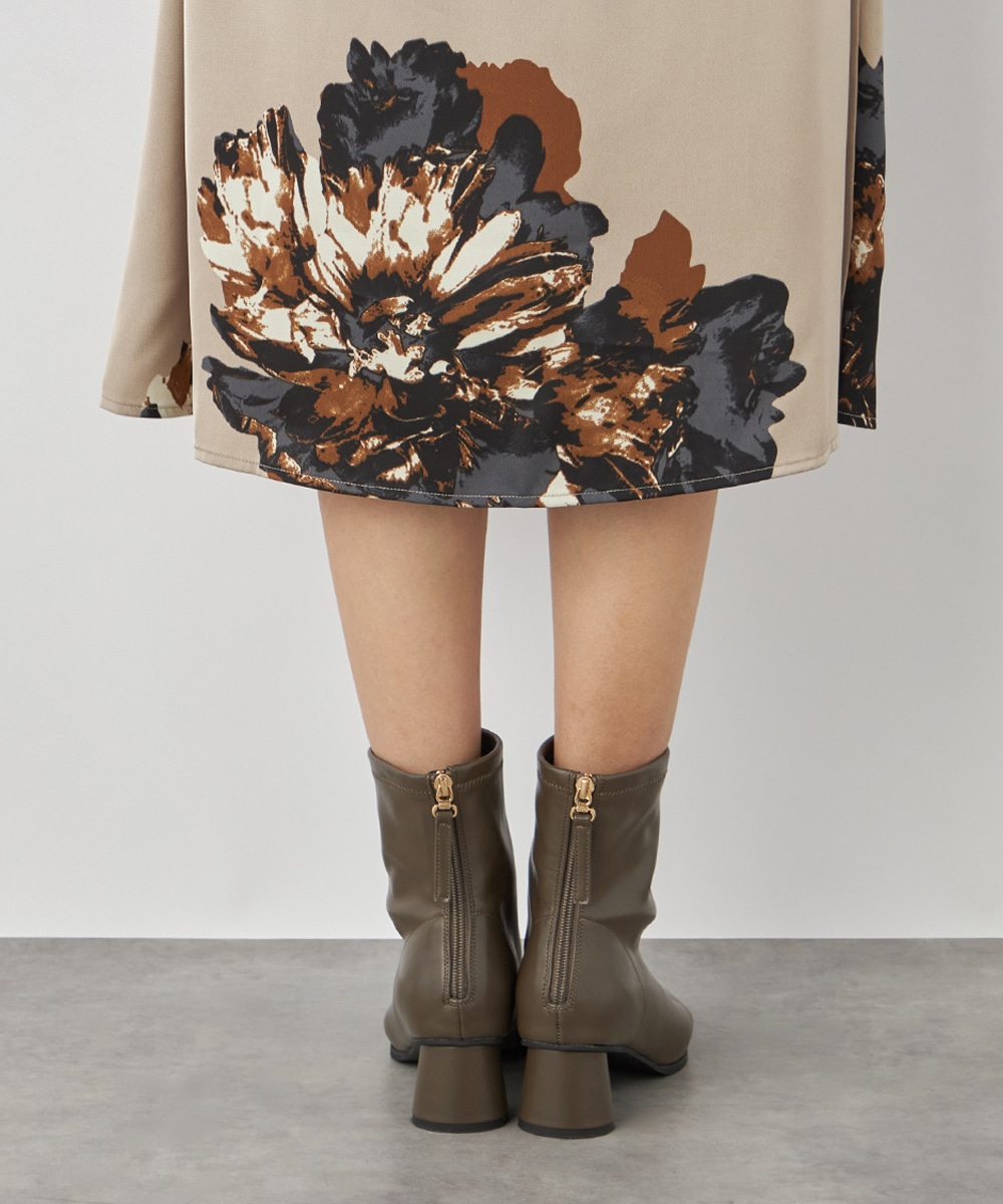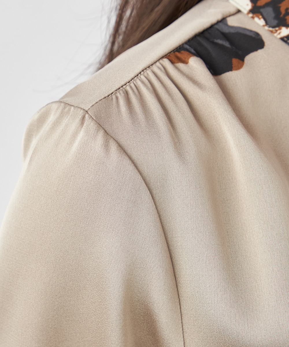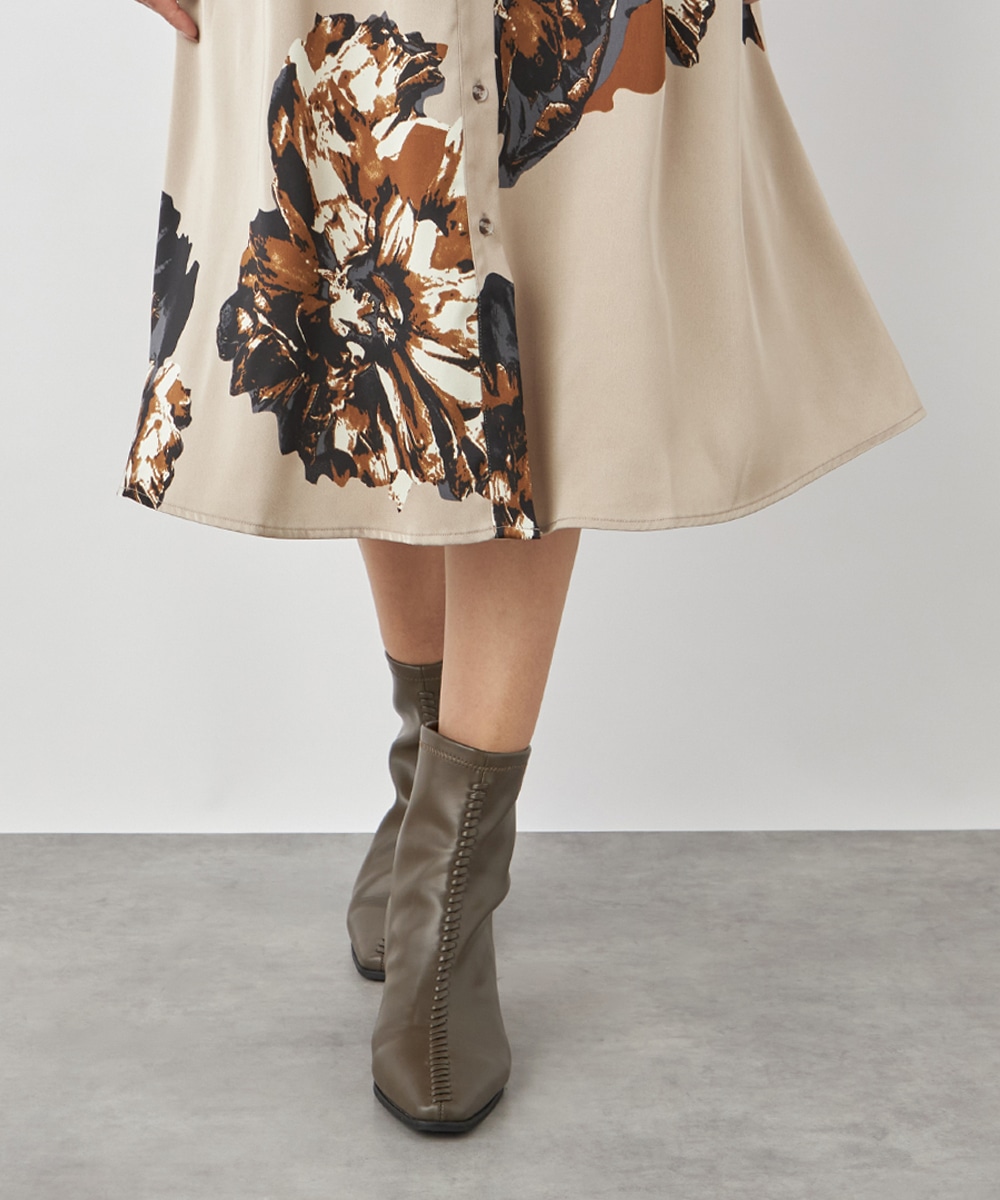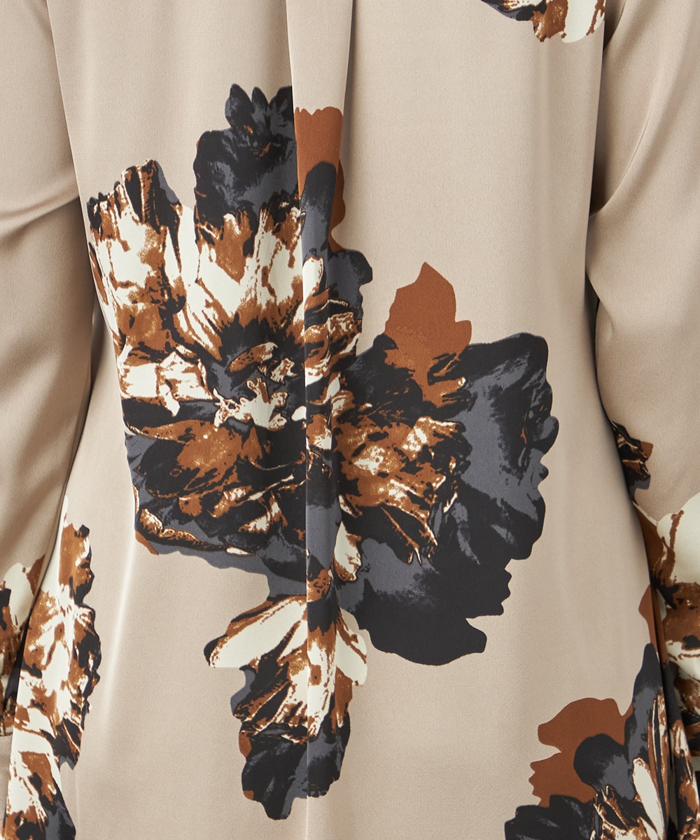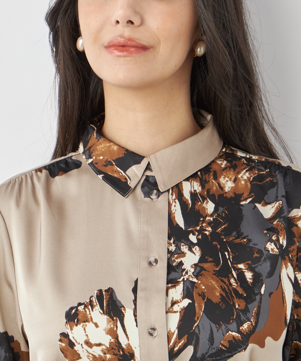 アーティスティックなタッチがモード感をプラスします。ふんわりとして適度な広がりのフレアシルエットと長めの丈が上品な印象です。センターにボタンをあしらったシャツタイプ。ウエストの切り替えがメリハリのポイントです。とろみ感のあるサテン風素材を使用しています。同素材のひもベルト付きです。