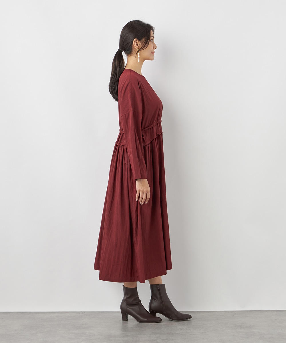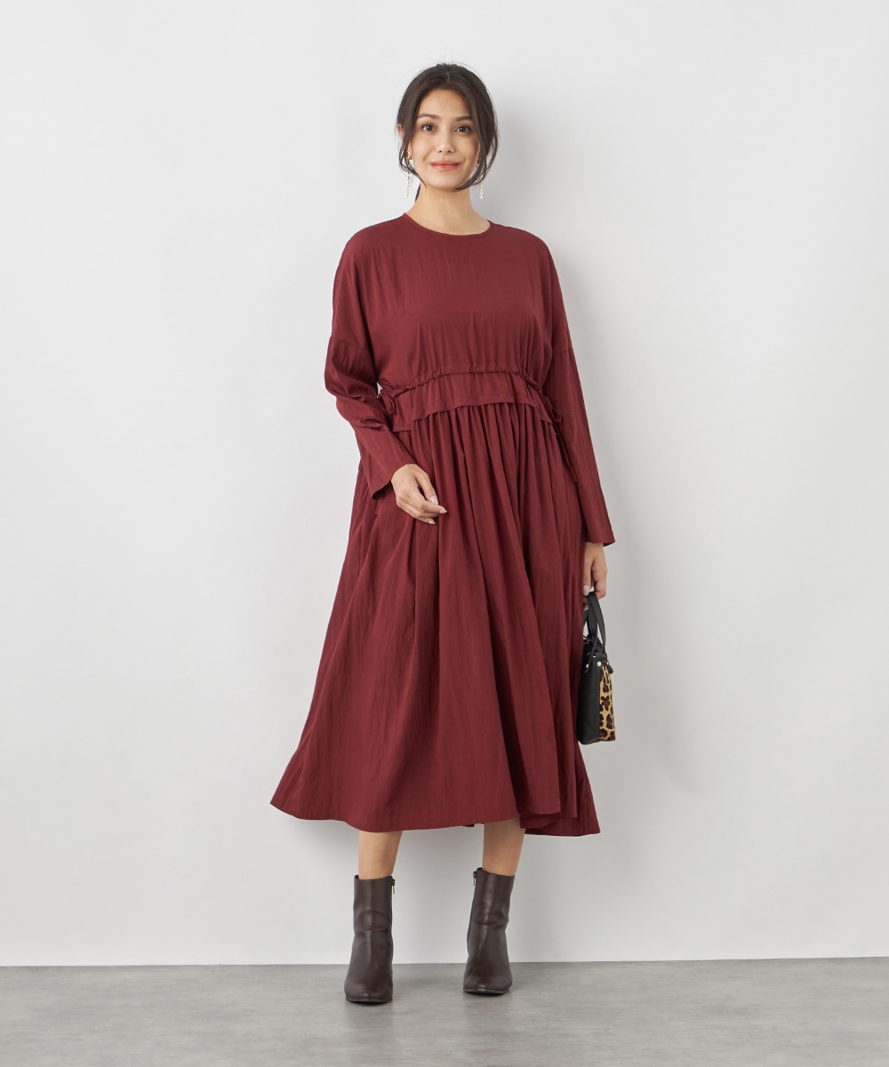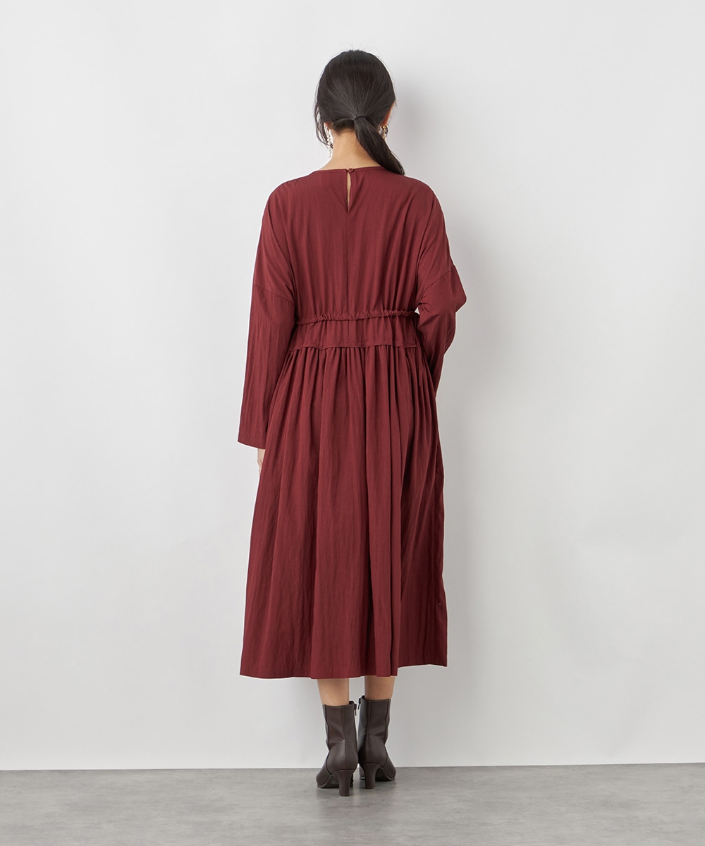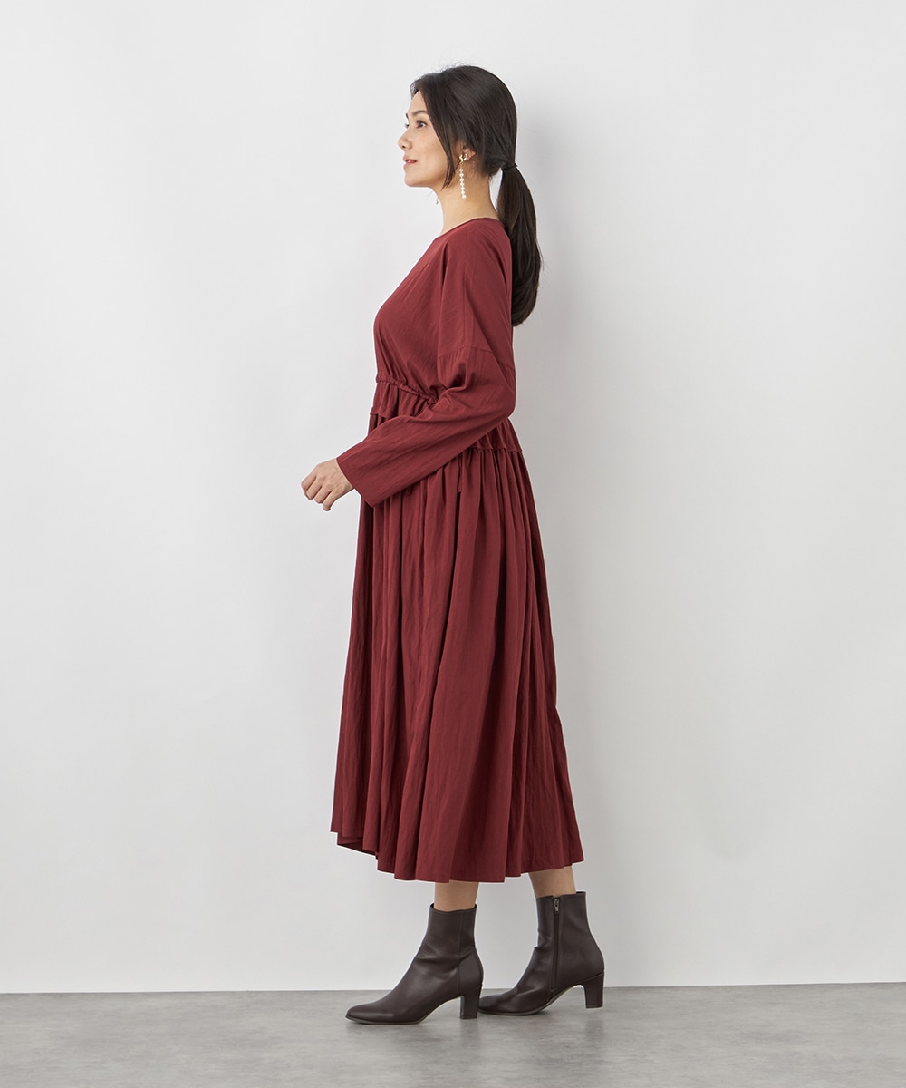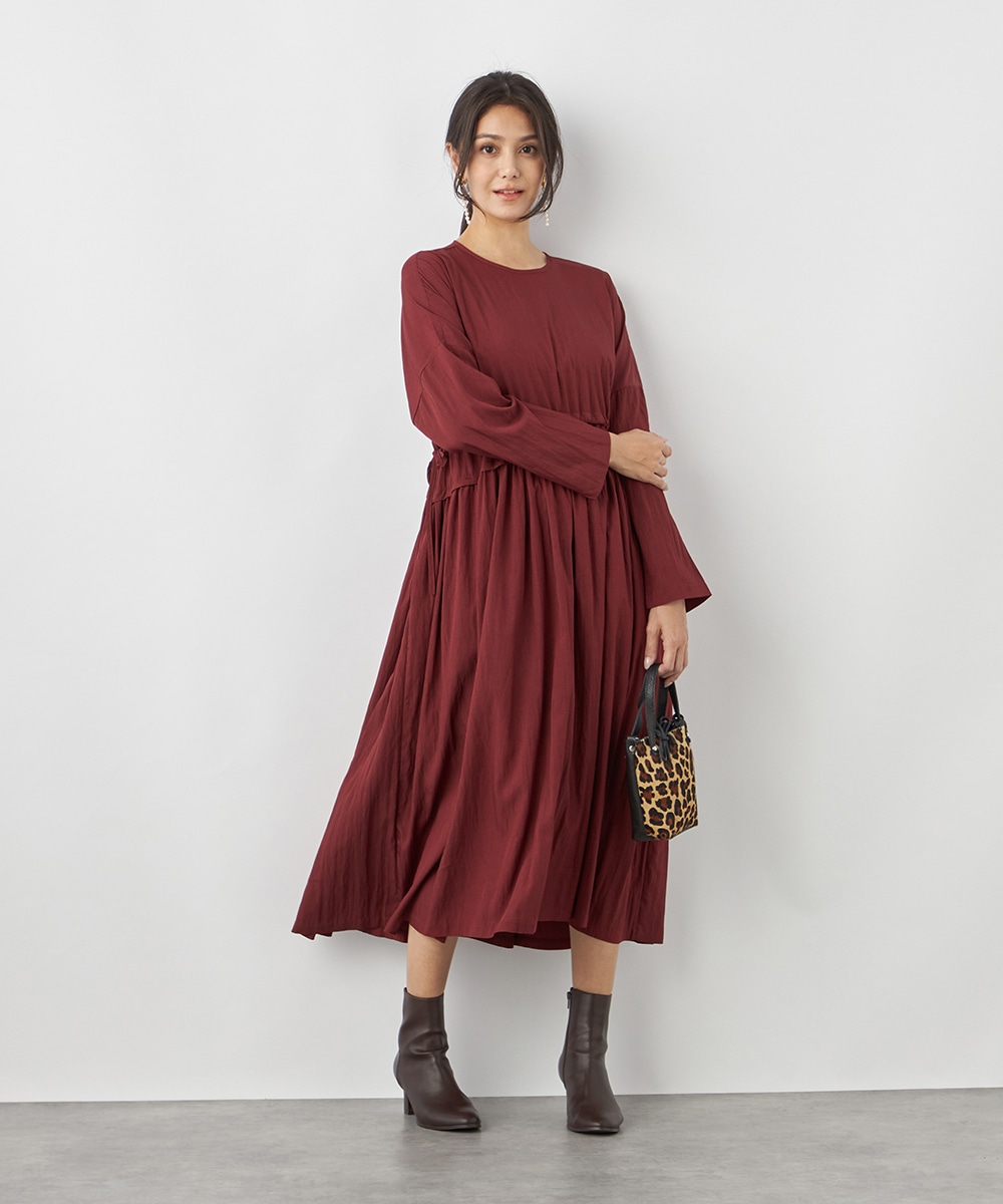 今年らしさ十分のボルドーのカラーです。タックが施されたフレアシルエットやウエストの両サイドで結ぶリボンがキュートな印象。絞り具合によってアレンジも可能です。バックネックのキーホールがアクセントとしても効いています。大人っぽく上品に着こなせるロング丈のデザインです。