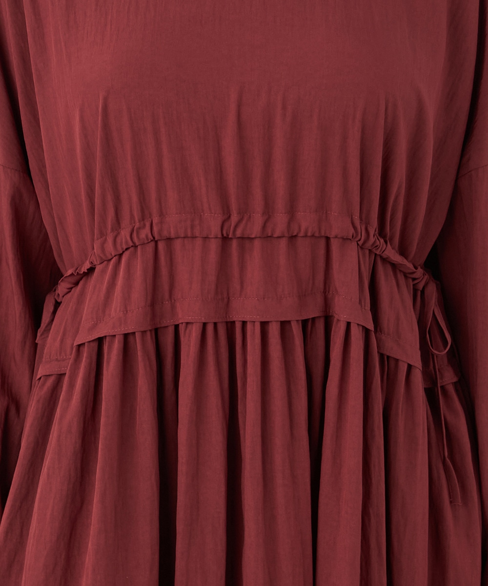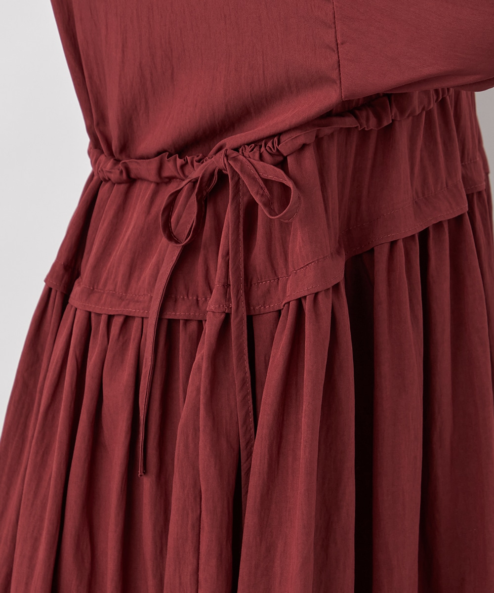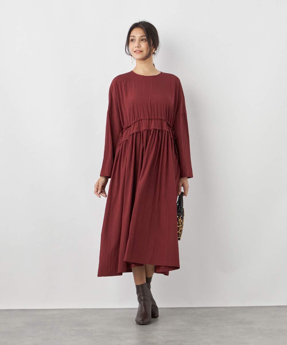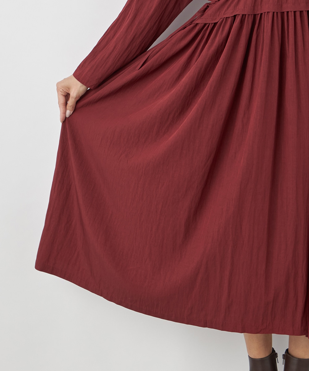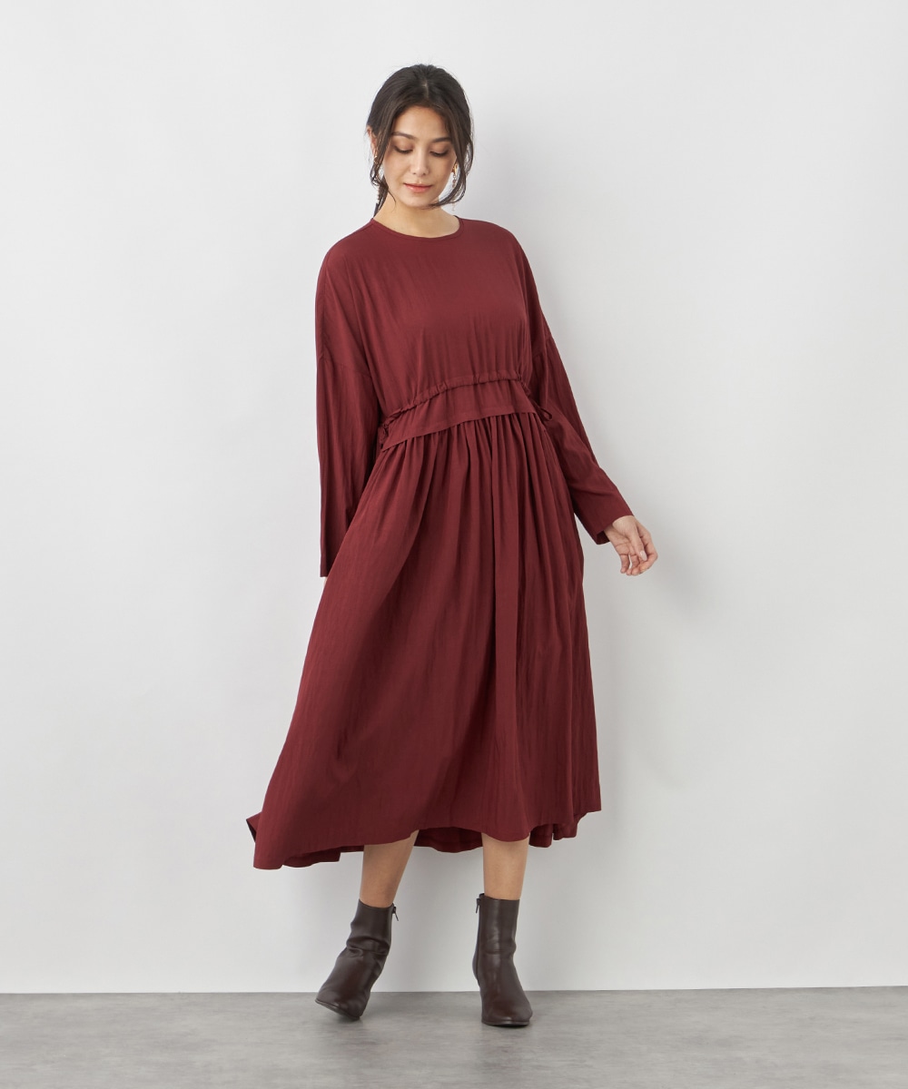 今年らしさ十分のボルドーのカラーです。タックが施されたフレアシルエットやウエストの両サイドで結ぶリボンがキュートな印象。絞り具合によってアレンジも可能です。バックネックのキーホールがアクセントとしても効いています。大人っぽく上品に着こなせるロング丈のデザインです。