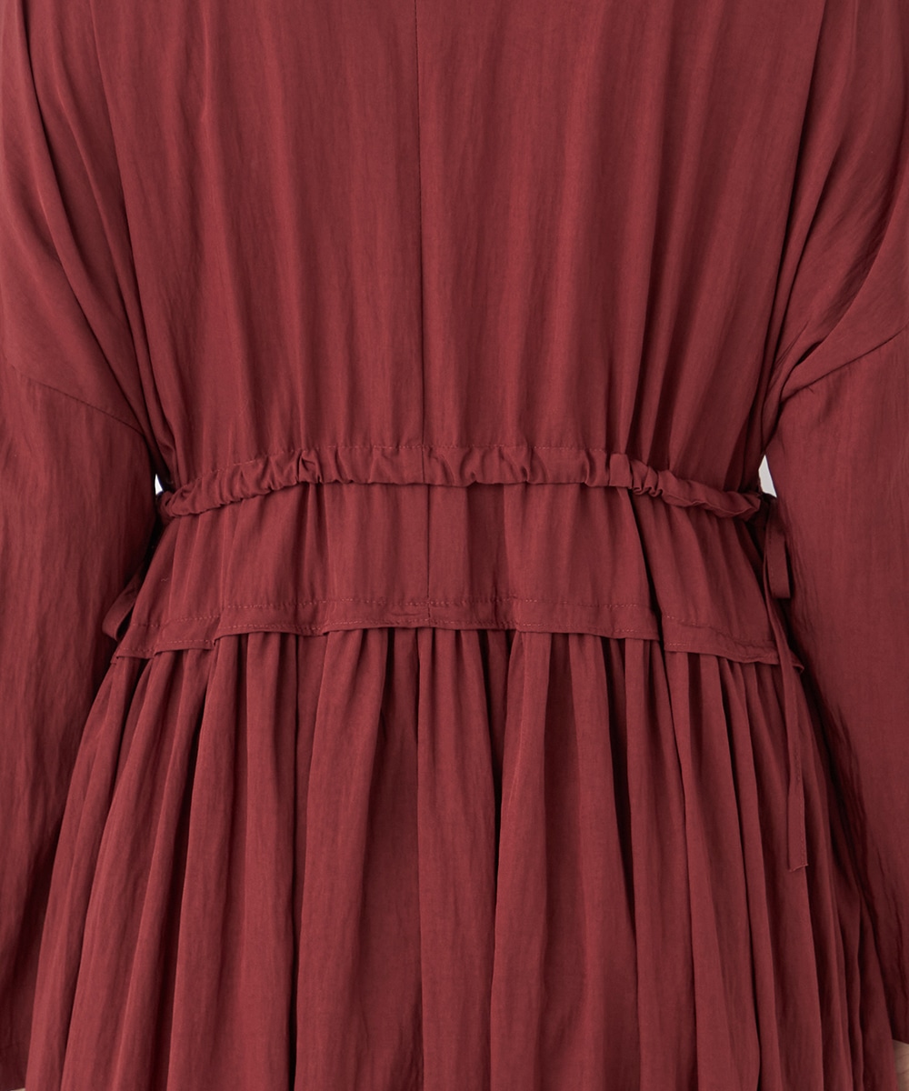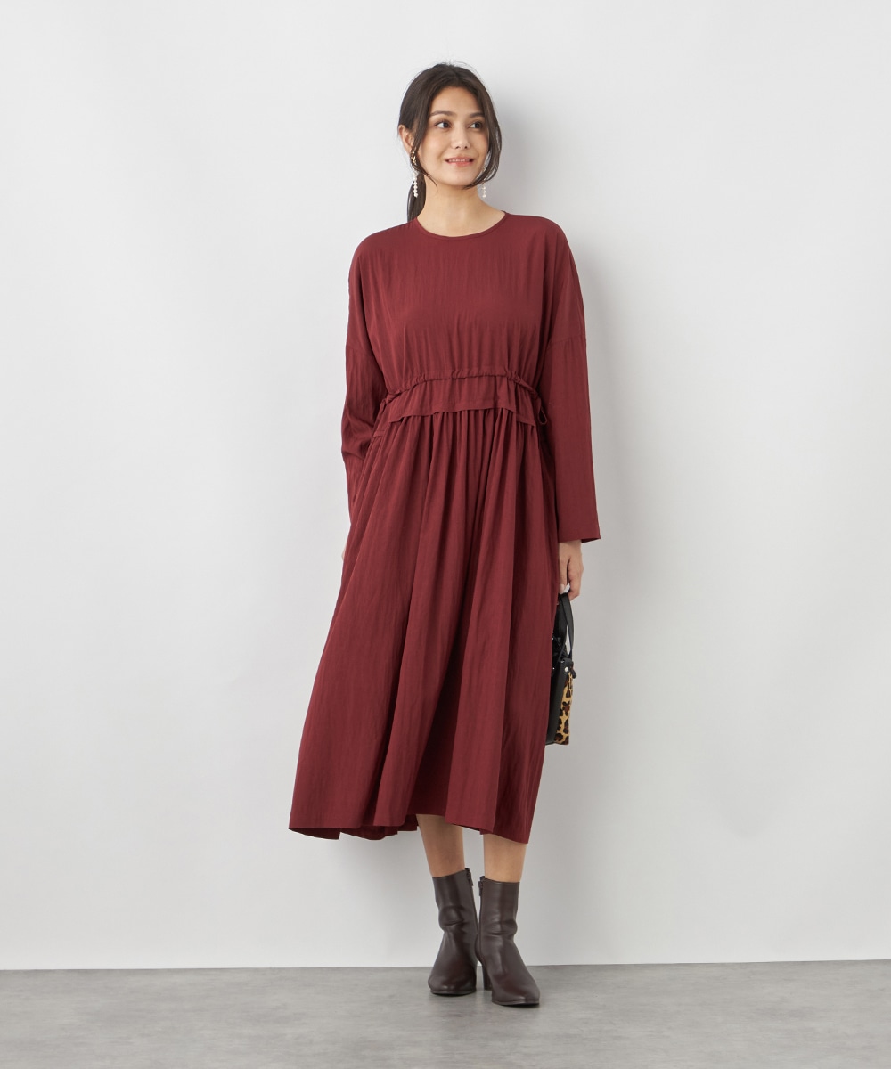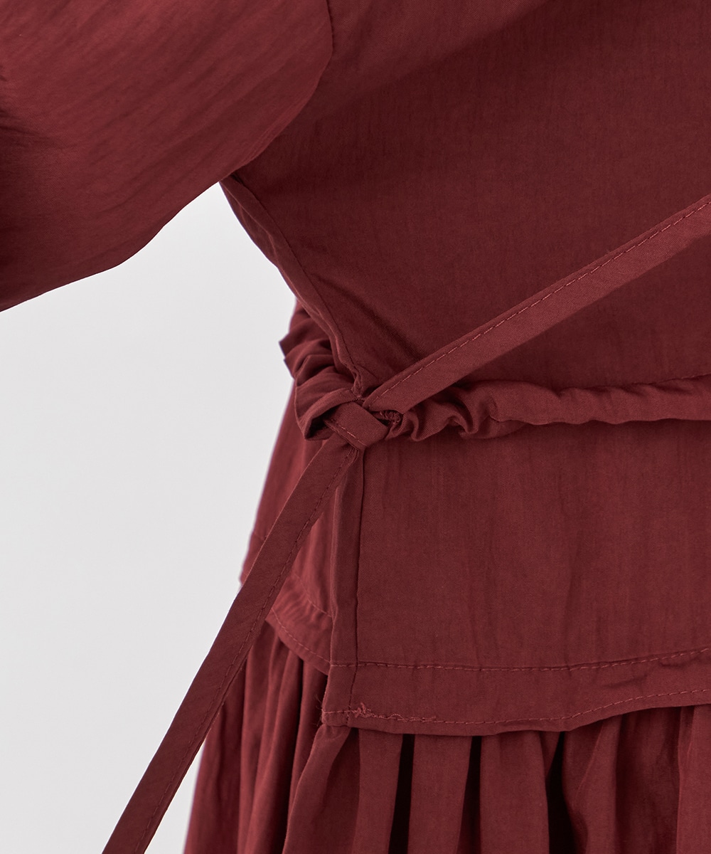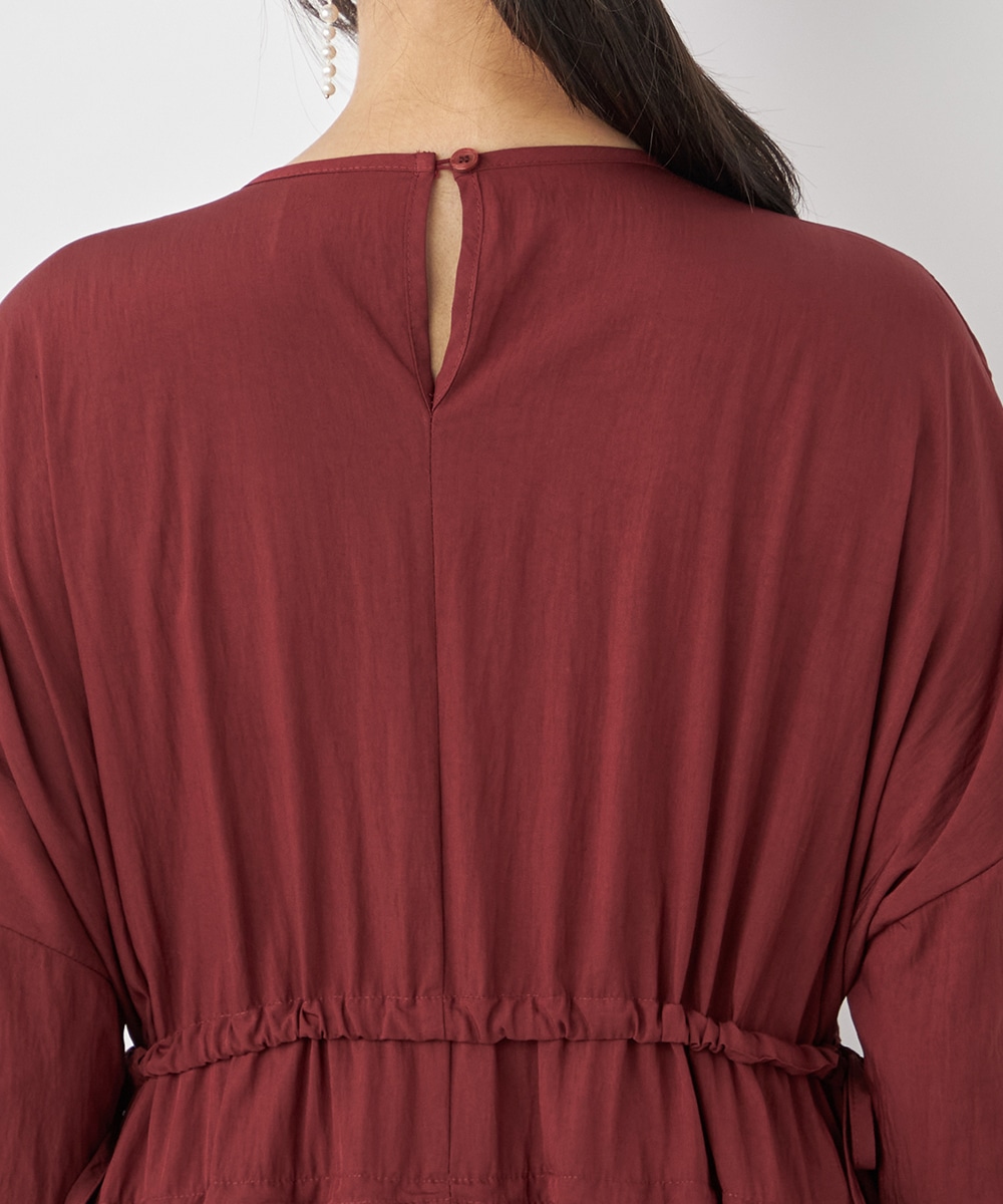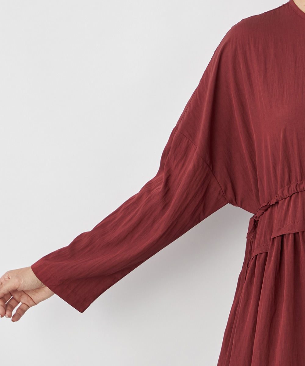 今年らしさ十分のボルドーのカラーです。タックが施されたフレアシルエットやウエストの両サイドで結ぶリボンがキュートな印象。絞り具合によってアレンジも可能です。バックネックのキーホールがアクセントとしても効いています。大人っぽく上品に着こなせるロング丈のデザインです。