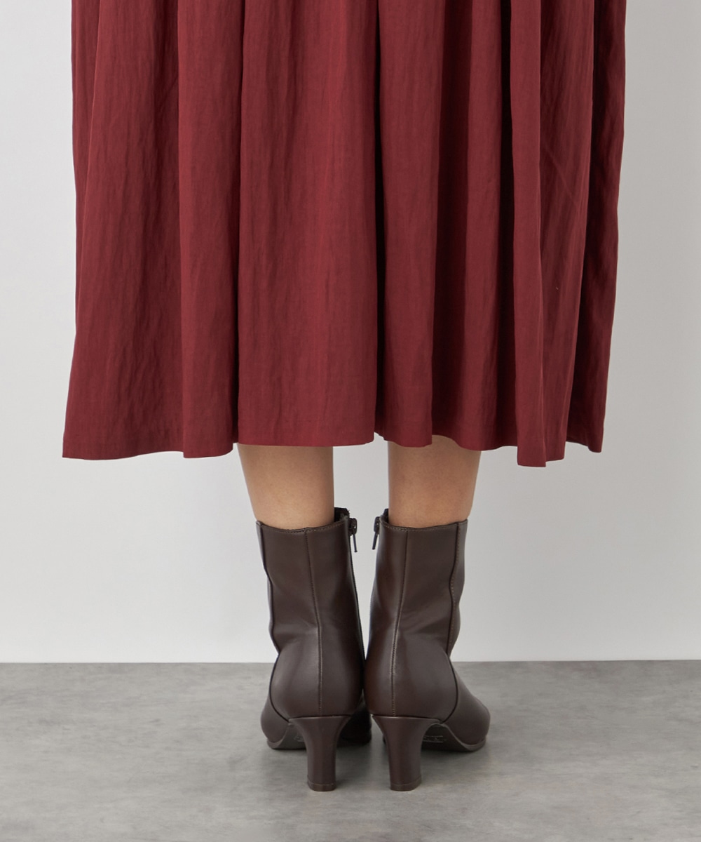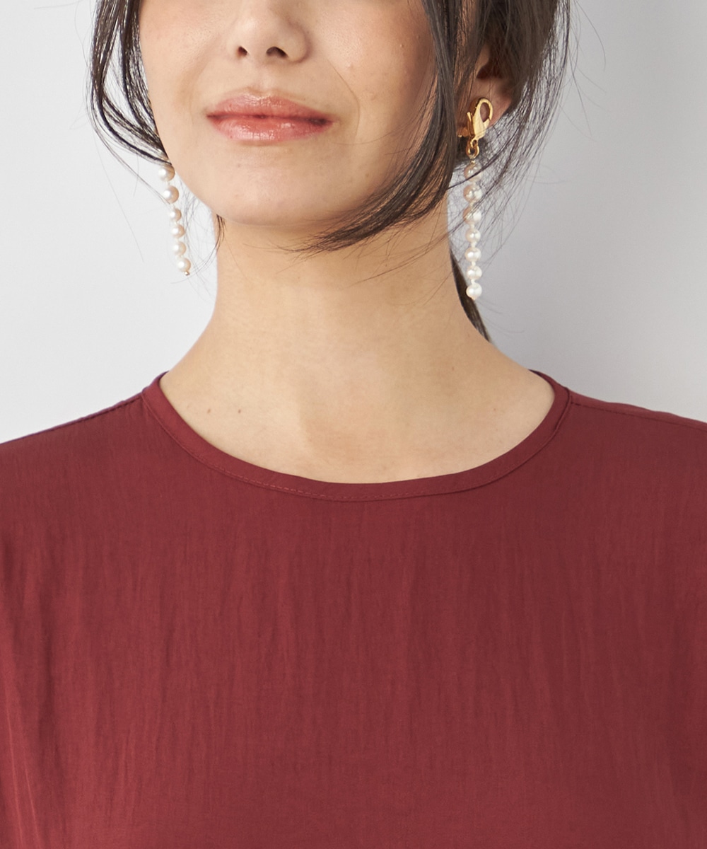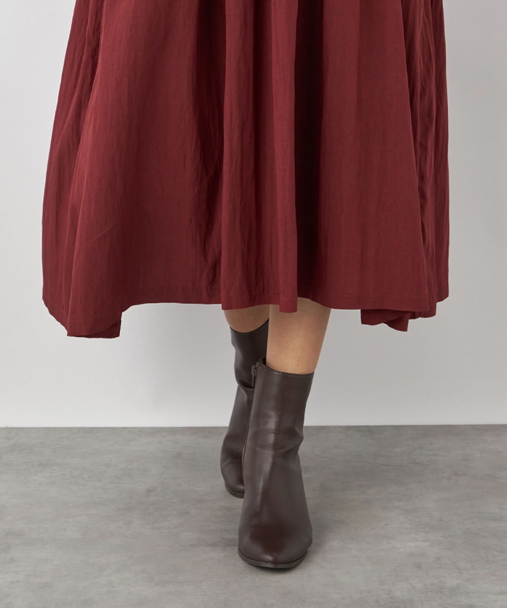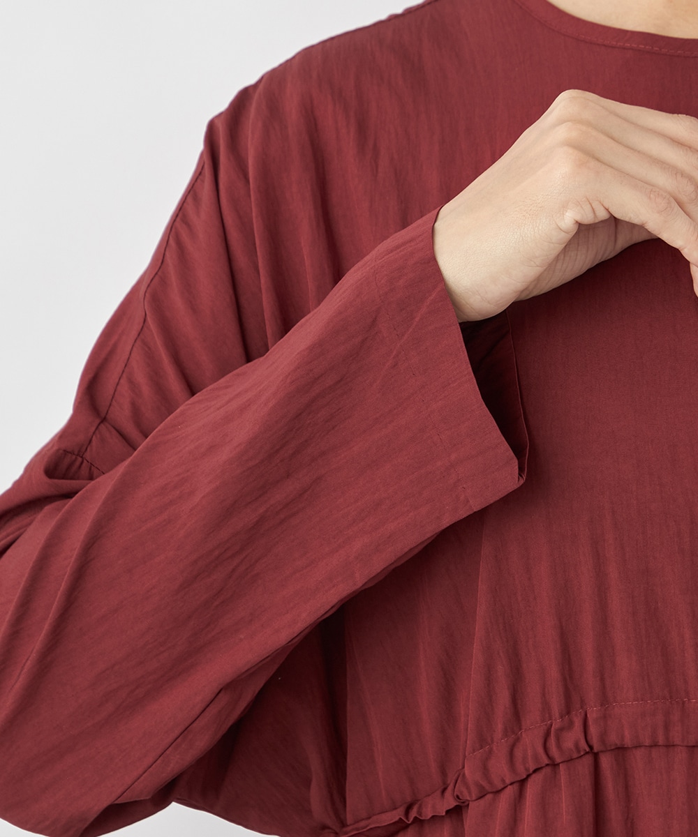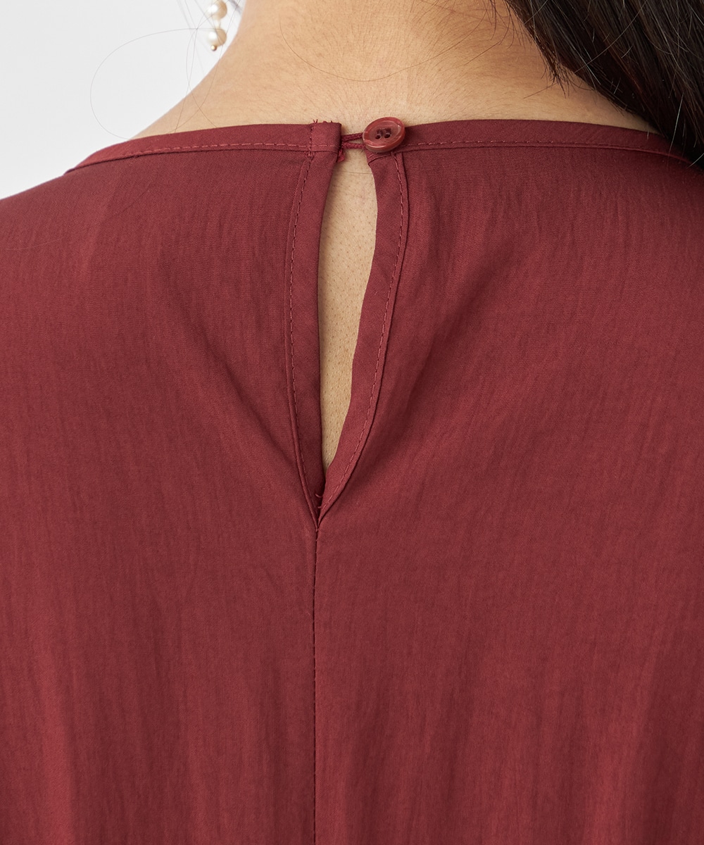 今年らしさ十分のボルドーのカラーです。タックが施されたフレアシルエットやウエストの両サイドで結ぶリボンがキュートな印象。絞り具合によってアレンジも可能です。バックネックのキーホールがアクセントとしても効いています。大人っぽく上品に着こなせるロング丈のデザインです。