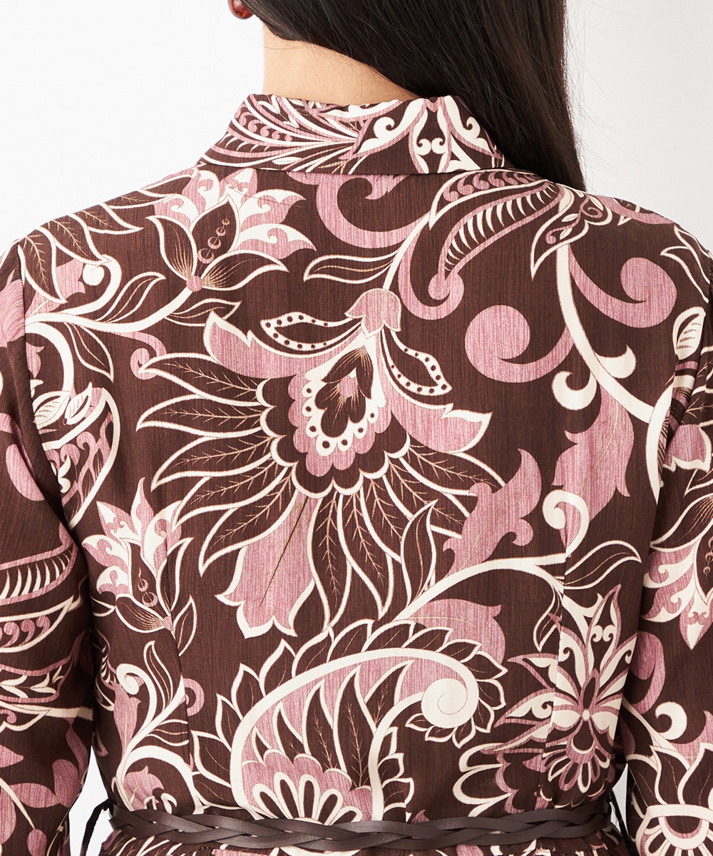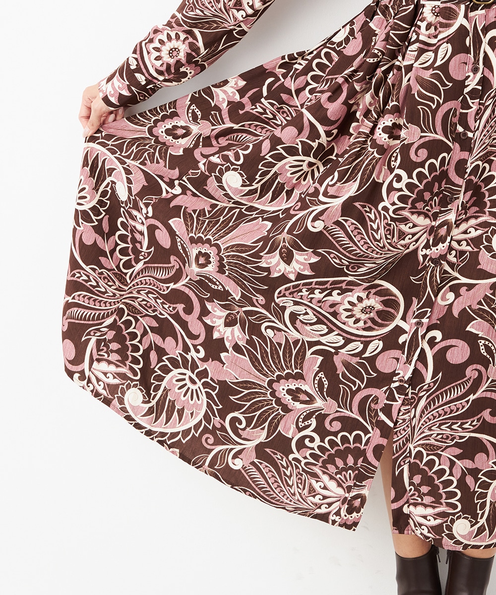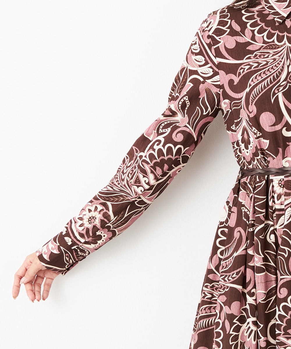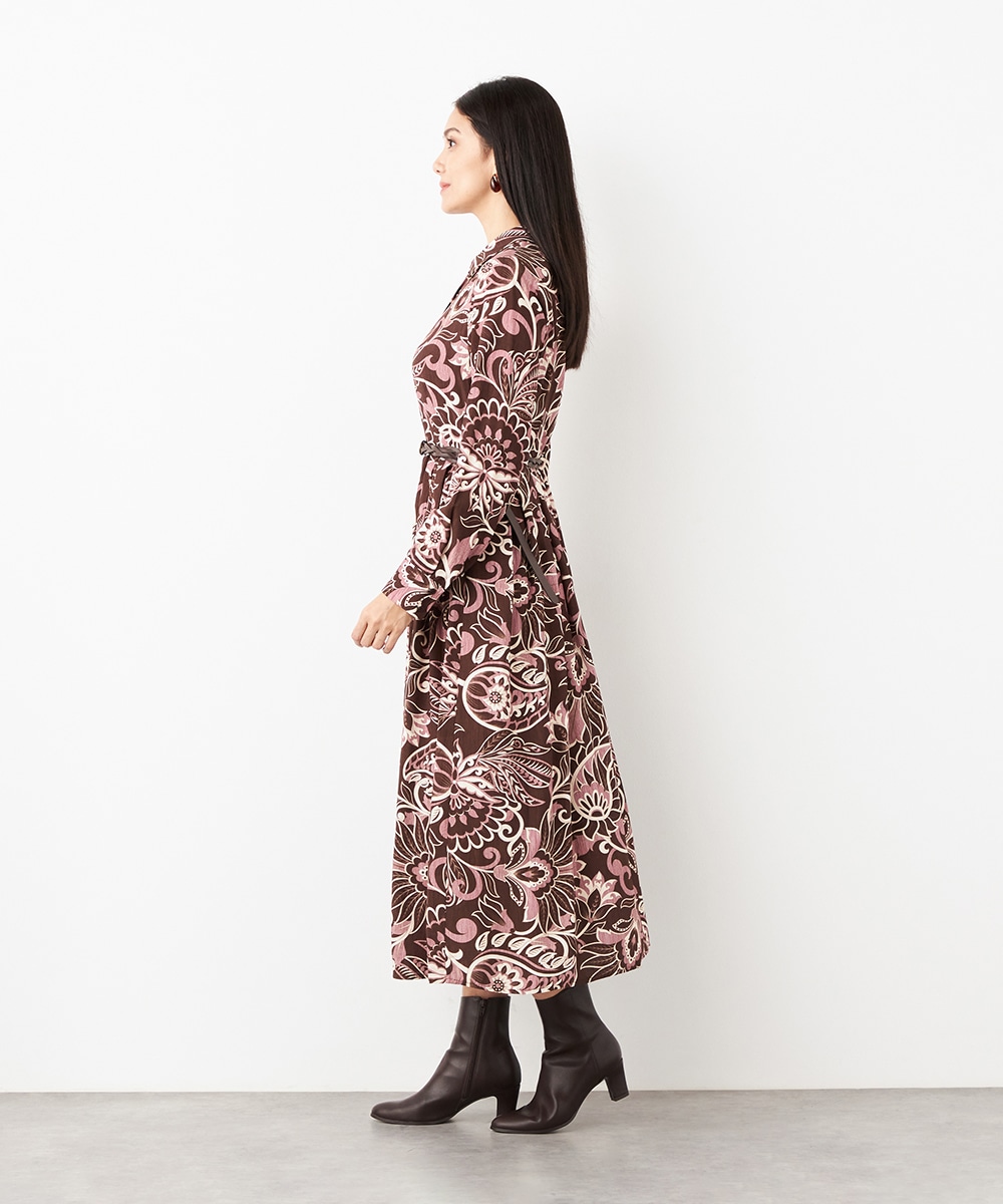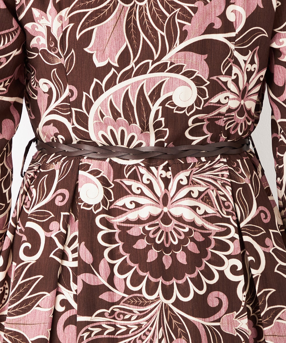 エスニックな雰囲気あふれるペイズリー柄を大ぶりに描き、より華やかに仕上げました。ウエストに施された切り替えが、スタイルのメリハリをさりげなく演出します。羽織として活用するのもおすすめのアレンジです。ウエストマークに便利な細幅のメッシュベルトが付属しています。