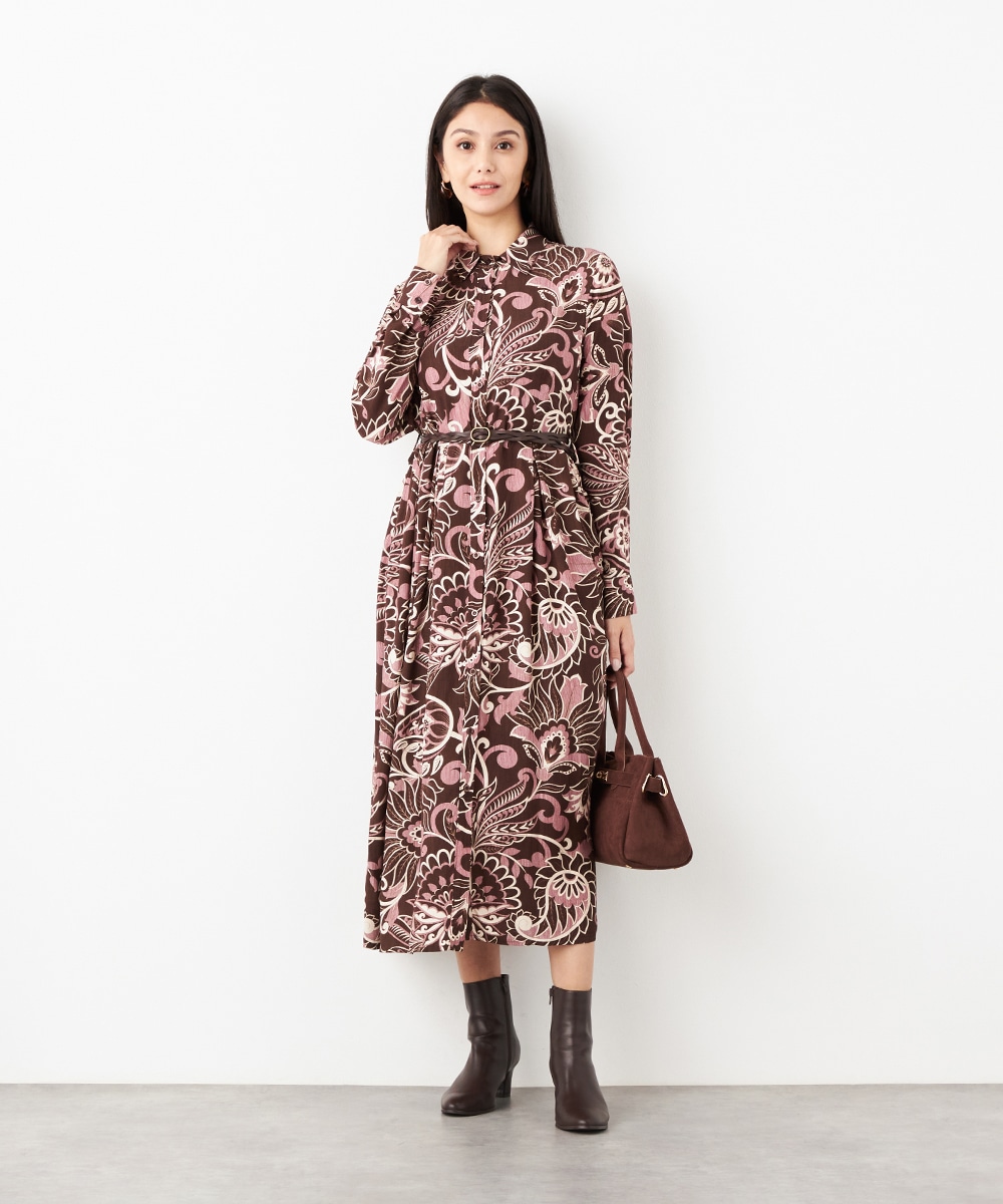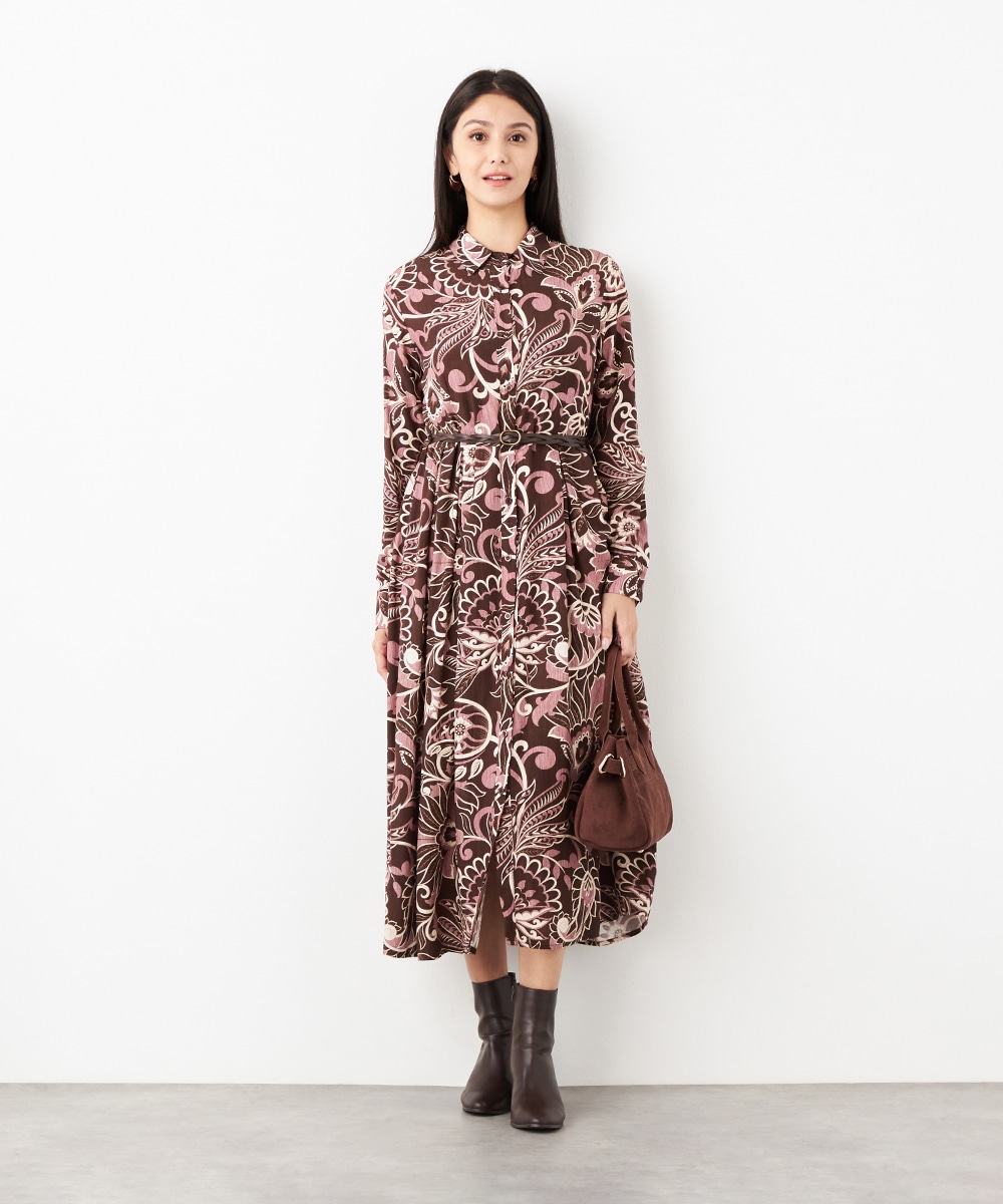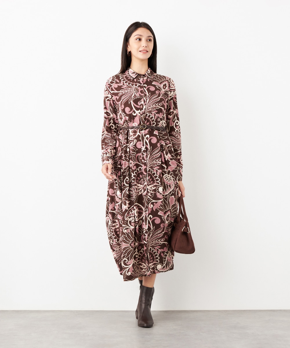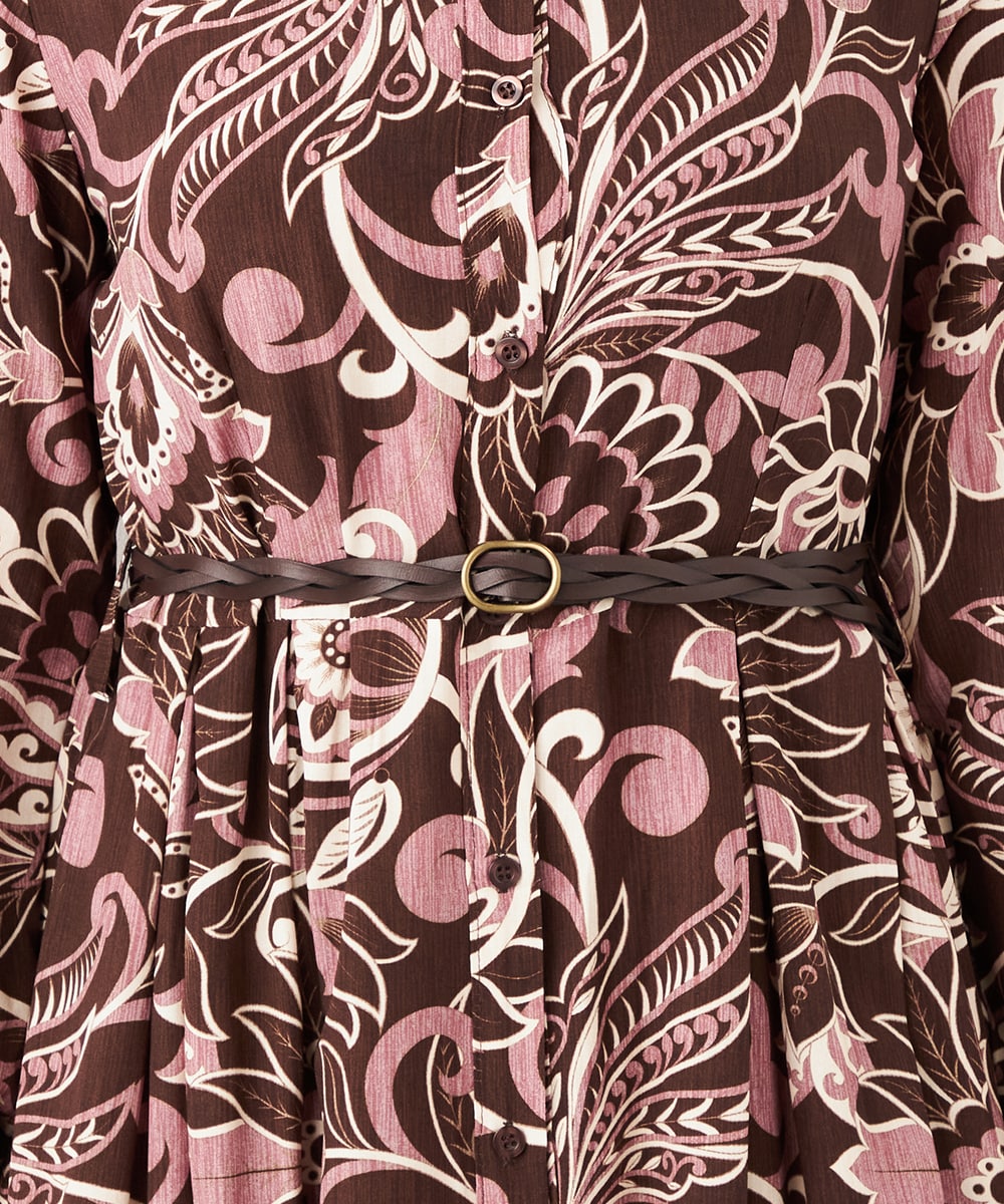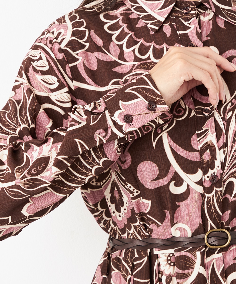エスニックな雰囲気あふれるペイズリー柄を大ぶりに描き、より華やかに仕上げました。ウエストに施された切り替えが、スタイルのメリハリをさりげなく演出します。羽織として活用するのもおすすめのアレンジです。ウエストマークに便利な細幅のメッシュベルトが付属しています。