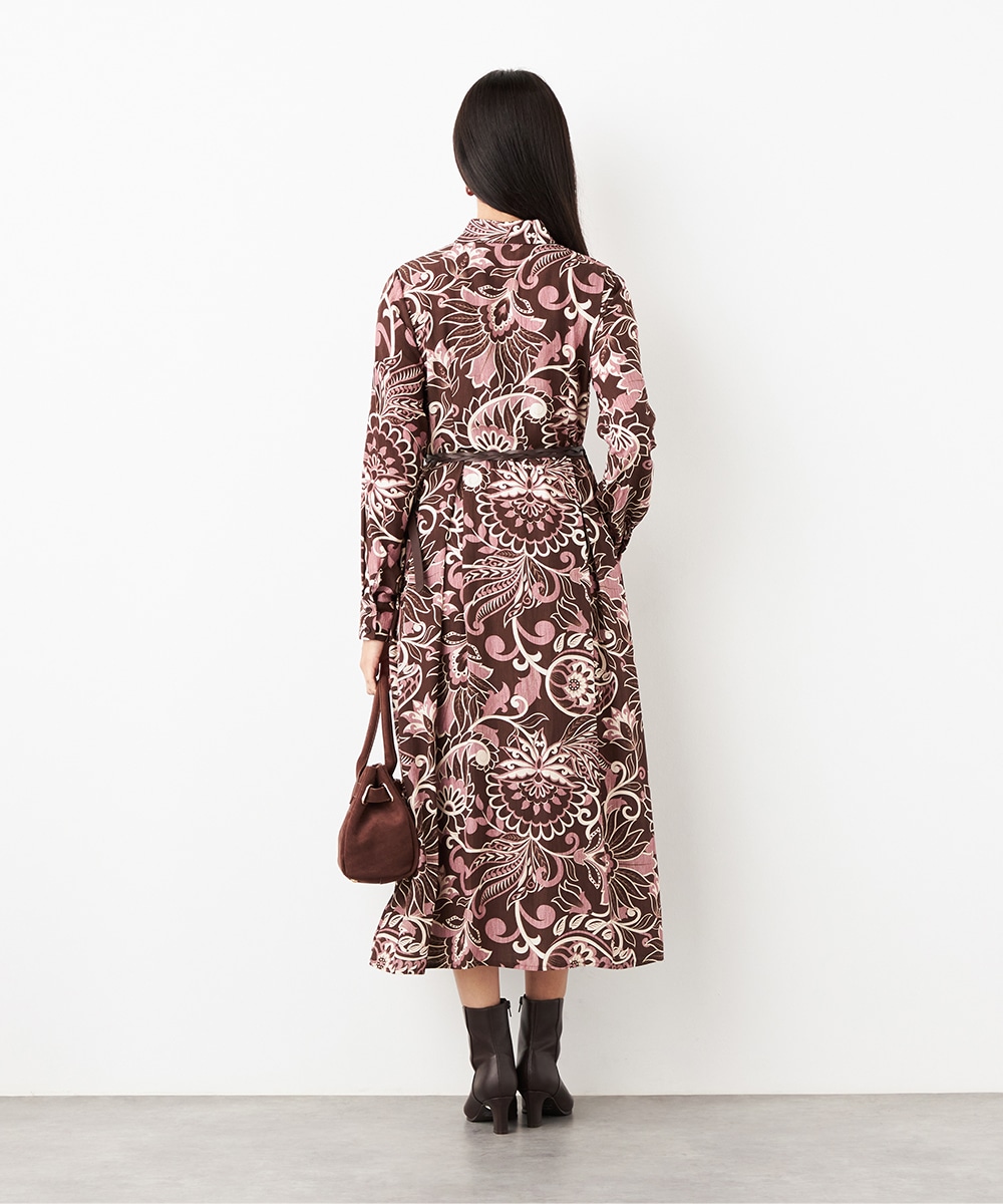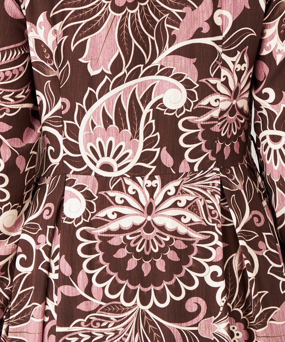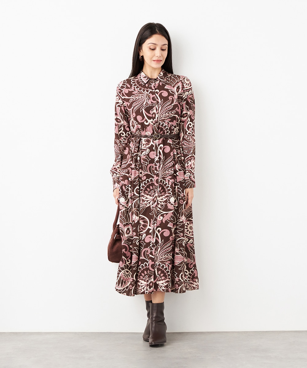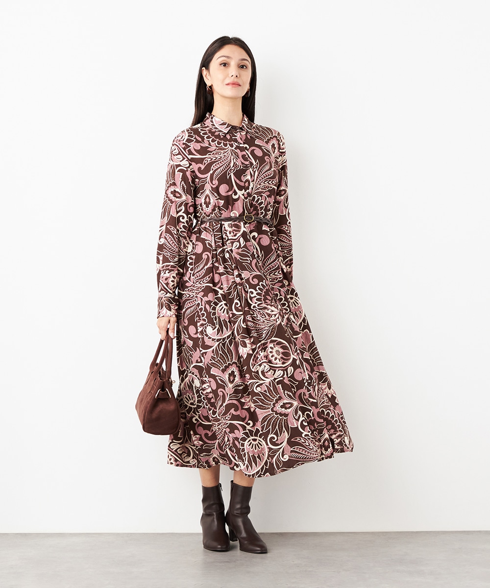 エスニックな雰囲気あふれるペイズリー柄を大ぶりに描き、より華やかに仕上げました。ウエストに施された切り替えが、スタイルのメリハリをさりげなく演出します。羽織として活用するのもおすすめのアレンジです。ウエストマークに便利な細幅のメッシュベルトが付属しています。
