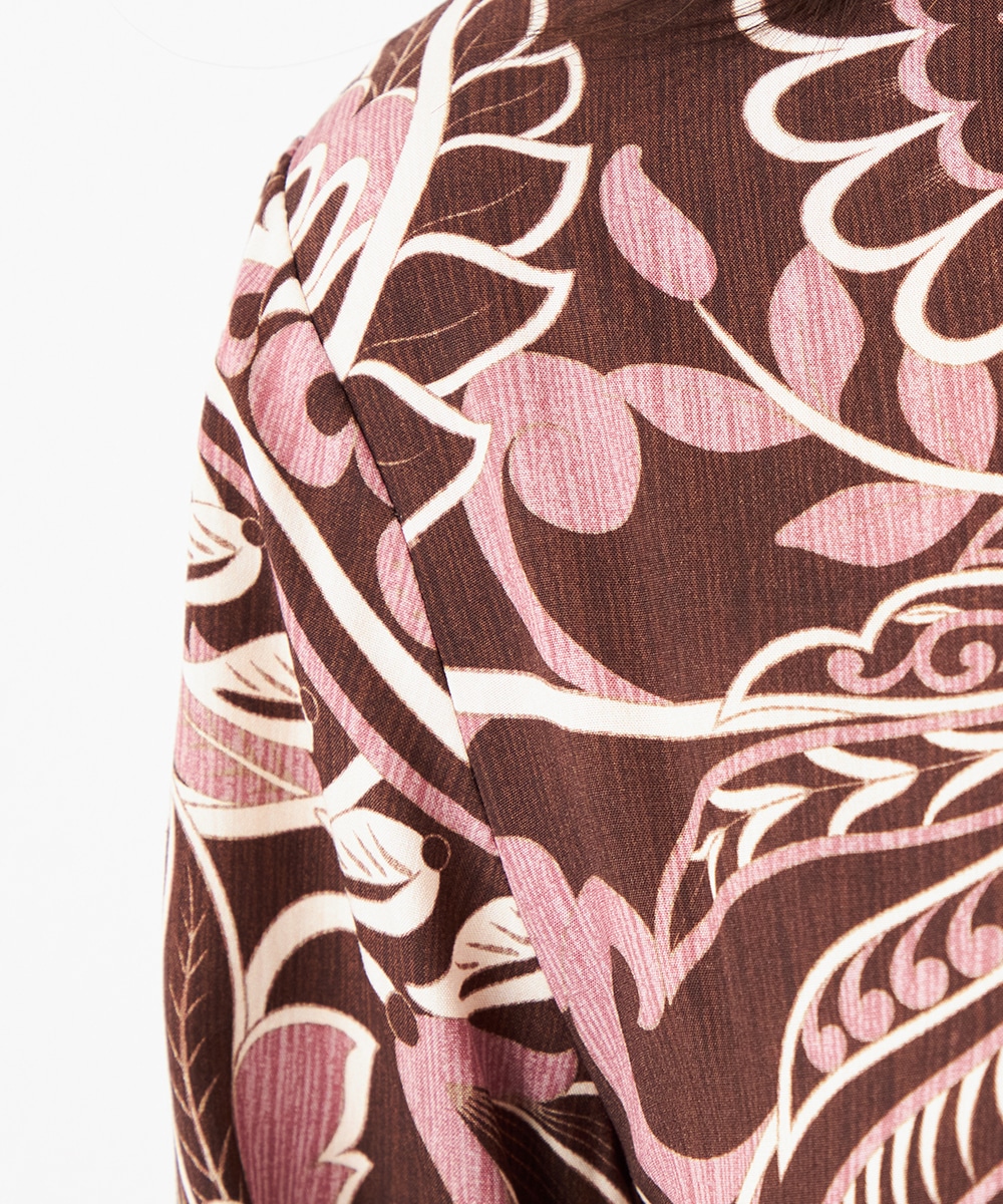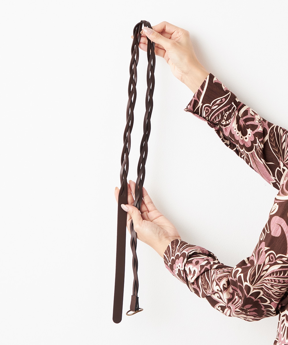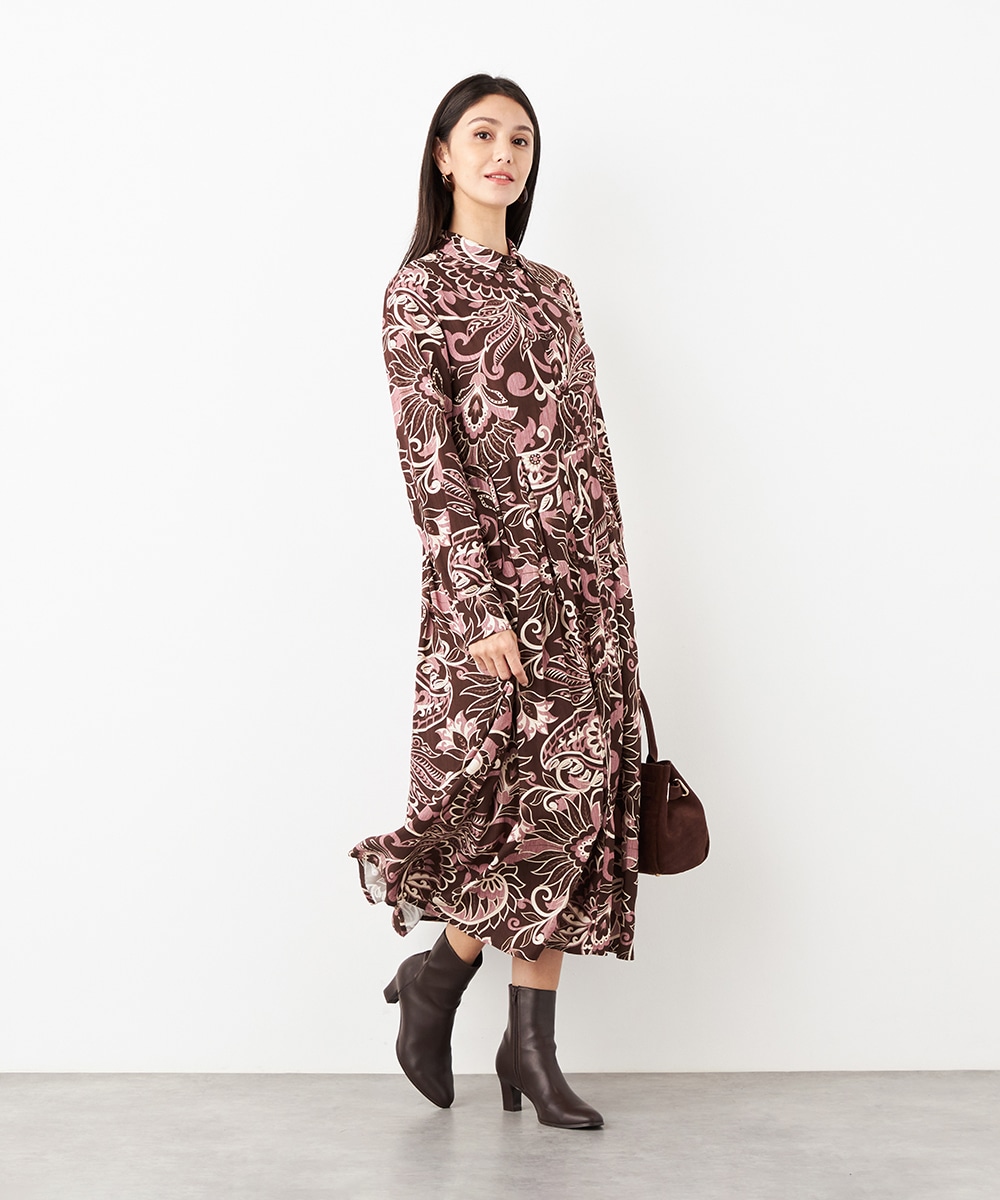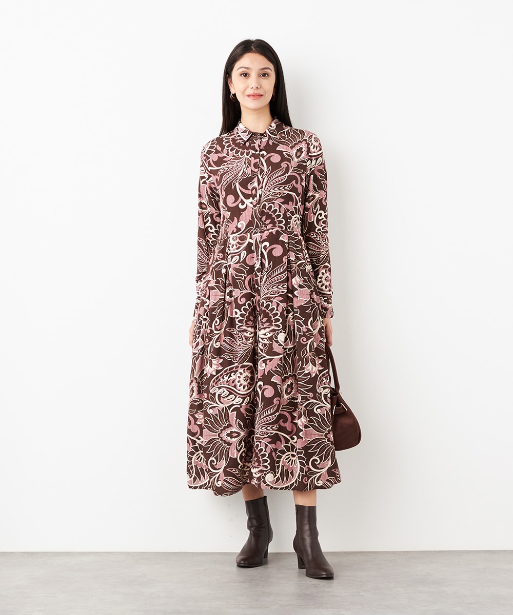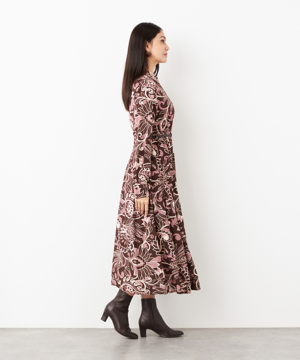 エスニックな雰囲気あふれるペイズリー柄を大ぶりに描き、より華やかに仕上げました。ウエストに施された切り替えが、スタイルのメリハリをさりげなく演出します。羽織として活用するのもおすすめのアレンジです。ウエストマークに便利な細幅のメッシュベルトが付属しています。