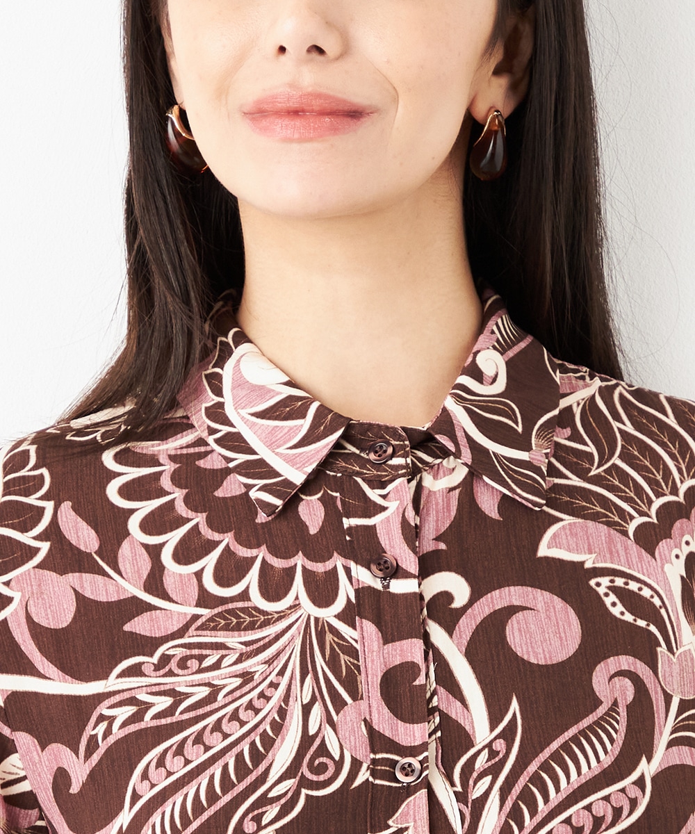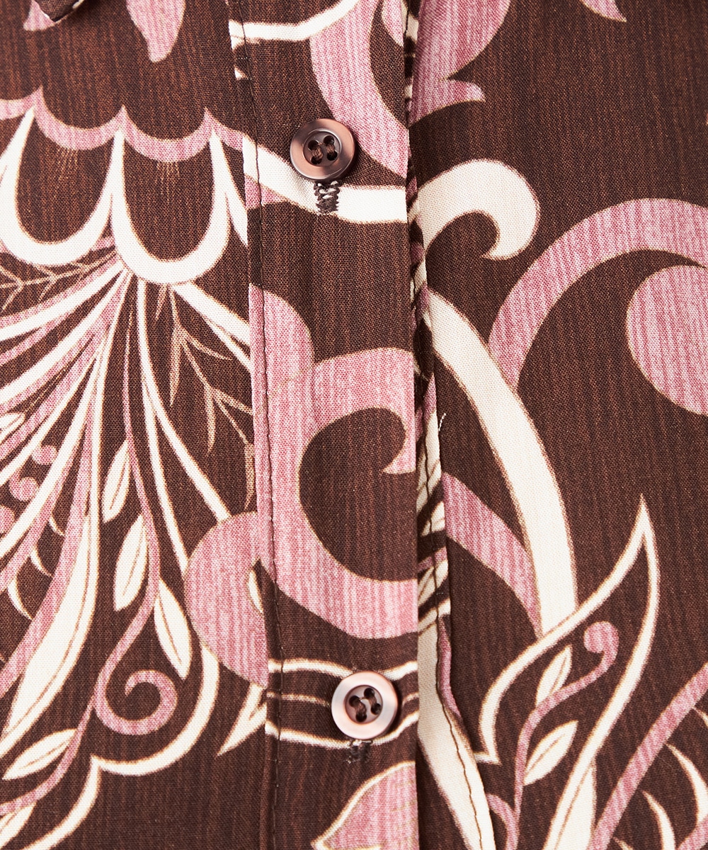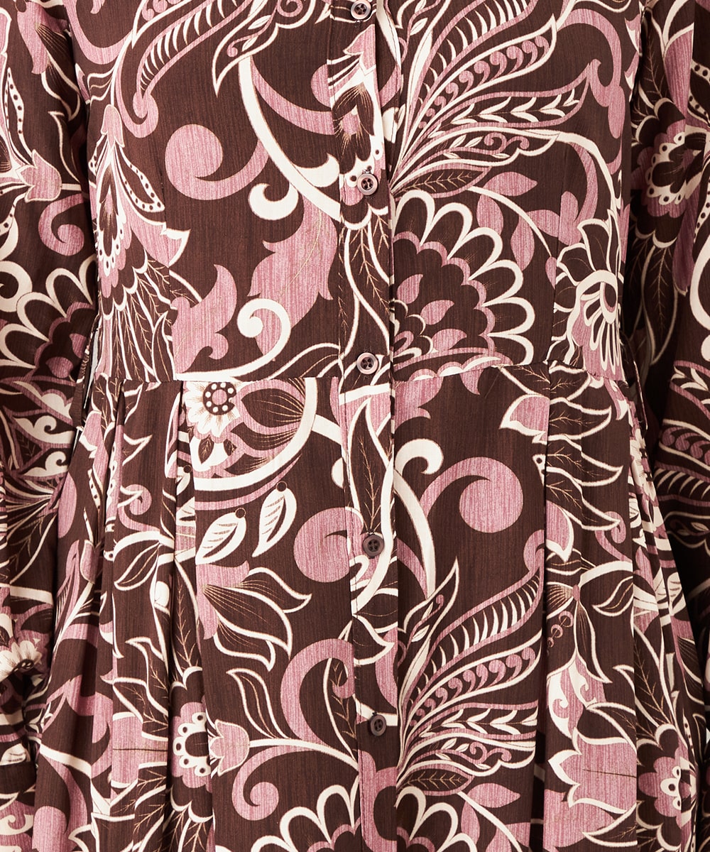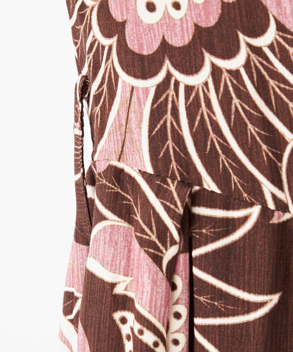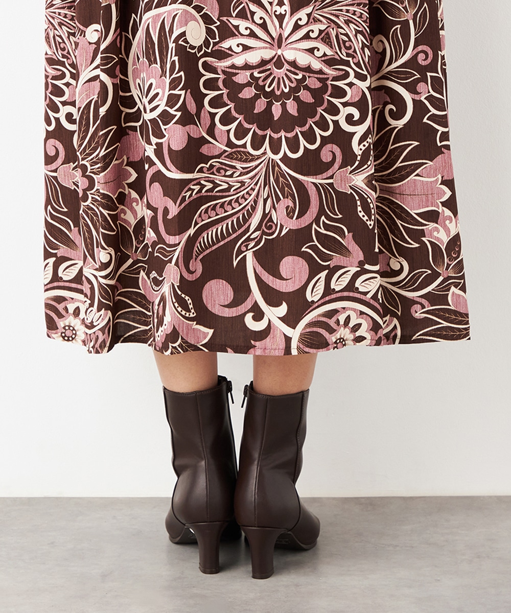 エスニックな雰囲気あふれるペイズリー柄を大ぶりに描き、より華やかに仕上げました。ウエストに施された切り替えが、スタイルのメリハリをさりげなく演出します。羽織として活用するのもおすすめのアレンジです。ウエストマークに便利な細幅のメッシュベルトが付属しています。