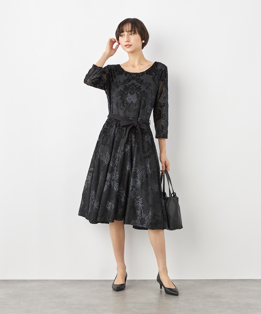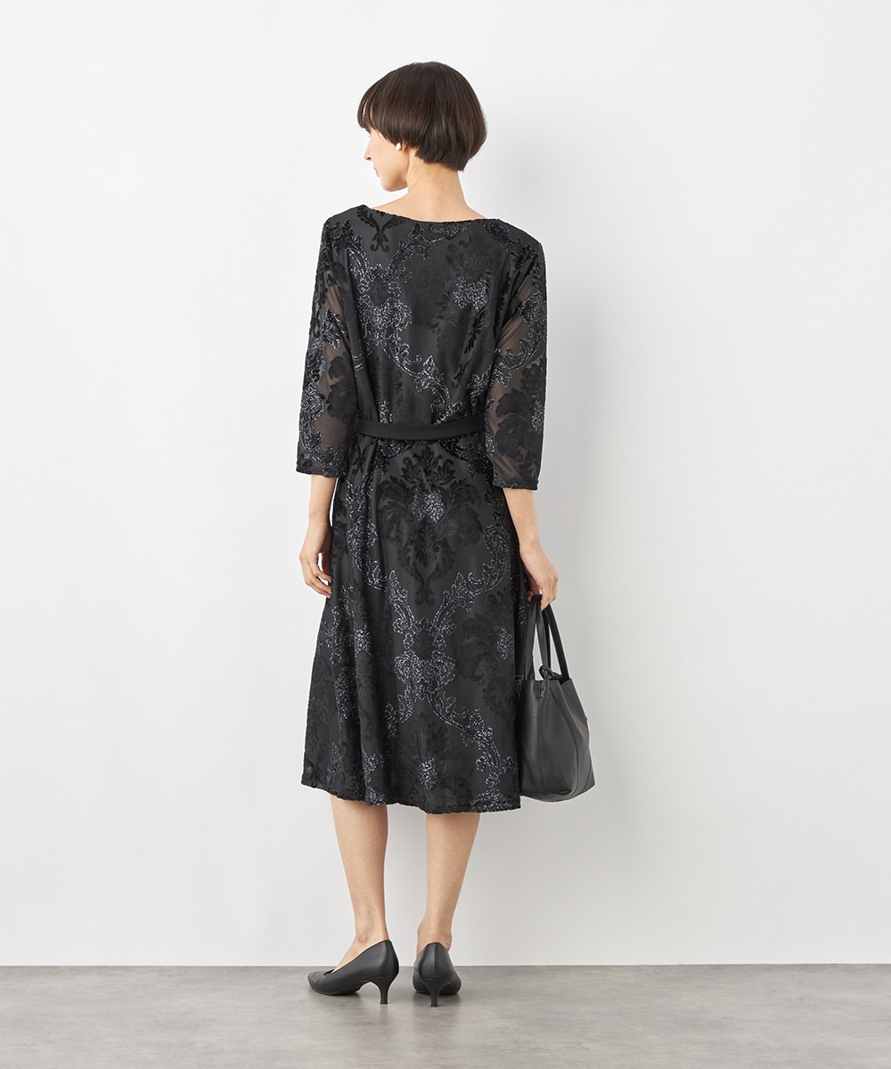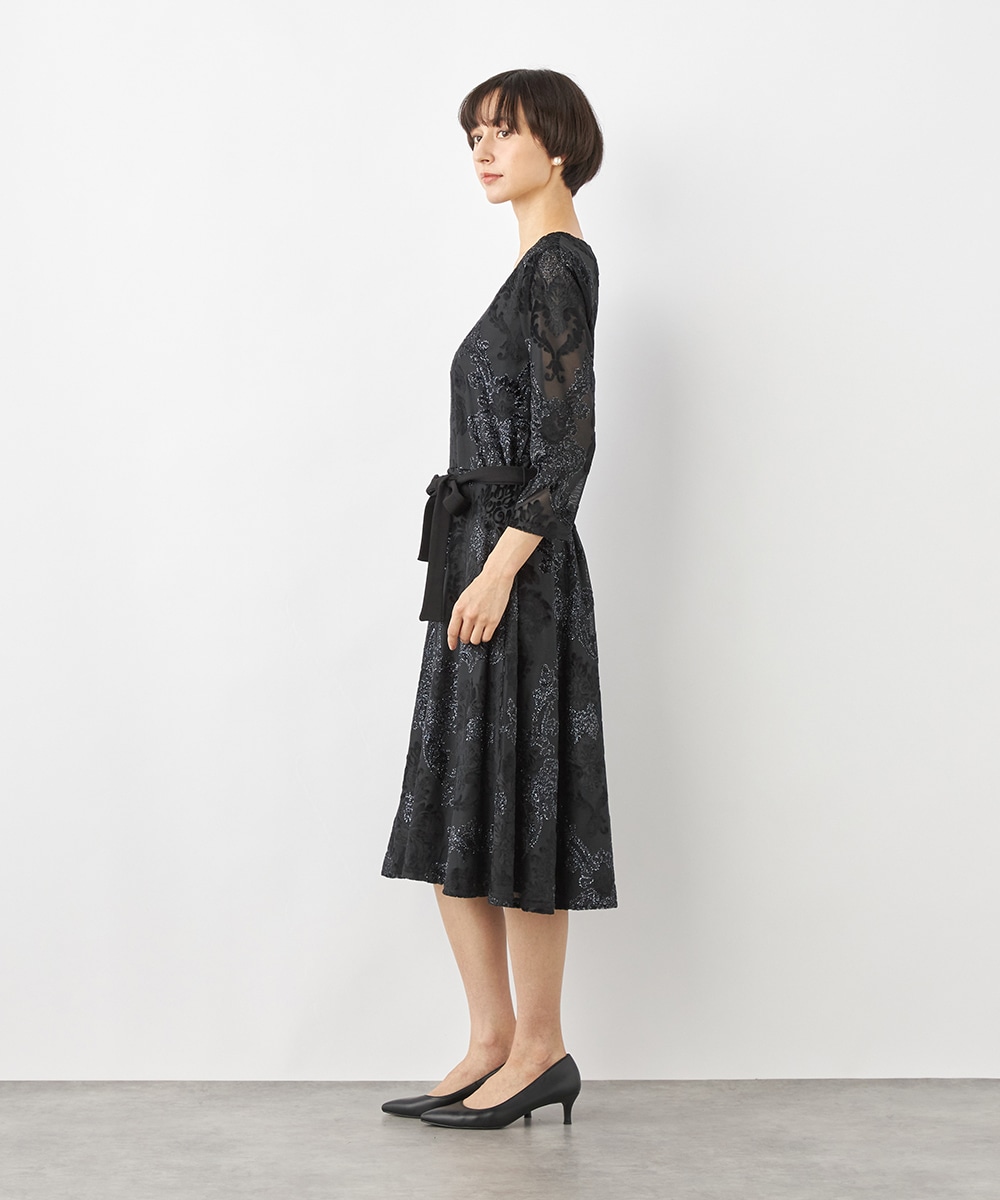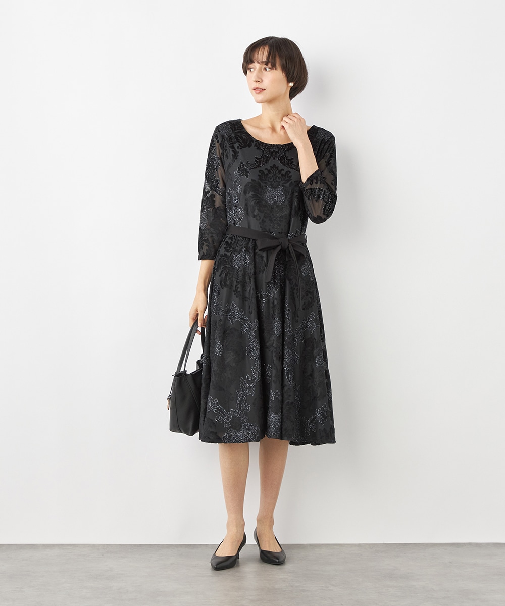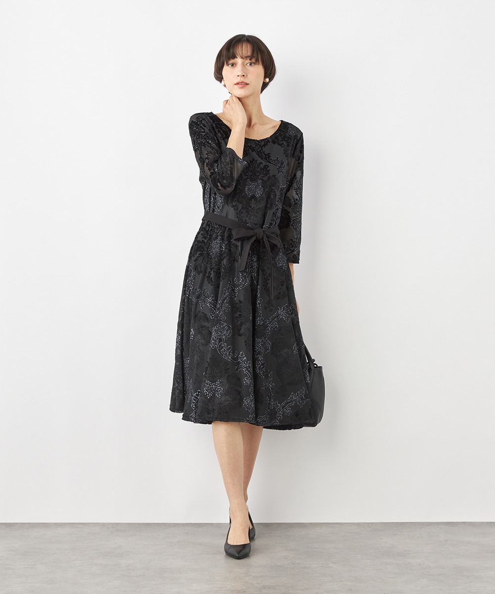女性らしくエレガントなフィット&フレアのシルエットを採用。膝が隠れる着丈で品良くまとまり、オケージョンにも対応できます。広めに開いたネックでフェイスラインがすっきりと見えるのも特徴です。袖は裏地を省き、素材感を生かしています。ブラックのリボンベルト付きです。
