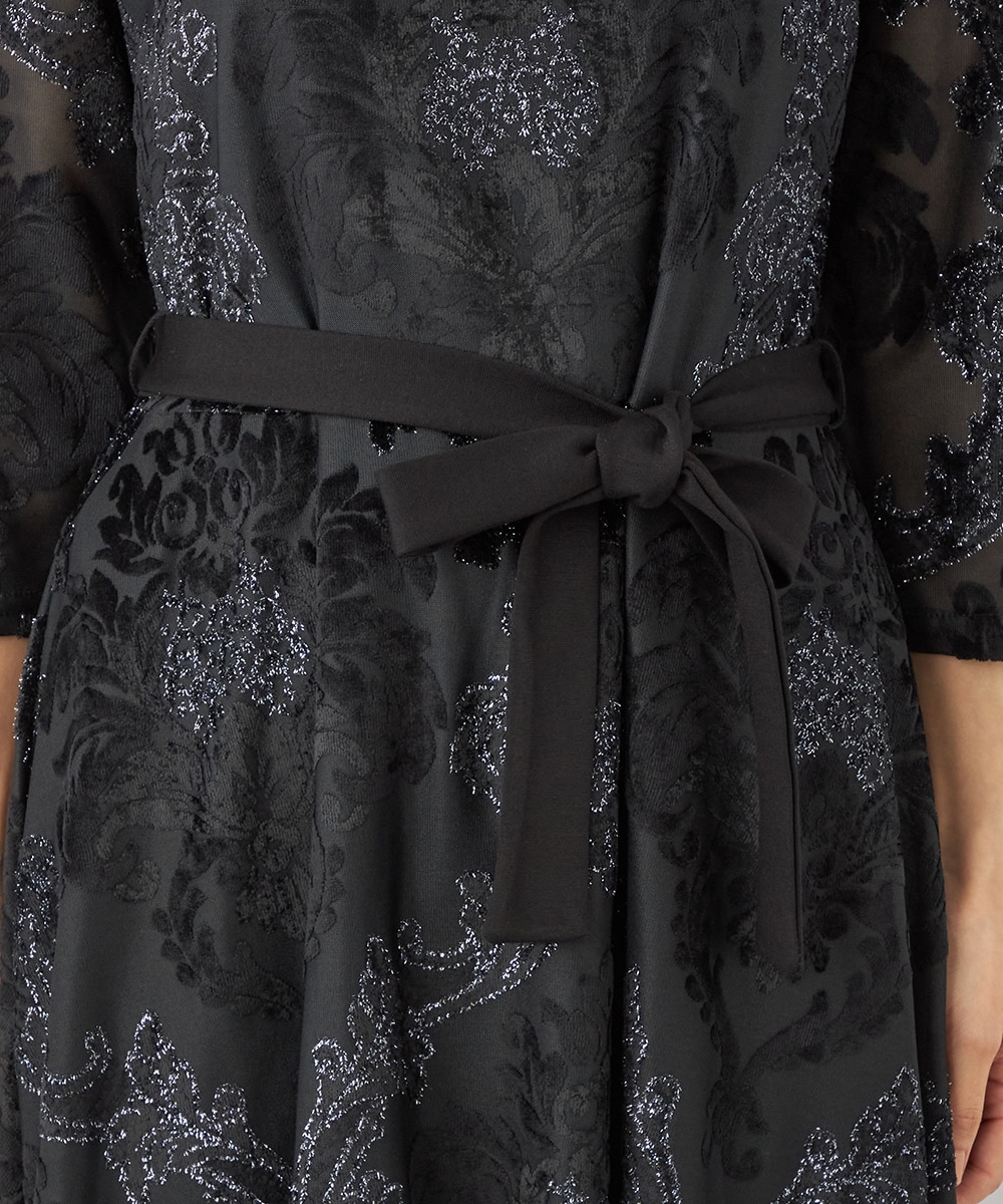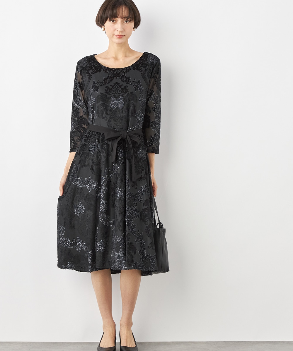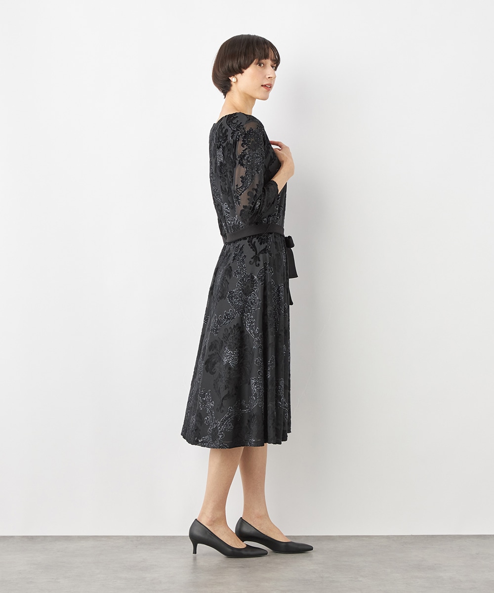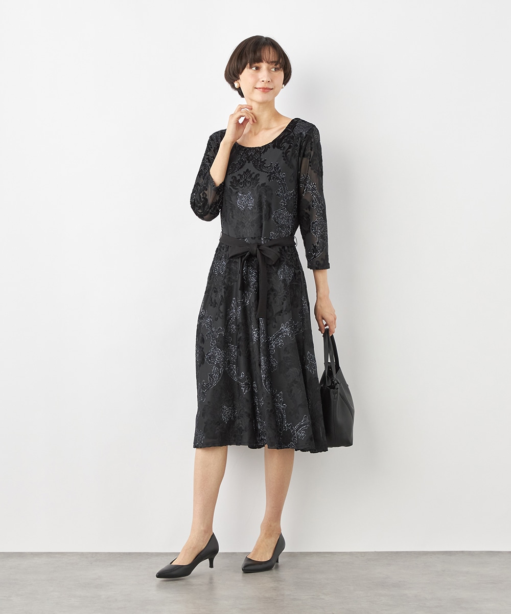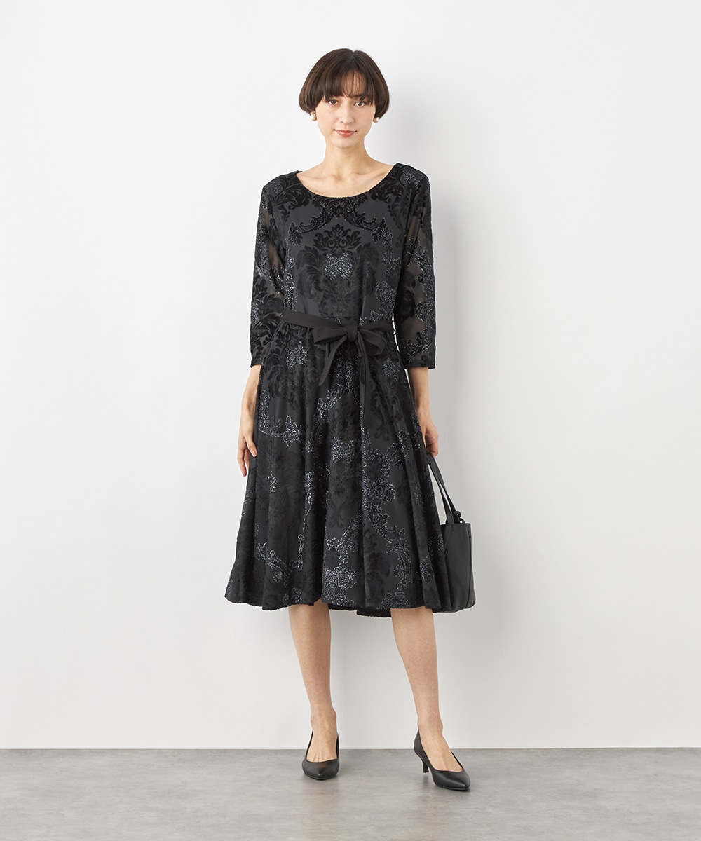 女性らしくエレガントなフィット&フレアのシルエットを採用。膝が隠れる着丈で品良くまとまり、オケージョンにも対応できます。広めに開いたネックでフェイスラインがすっきりと見えるのも特徴です。袖は裏地を省き、素材感を生かしています。ブラックのリボンベルト付きです。