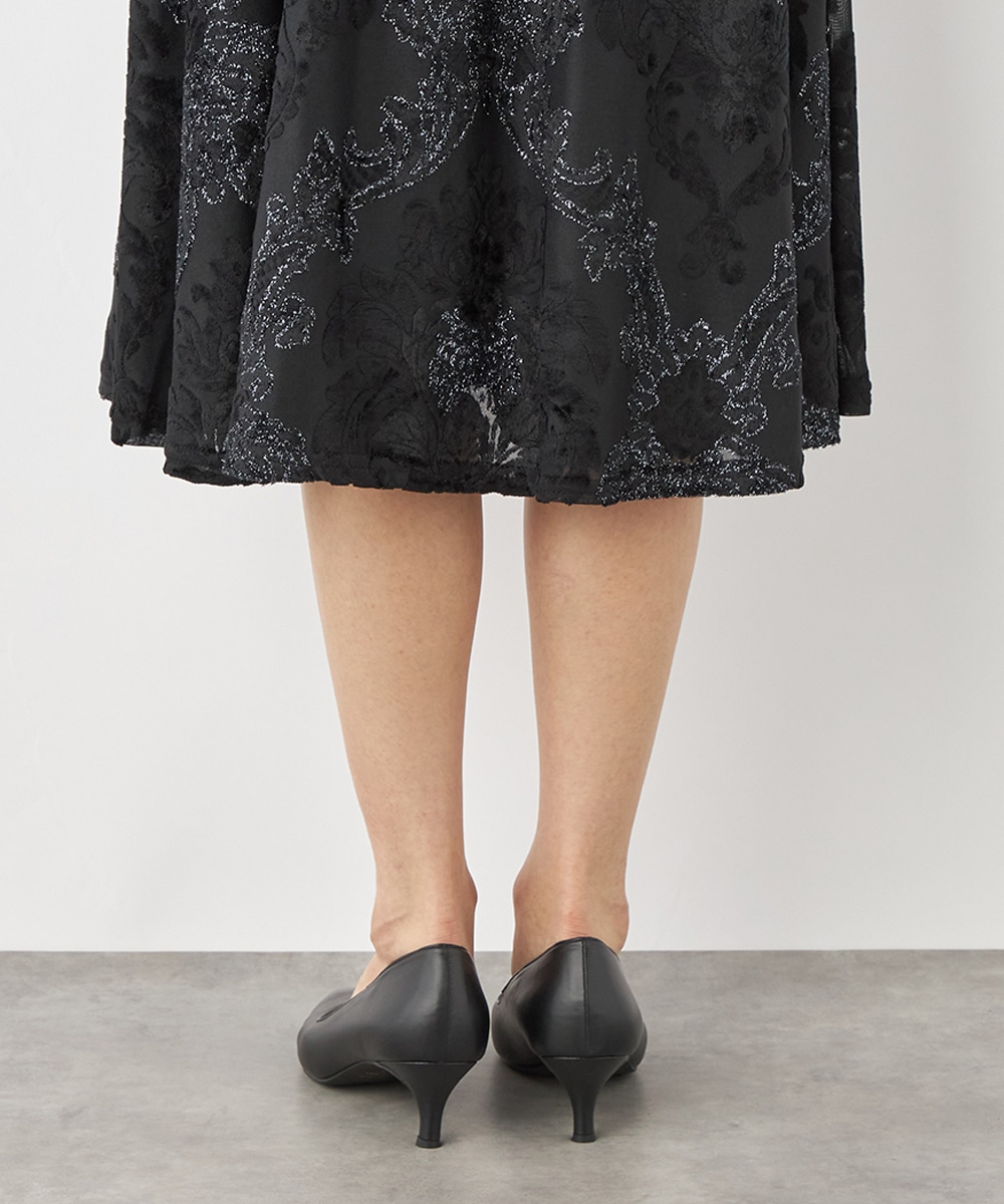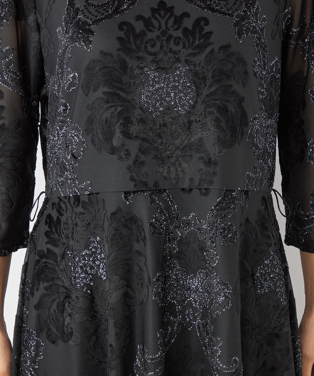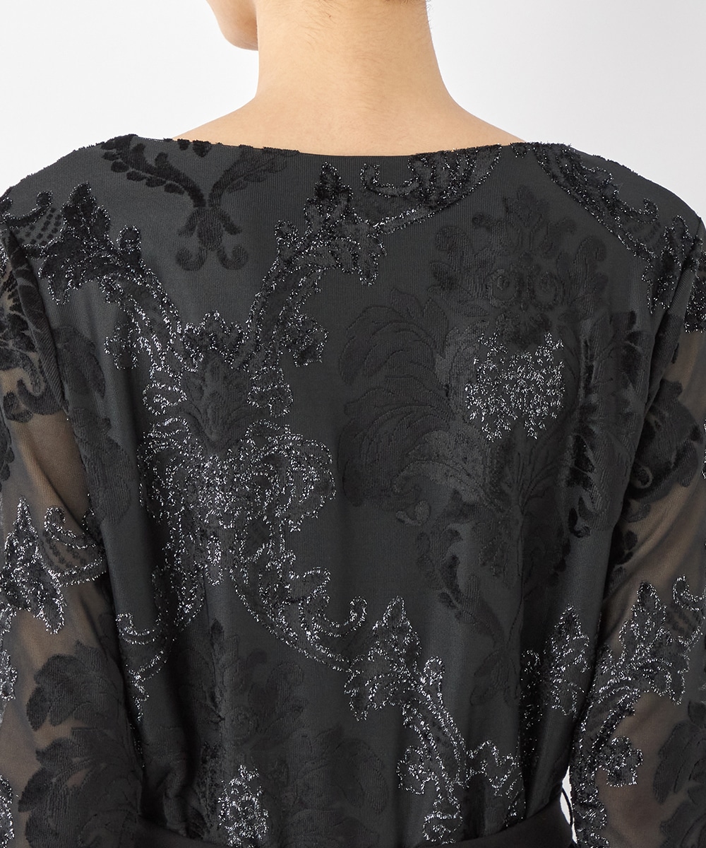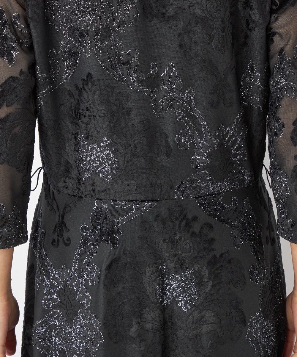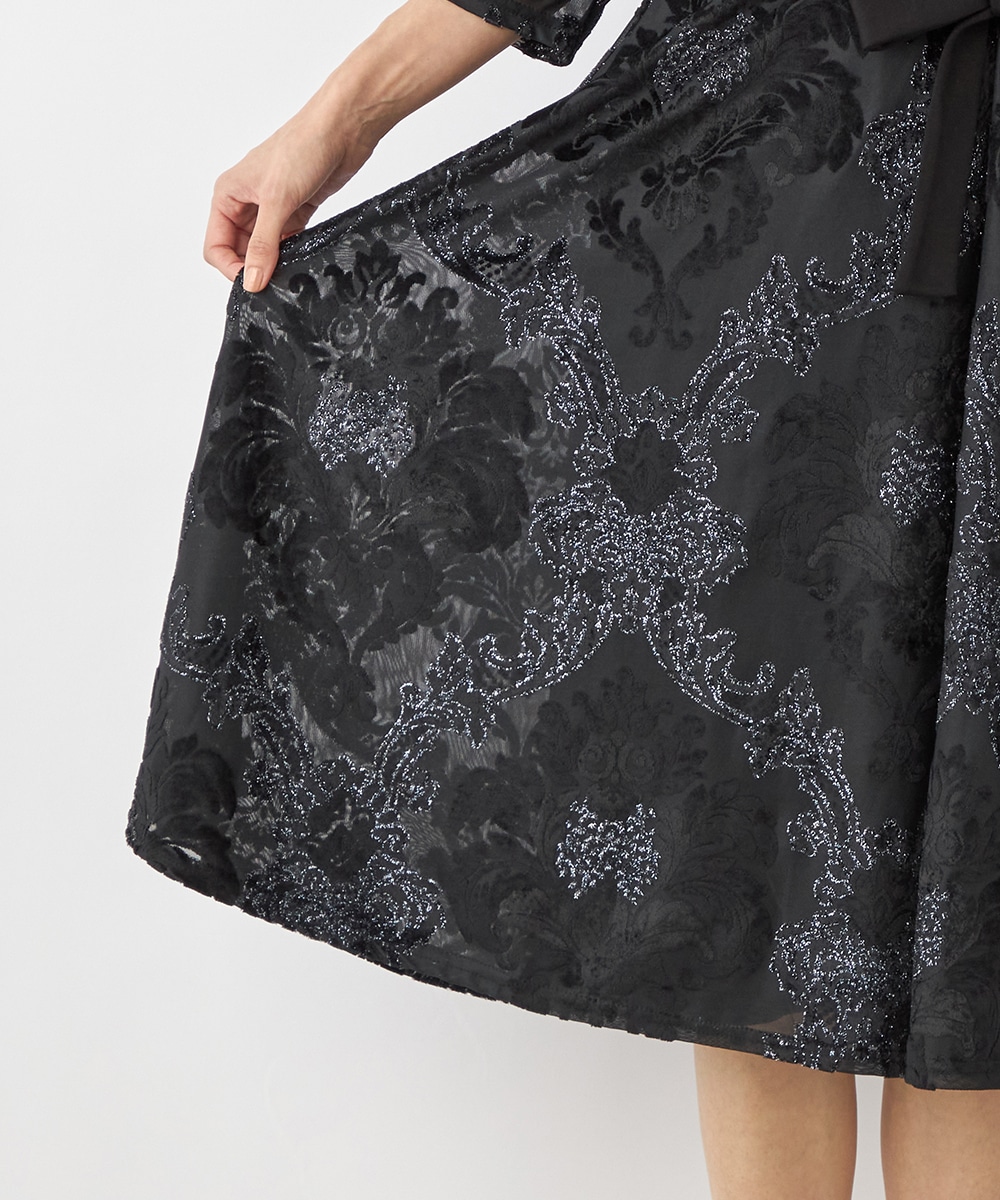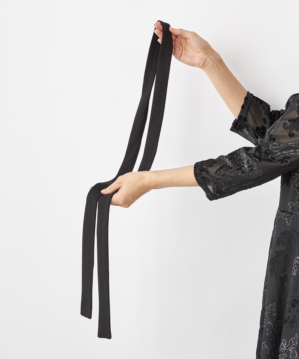 女性らしくエレガントなフィット&フレアのシルエットを採用。膝が隠れる着丈で品良くまとまり、オケージョンにも対応できます。広めに開いたネックでフェイスラインがすっきりと見えるのも特徴です。袖は裏地を省き、素材感を生かしています。ブラックのリボンベルト付きです。