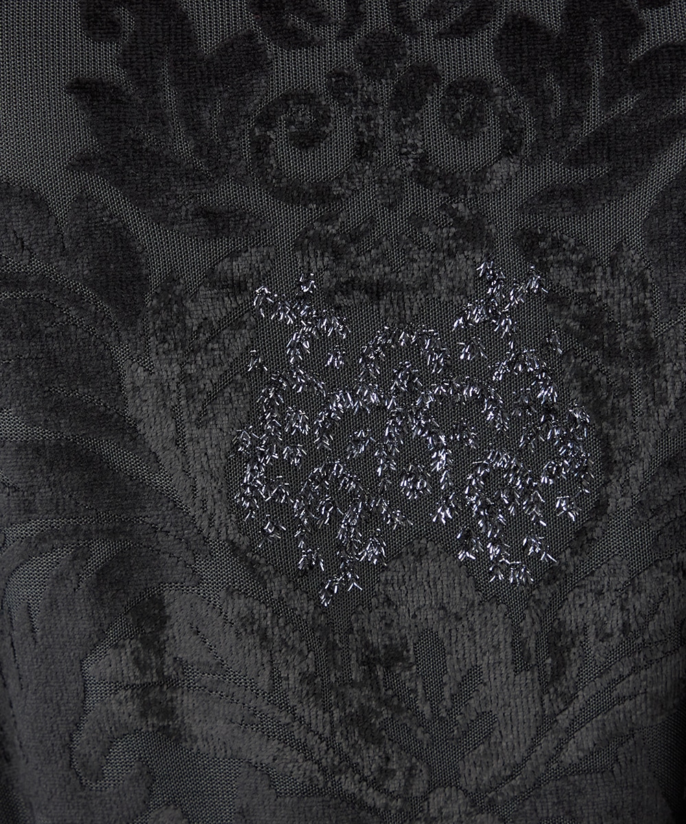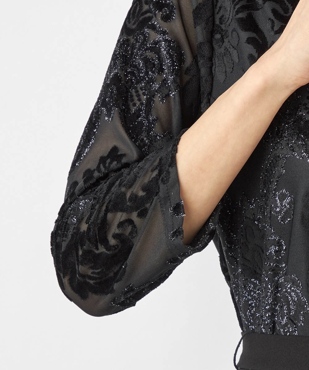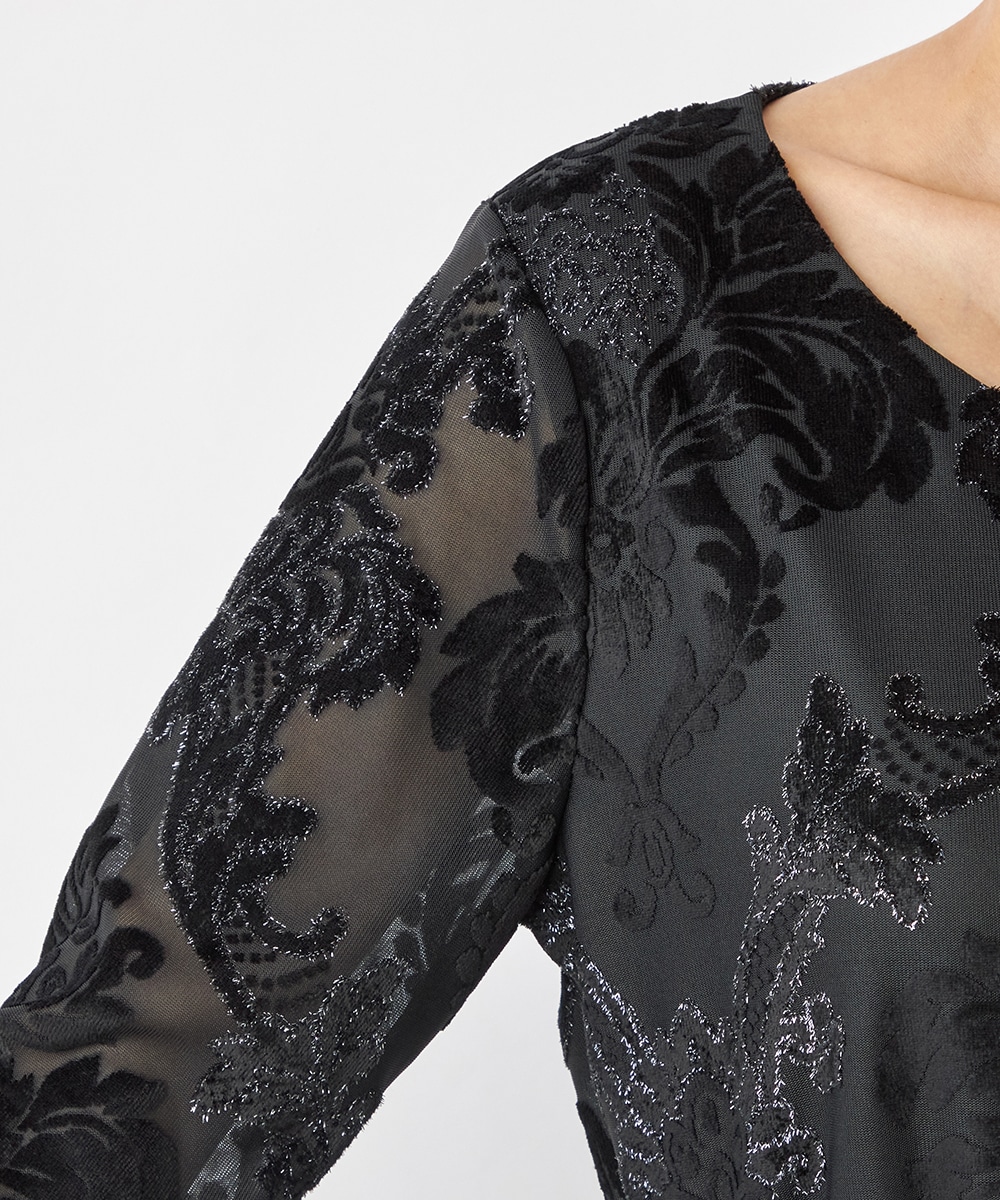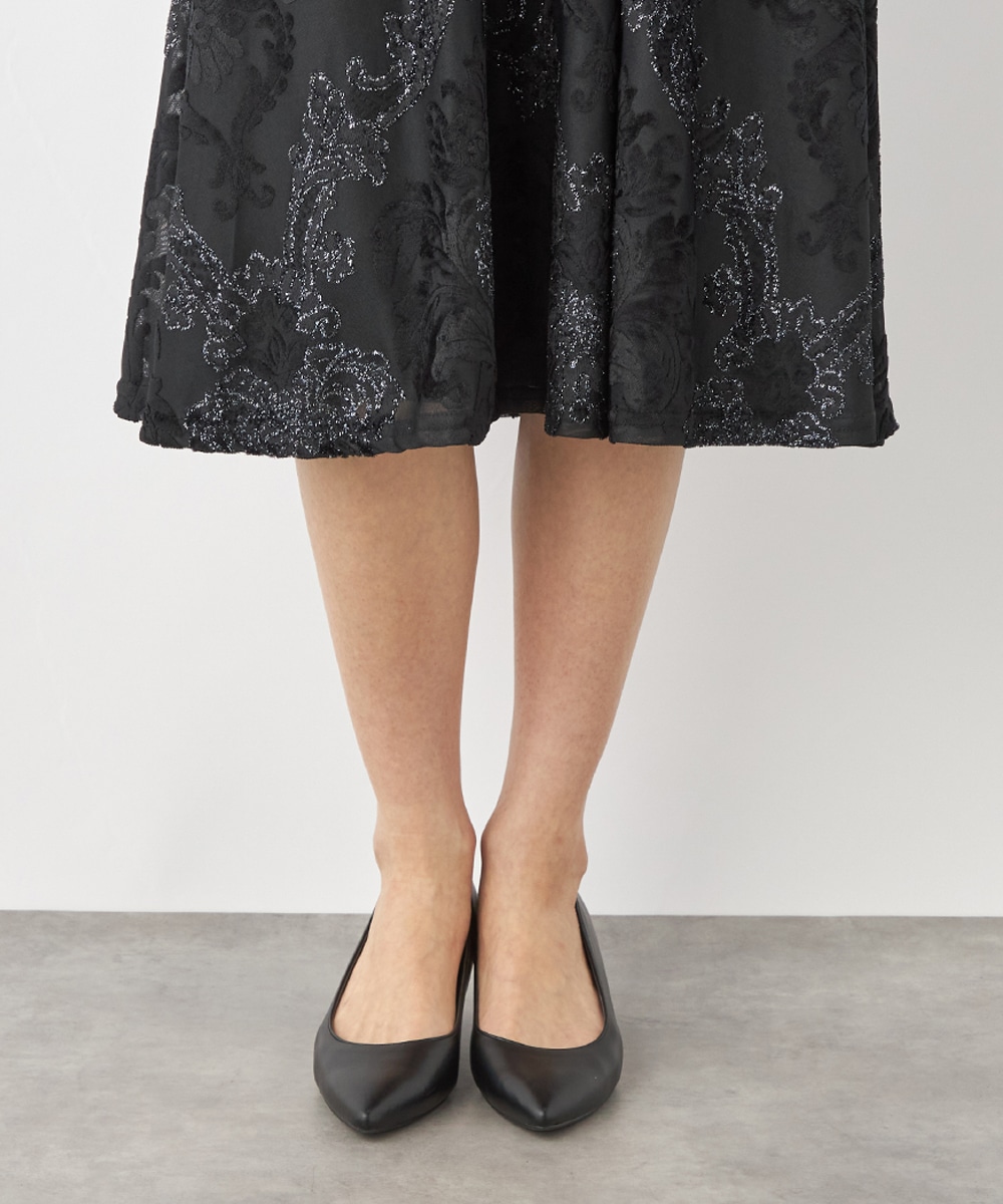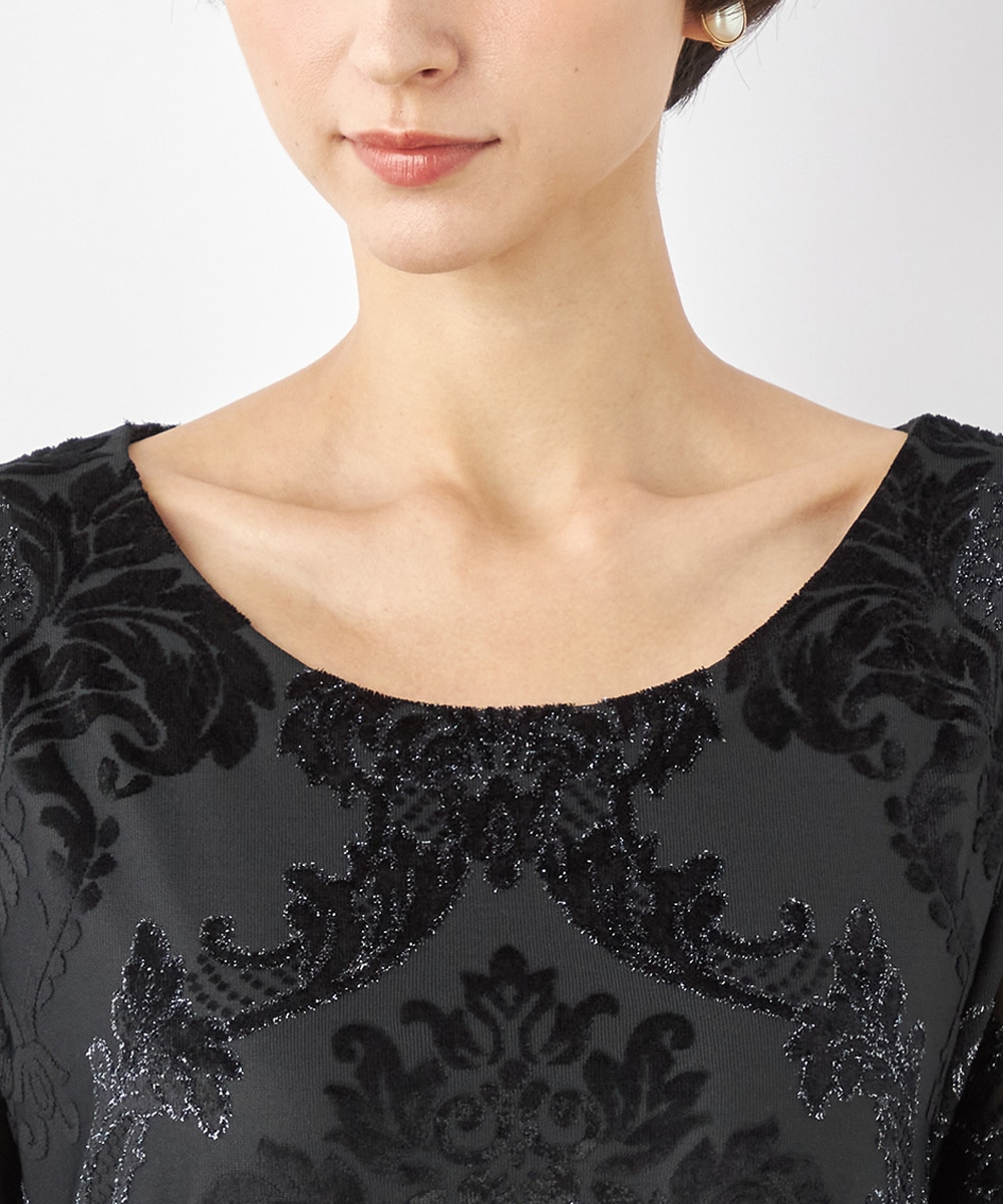 女性らしくエレガントなフィット&フレアのシルエットを採用。膝が隠れる着丈で品良くまとまり、オケージョンにも対応できます。広めに開いたネックでフェイスラインがすっきりと見えるのも特徴です。袖は裏地を省き、素材感を生かしています。ブラックのリボンベルト付きです。