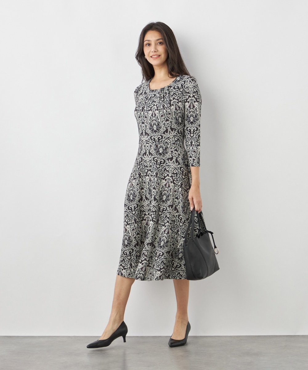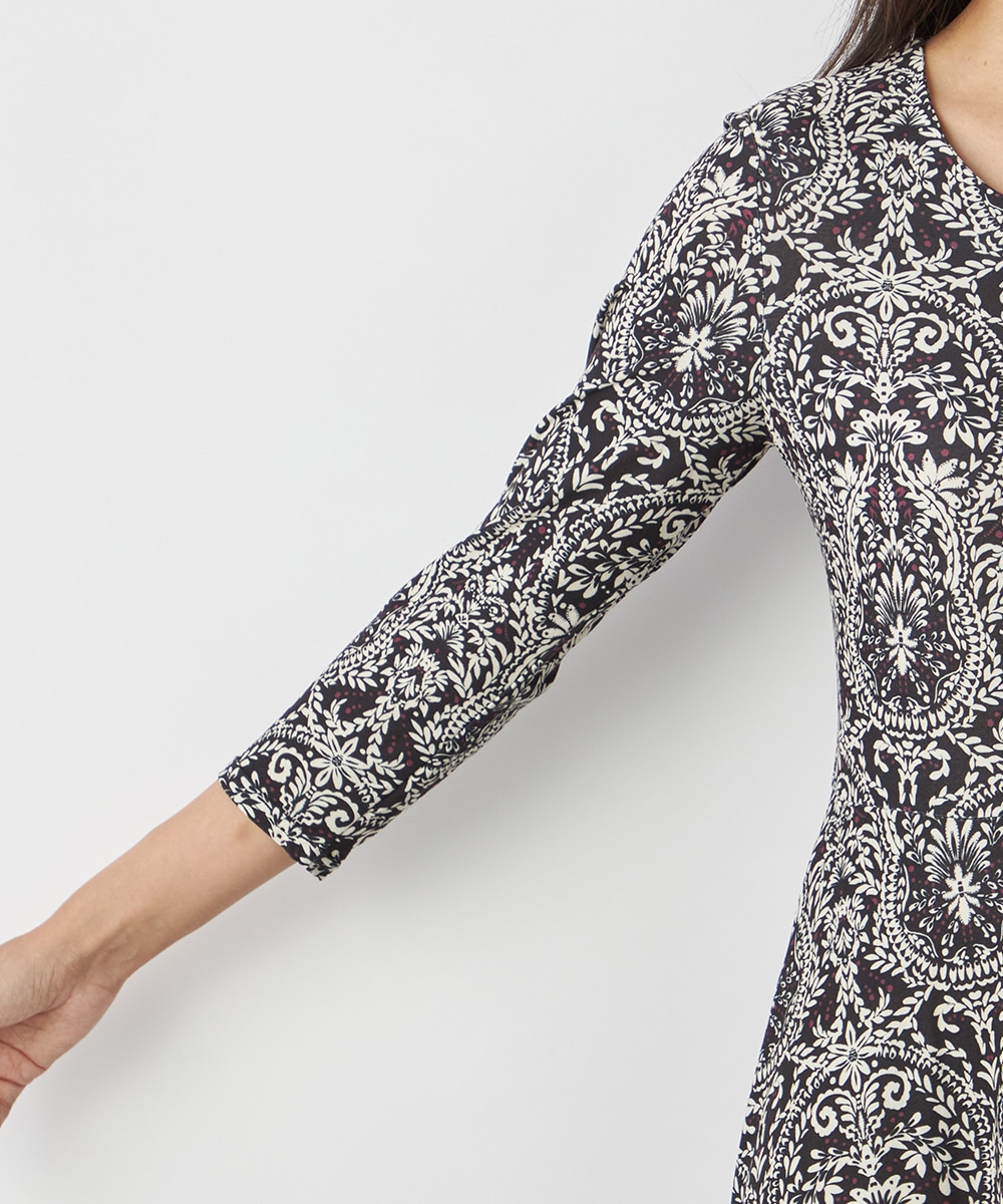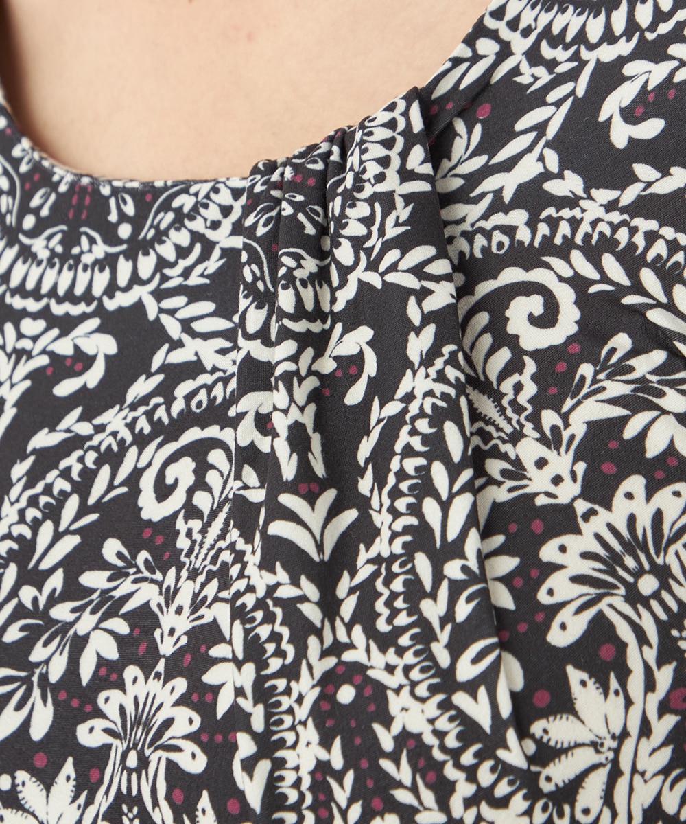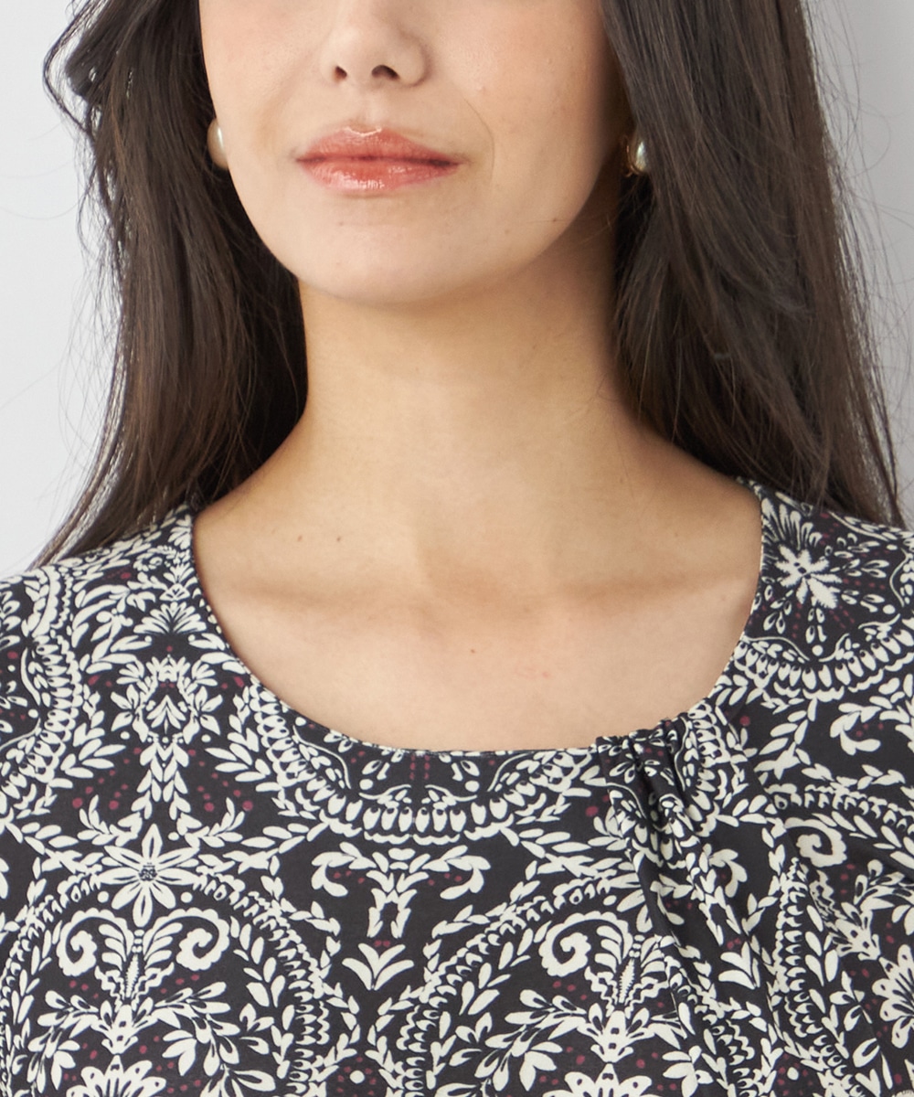 ほどよい開き具合のネックと七分袖のデザインですっきりと軽やかに着こなせます。ネック回りにはアシンメトリーなタックを施して、アクセントをプラス。ウエストから裾にかけてのフレア感がエレガントな印象です。ソフトで心地よい風合いのジャージ素材を使用しています。