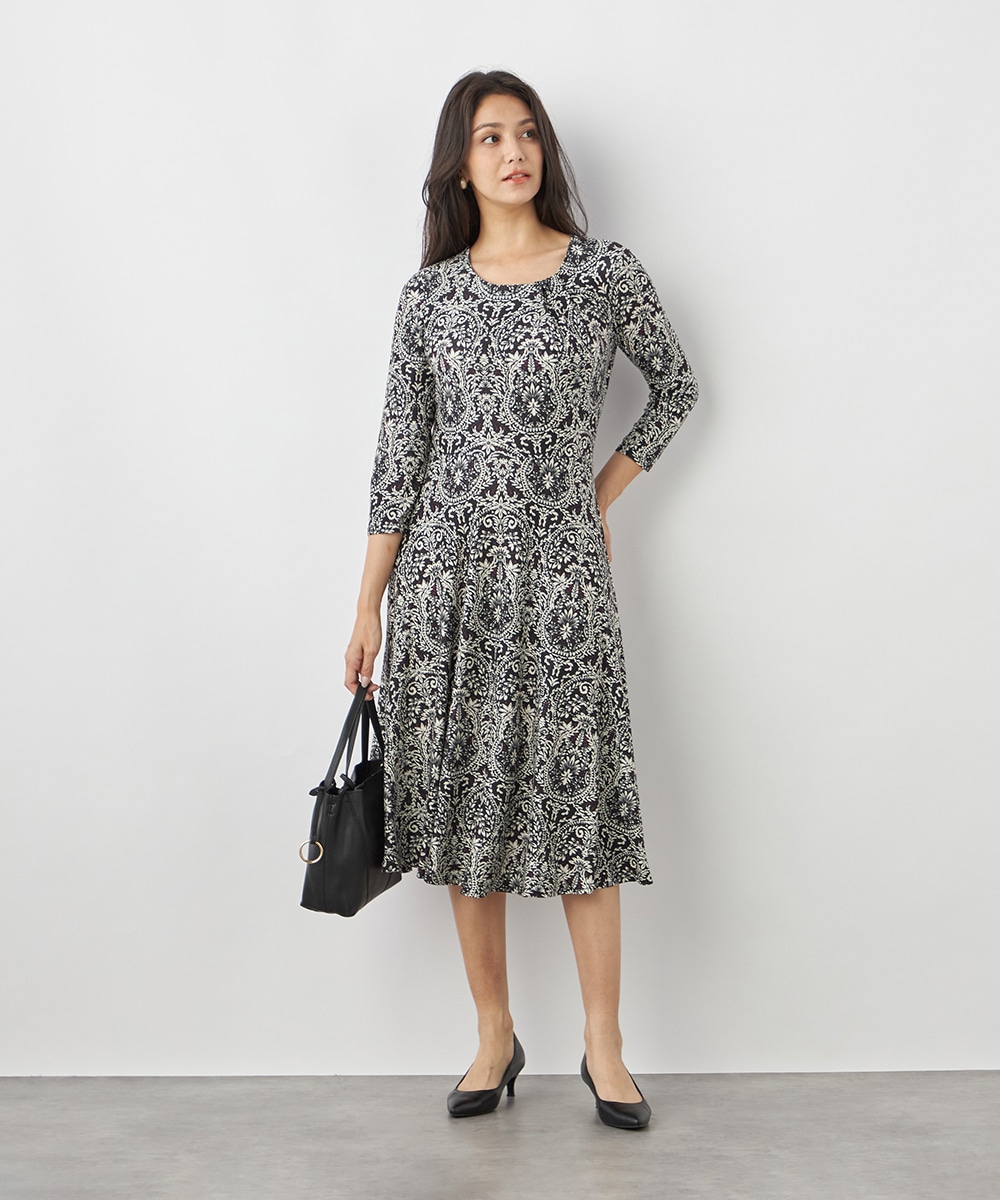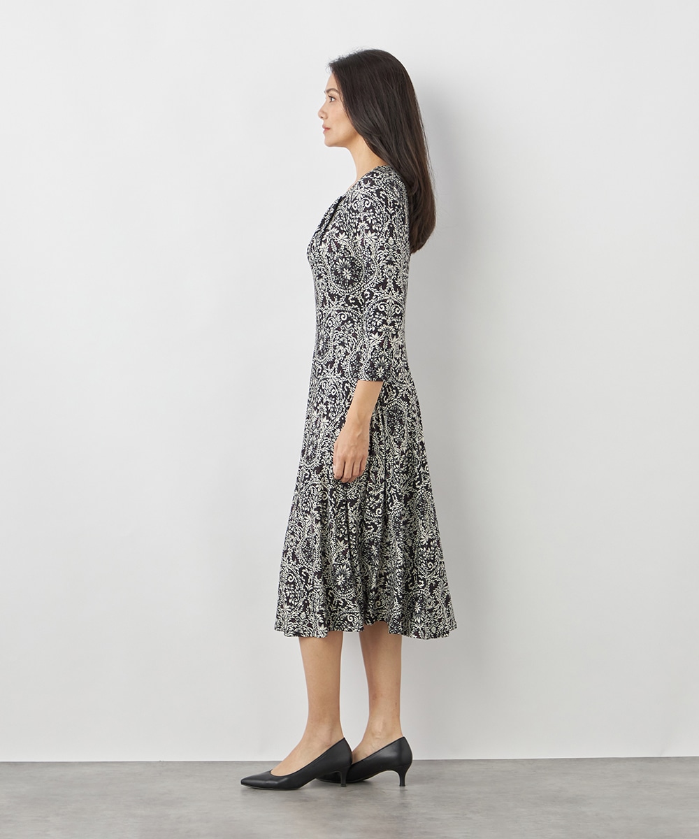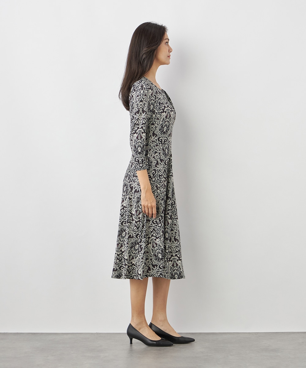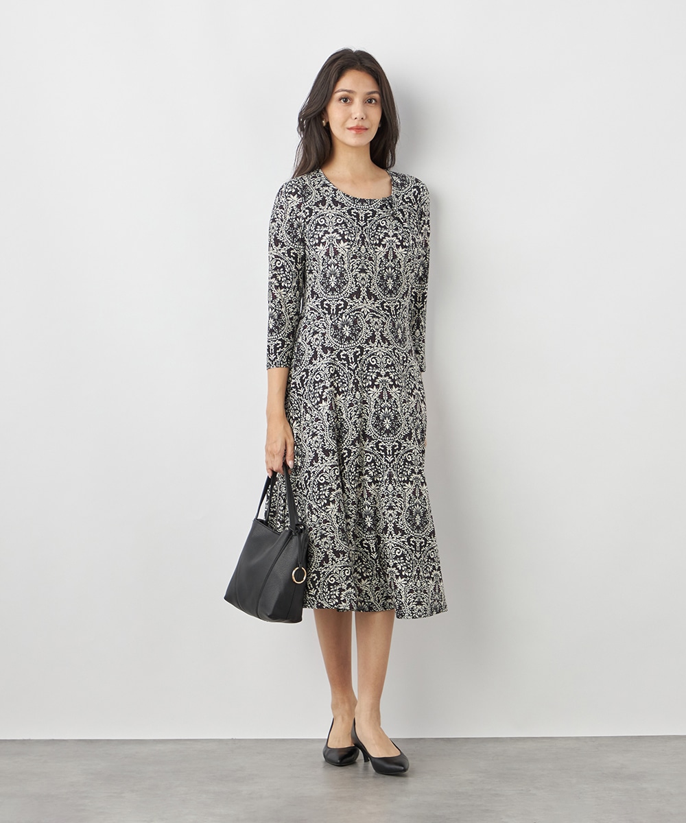 ほどよい開き具合のネックと七分袖のデザインですっきりと軽やかに着こなせます。ネック回りにはアシンメトリーなタックを施して、アクセントをプラス。ウエストから裾にかけてのフレア感がエレガントな印象です。ソフトで心地よい風合いのジャージ素材を使用しています。