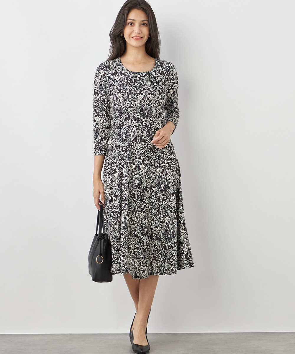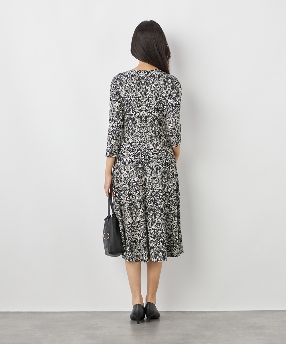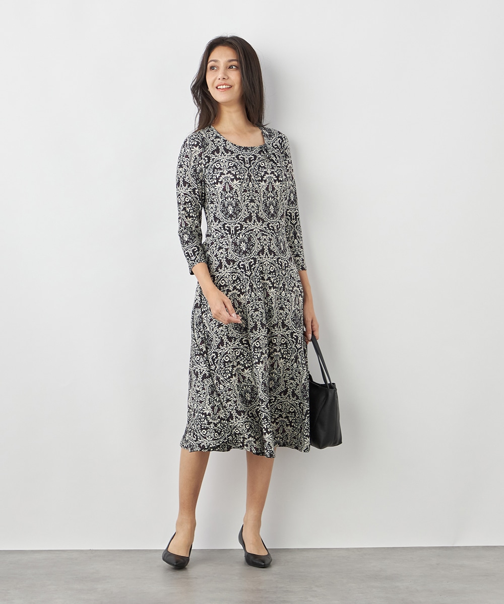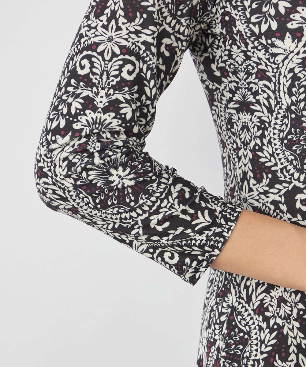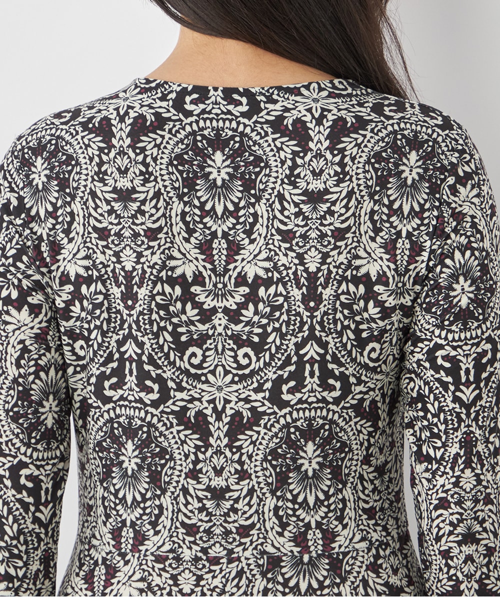 ほどよい開き具合のネックと七分袖のデザインですっきりと軽やかに着こなせます。ネック回りにはアシンメトリーなタックを施して、アクセントをプラス。ウエストから裾にかけてのフレア感がエレガントな印象です。ソフトで心地よい風合いのジャージ素材を使用しています。