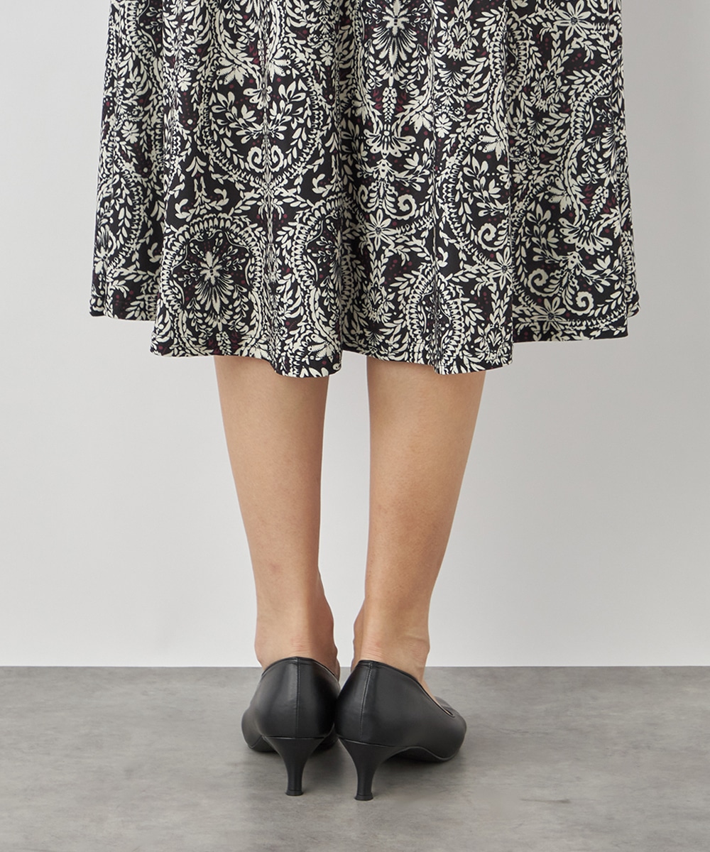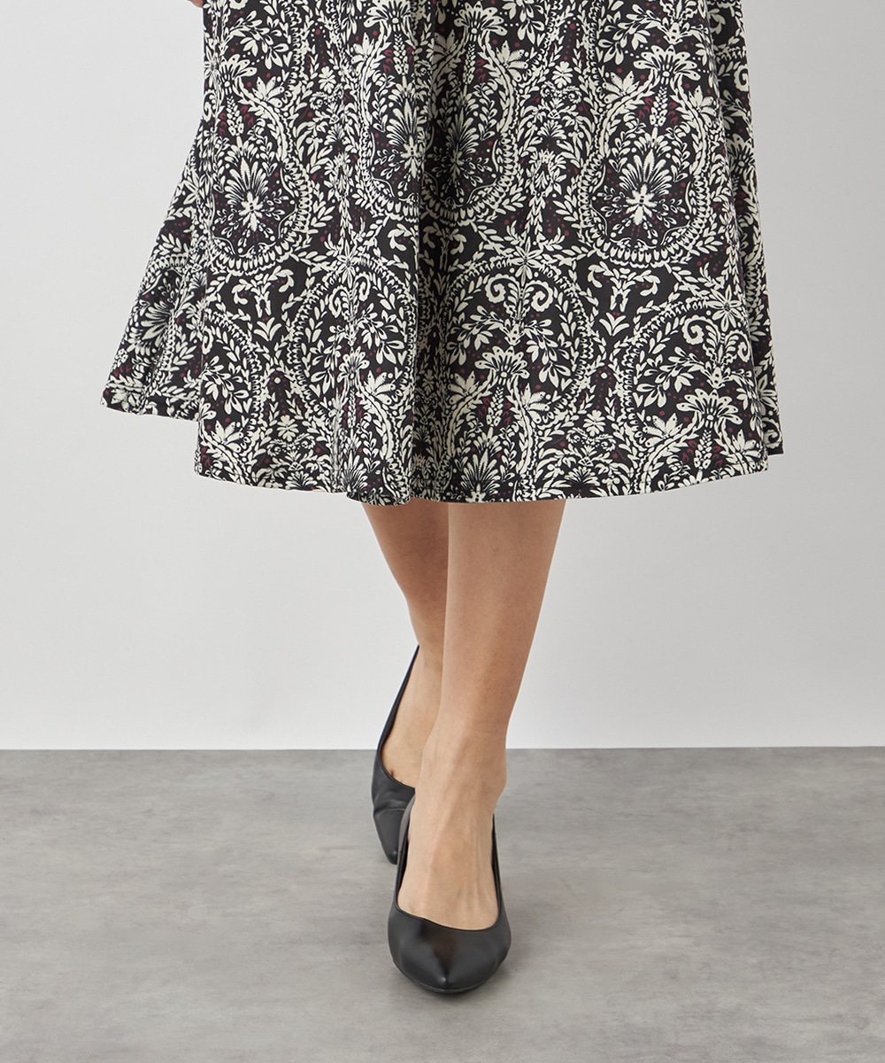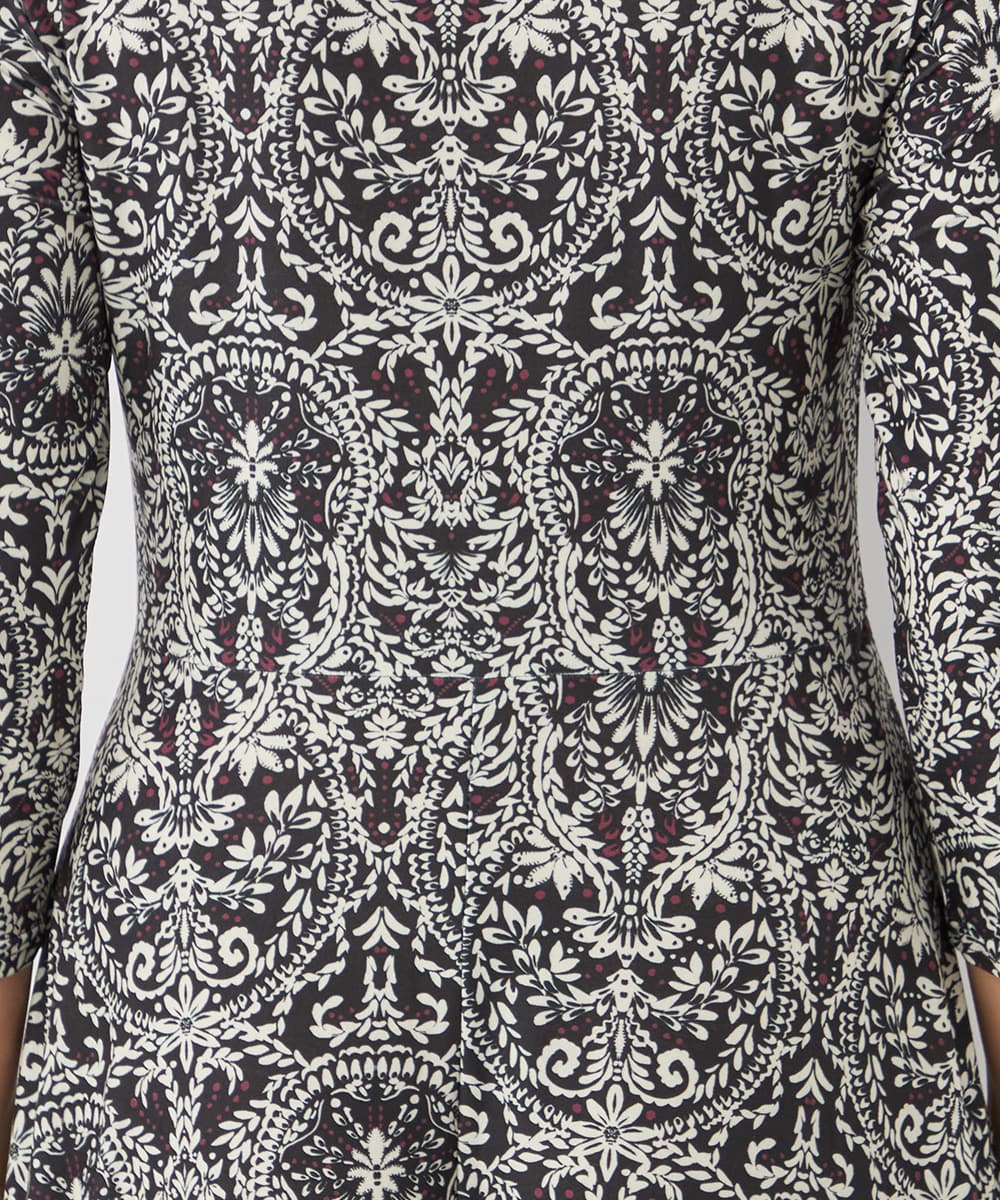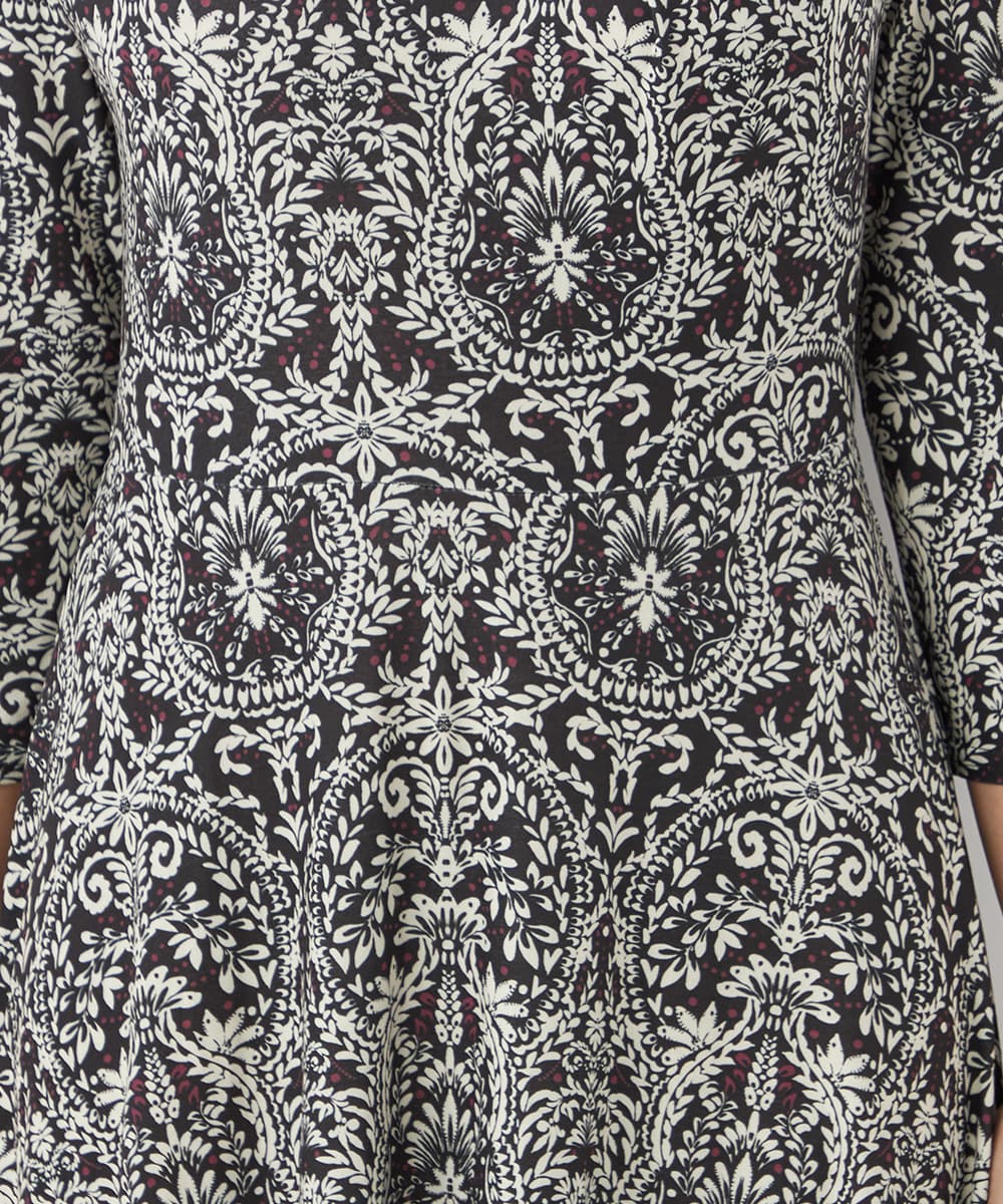 ほどよい開き具合のネックと七分袖のデザインですっきりと軽やかに着こなせます。ネック回りにはアシンメトリーなタックを施して、アクセントをプラス。ウエストから裾にかけてのフレア感がエレガントな印象です。ソフトで心地よい風合いのジャージ素材を使用しています。