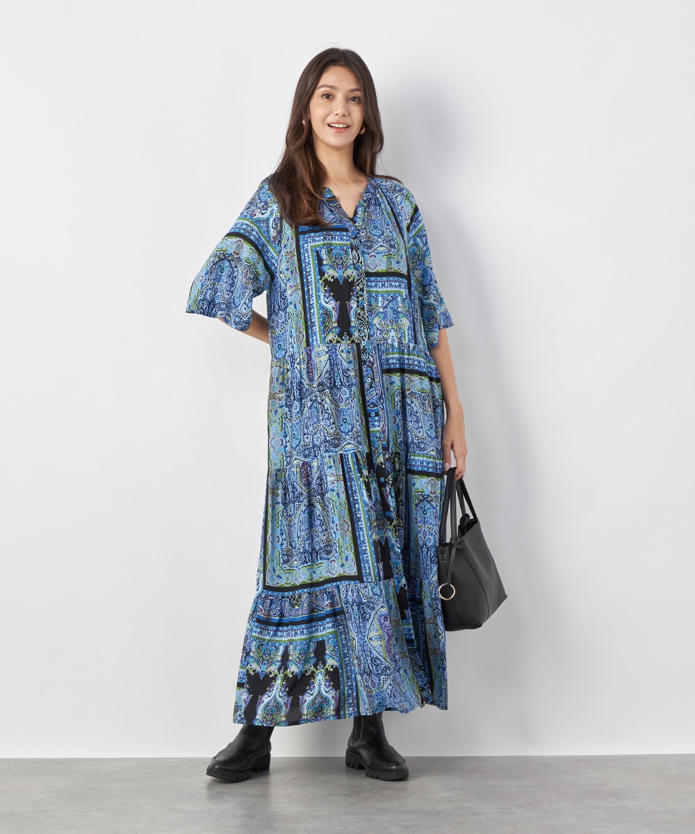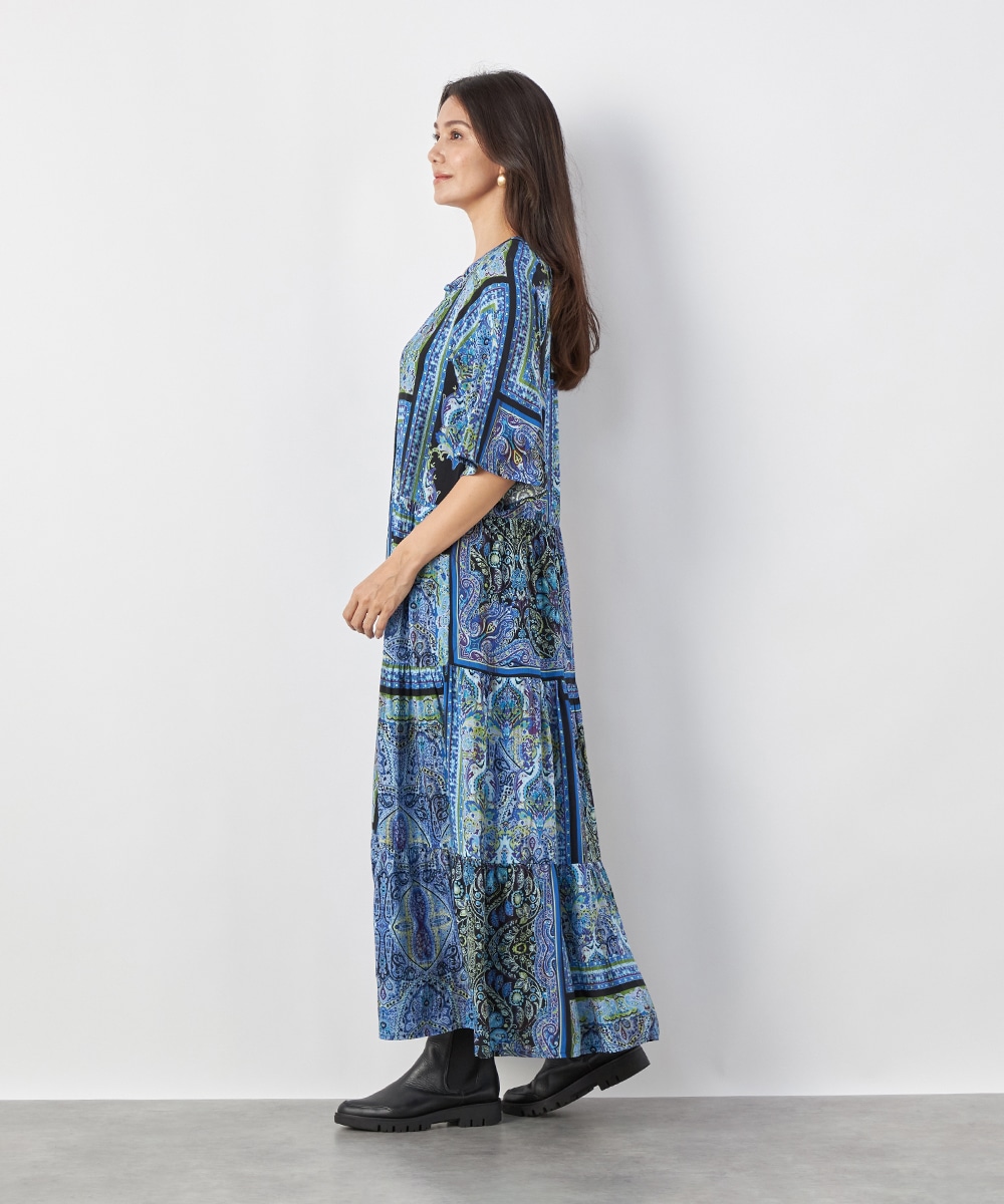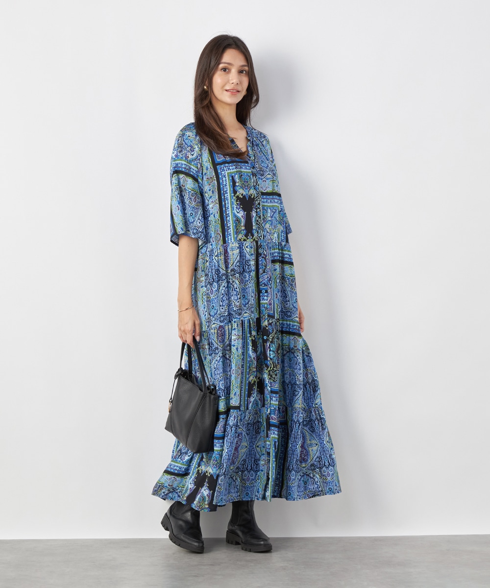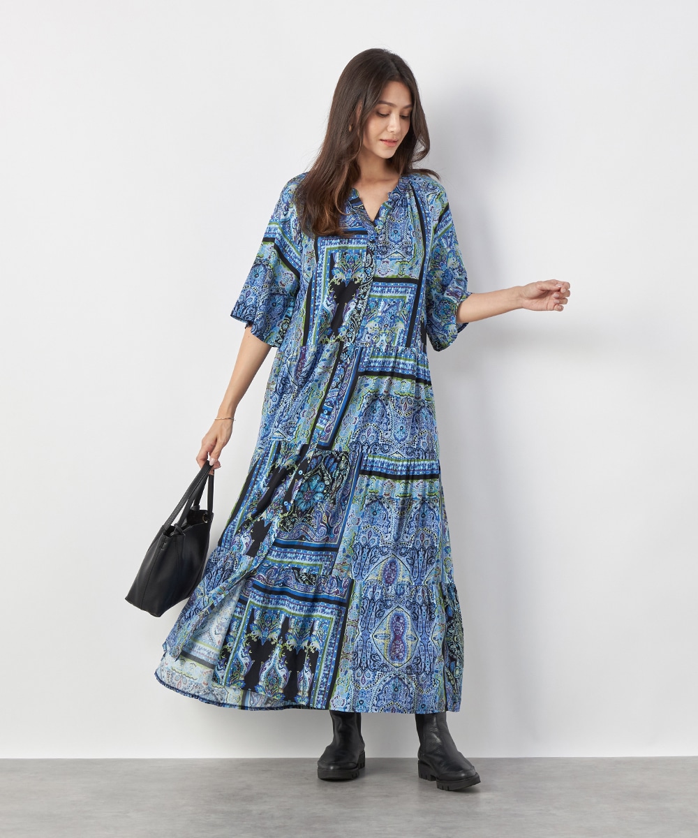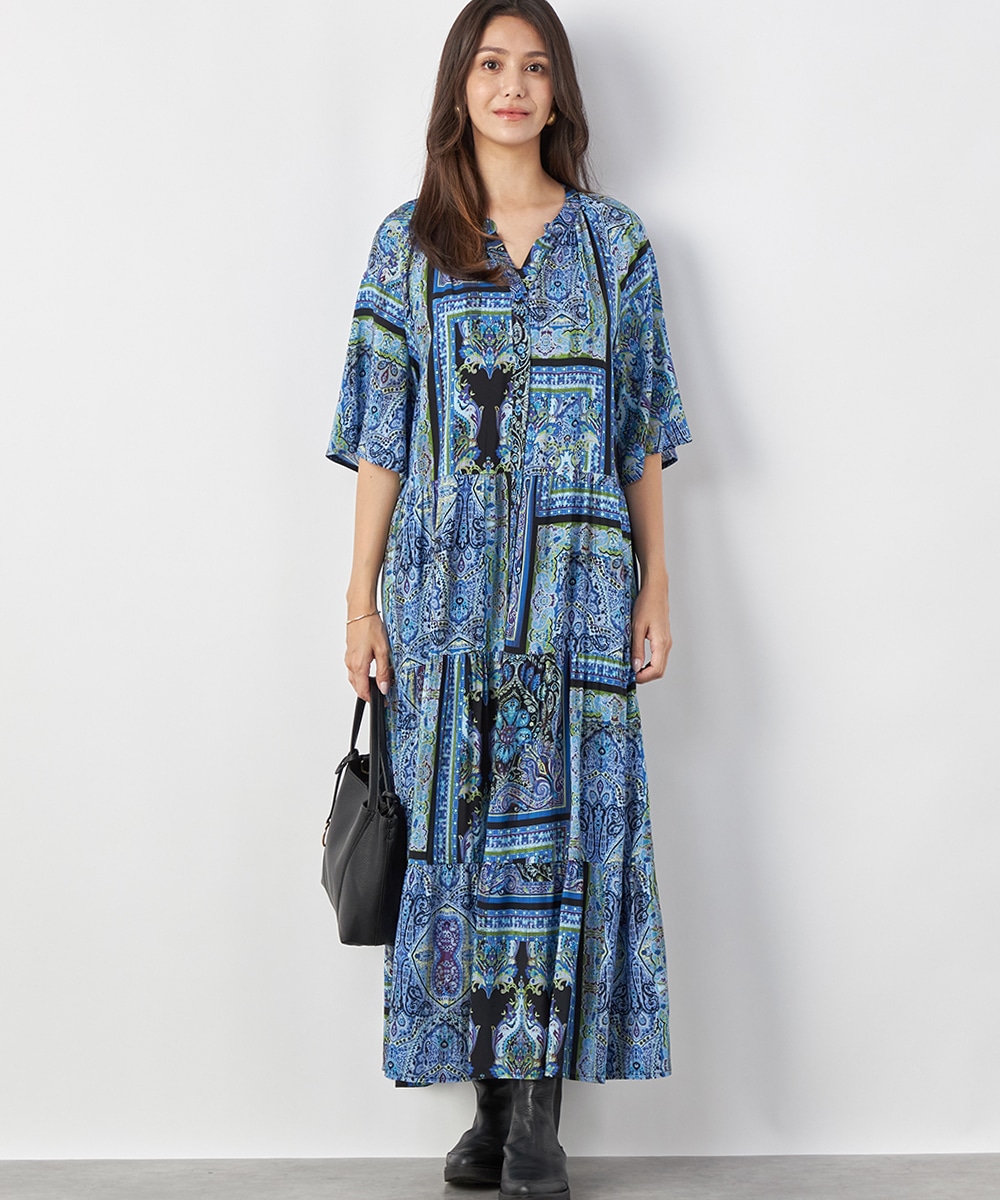 ティアード切り替えのボリューム感がかわいいワンピース。ロング丈のデザインで大人っぽさも併せ持ちます。ネックのV字型のカッティングや立ち襟により、フェイスラインはすっきりとした印象です。清潔感があって爽やかなブルー系のカラーリングでまとめています。前あきなので、羽織のように着ても◎。