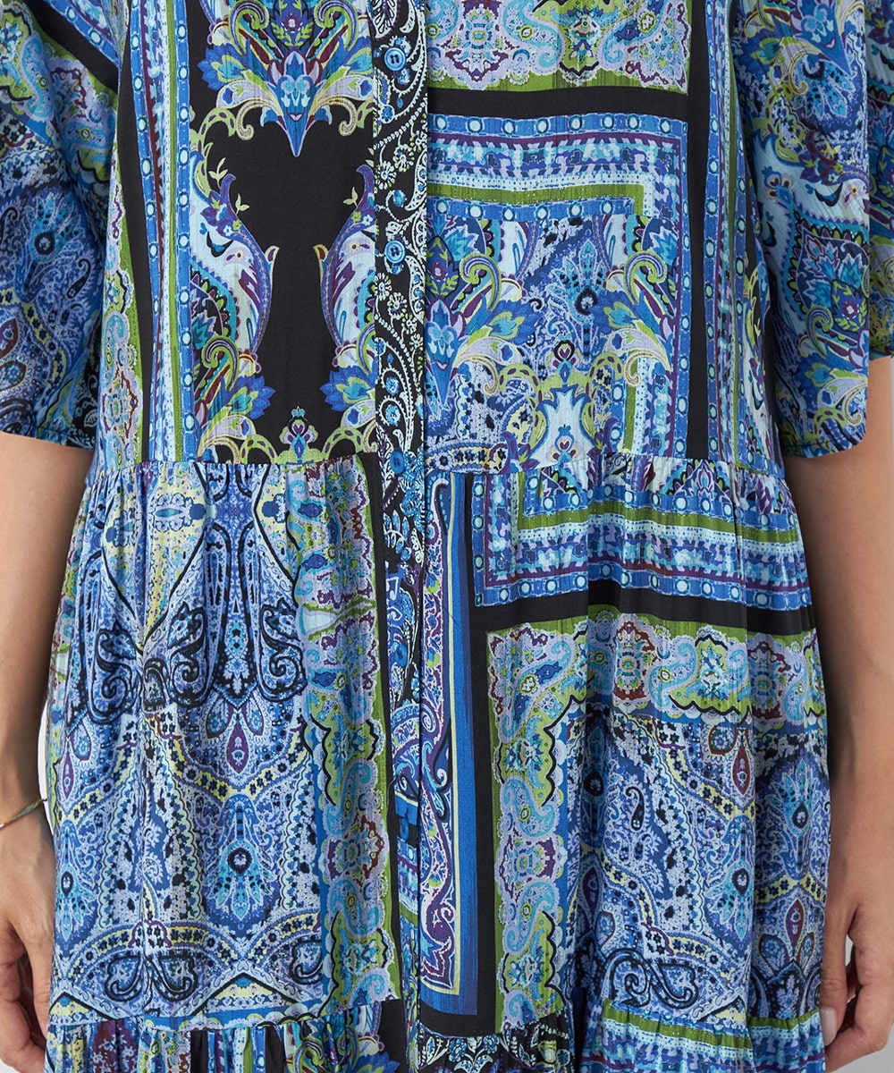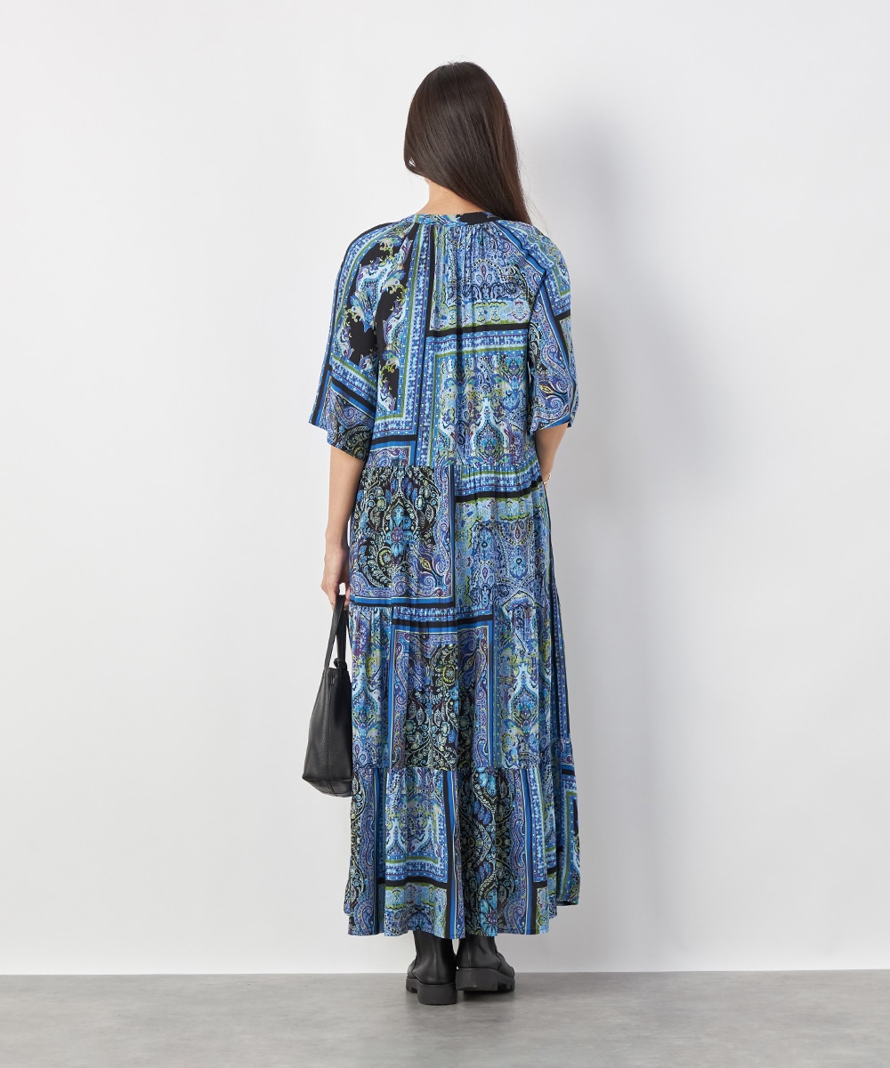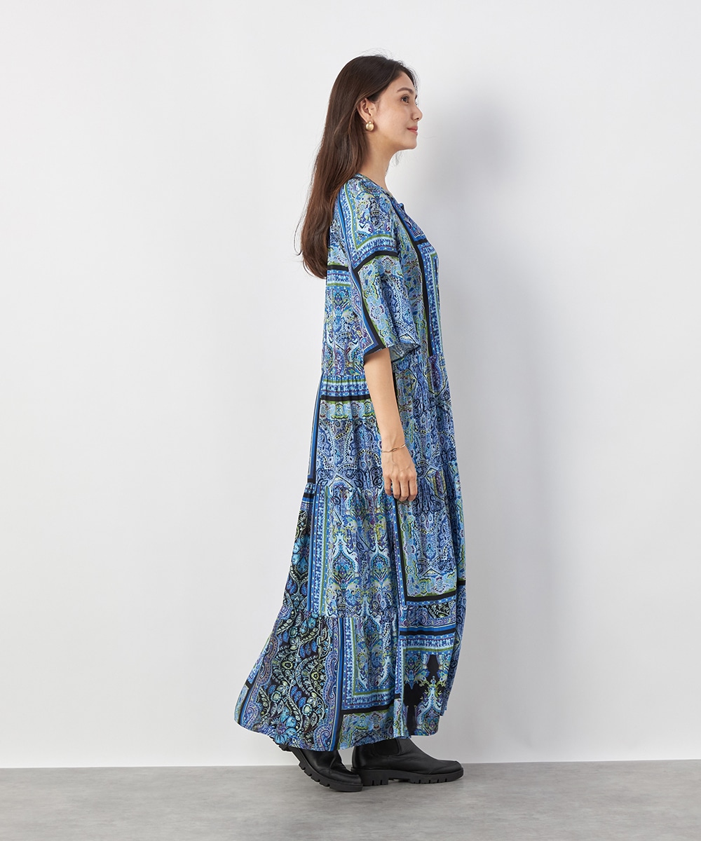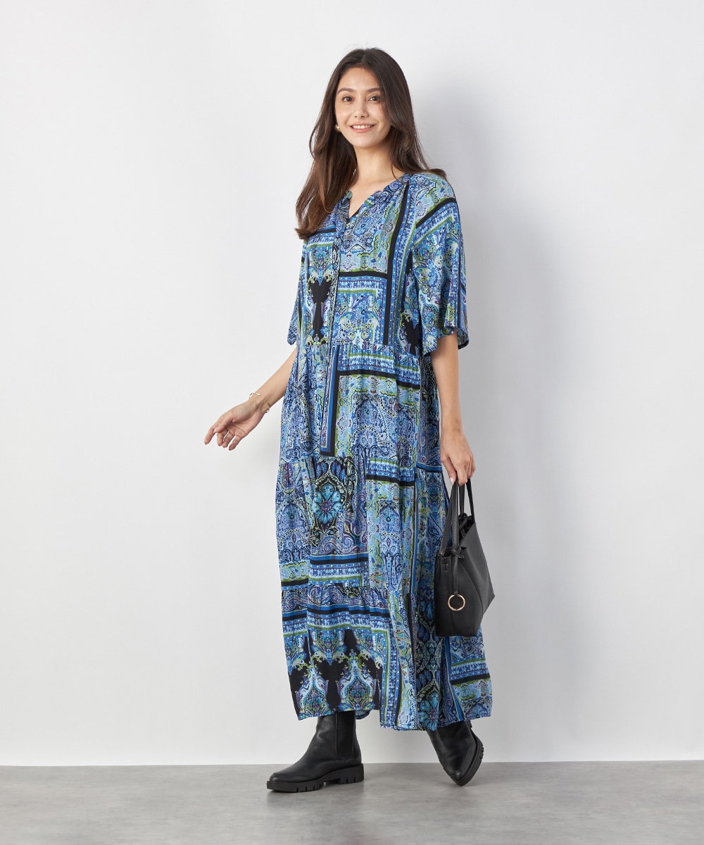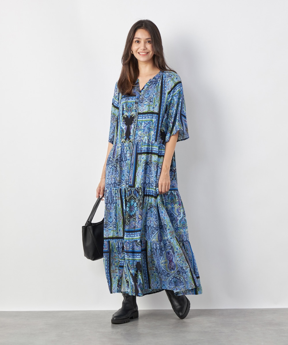 ティアード切り替えのボリューム感がかわいいワンピース。ロング丈のデザインで大人っぽさも併せ持ちます。ネックのV字型のカッティングや立ち襟により、フェイスラインはすっきりとした印象です。清潔感があって爽やかなブルー系のカラーリングでまとめています。前あきなので、羽織のように着ても◎。