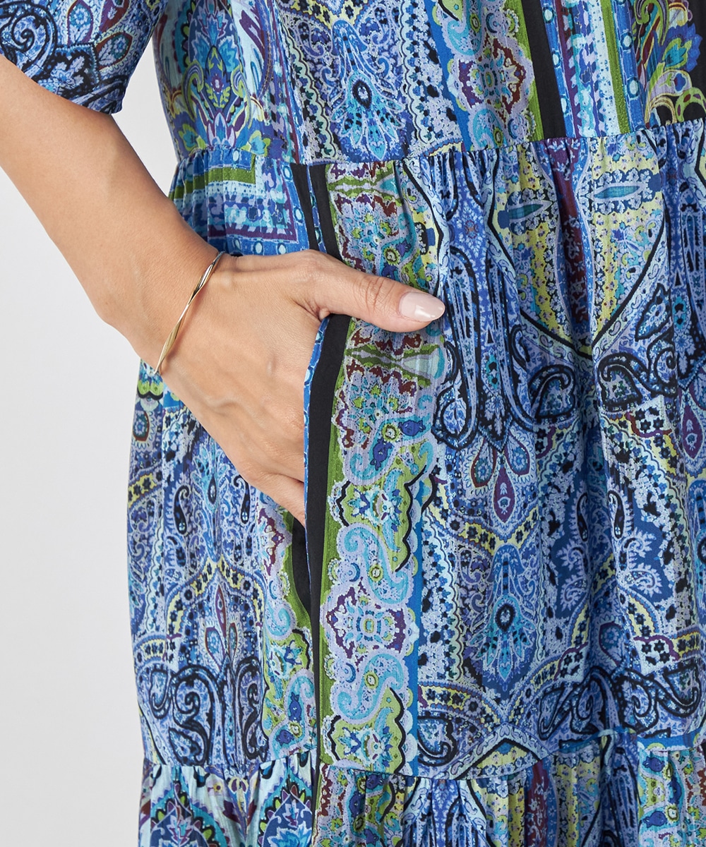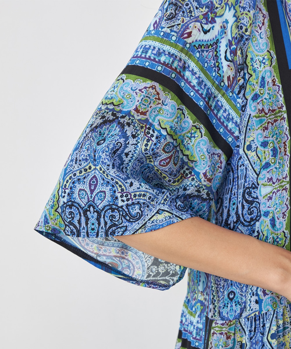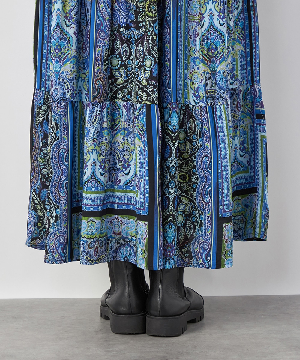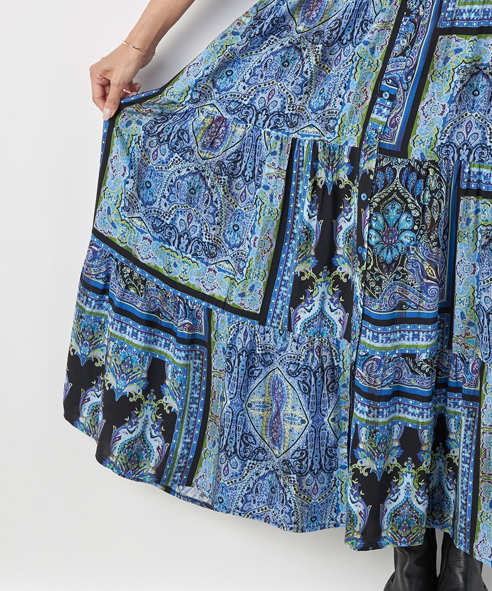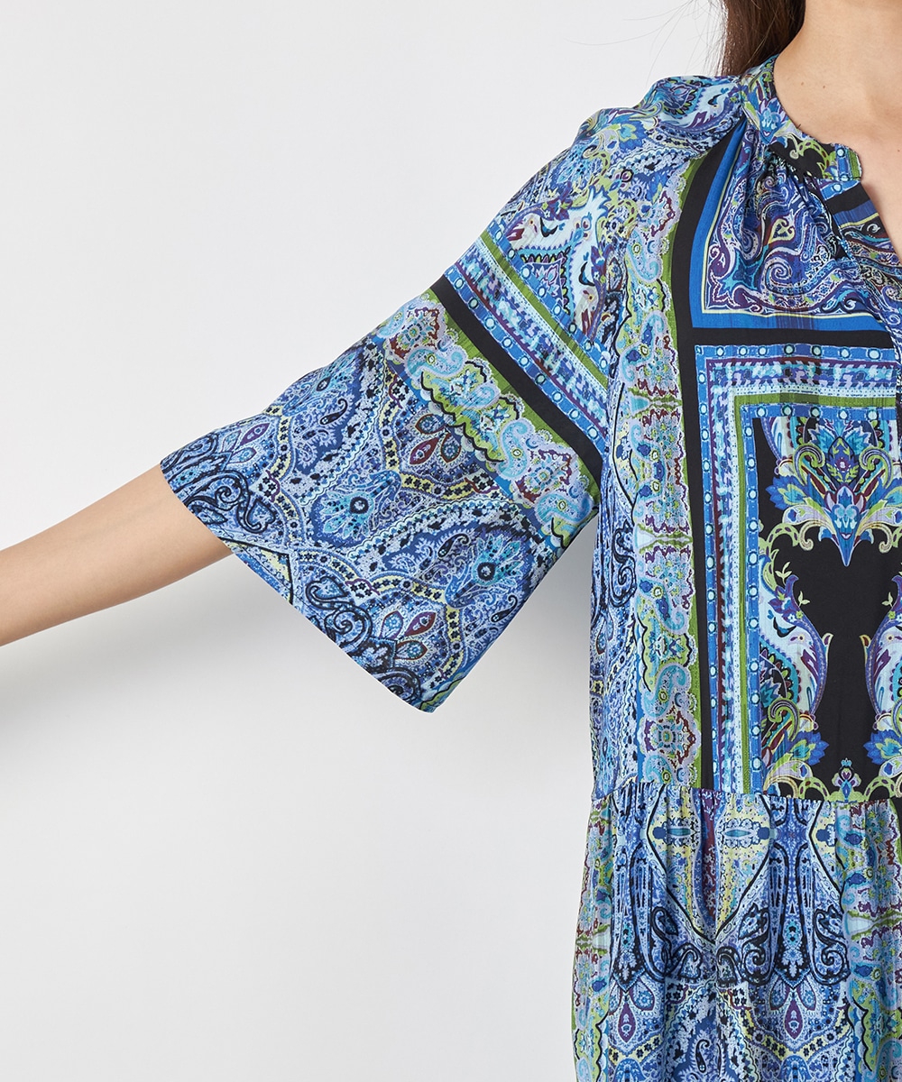 ティアード切り替えのボリューム感がかわいいワンピース。ロング丈のデザインで大人っぽさも併せ持ちます。ネックのV字型のカッティングや立ち襟により、フェイスラインはすっきりとした印象です。清潔感があって爽やかなブルー系のカラーリングでまとめています。前あきなので、羽織のように着ても◎。