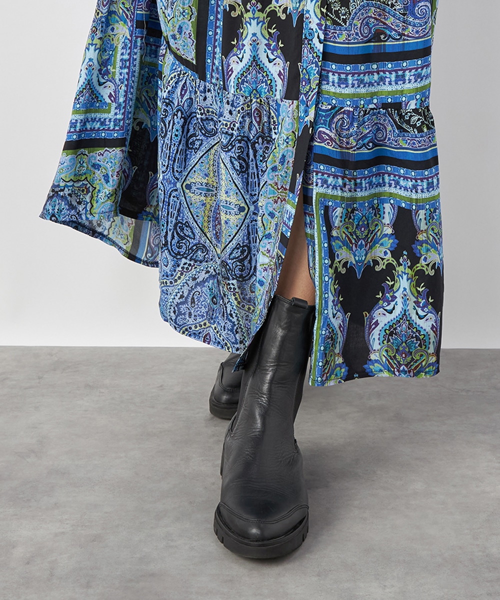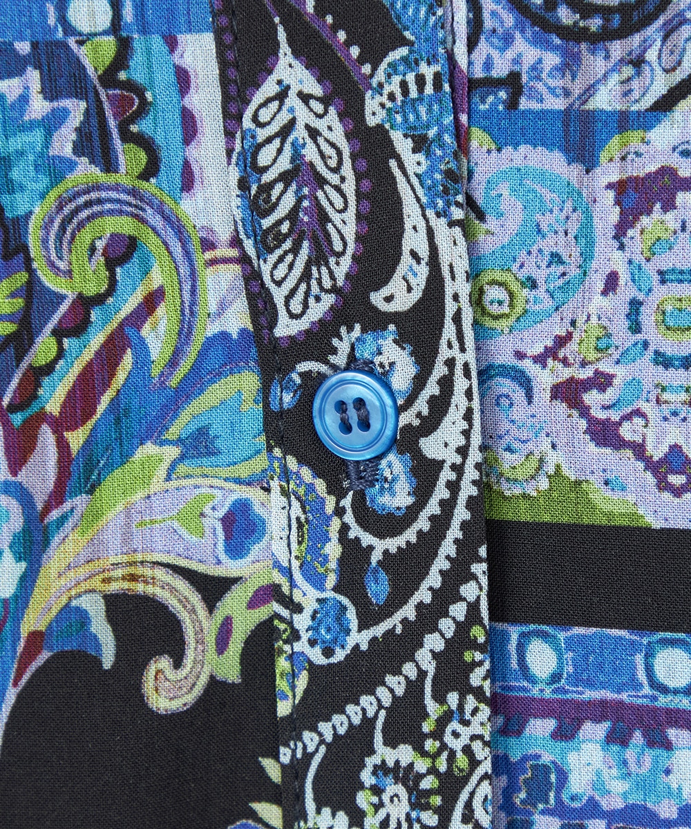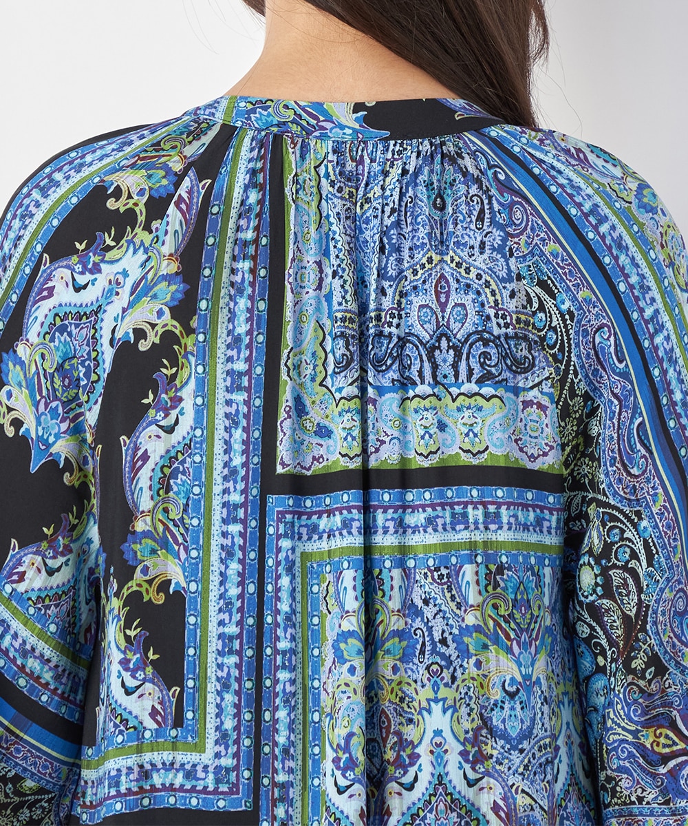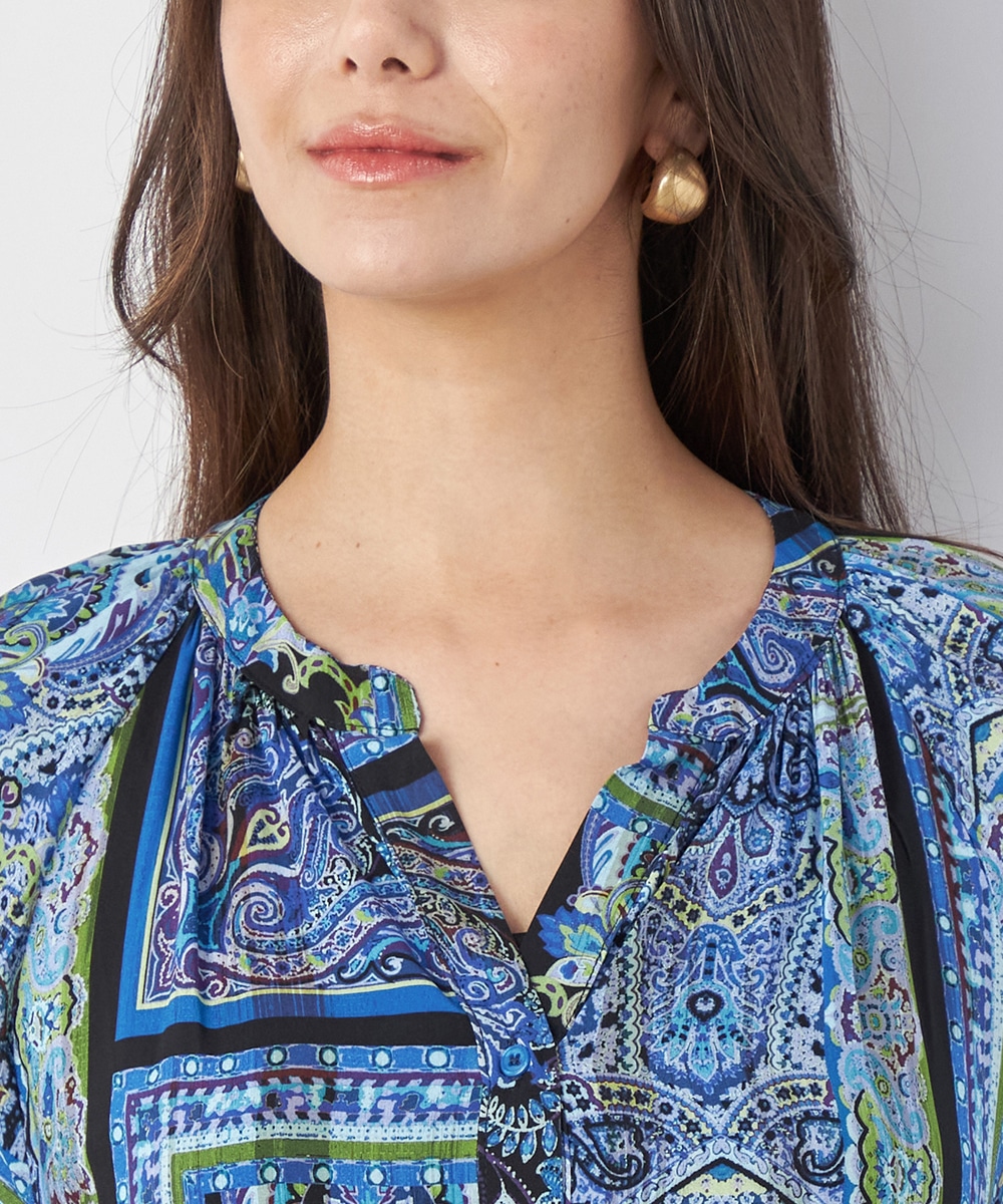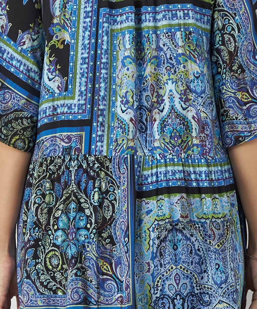 ティアード切り替えのボリューム感がかわいいワンピース。ロング丈のデザインで大人っぽさも併せ持ちます。ネックのV字型のカッティングや立ち襟により、フェイスラインはすっきりとした印象です。清潔感があって爽やかなブルー系のカラーリングでまとめています。前あきなので、羽織のように着ても◎。