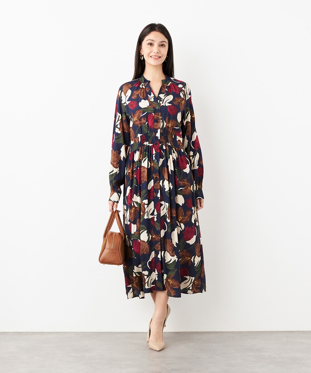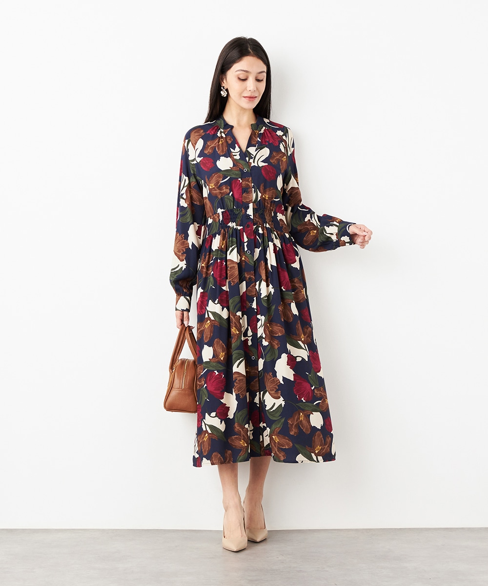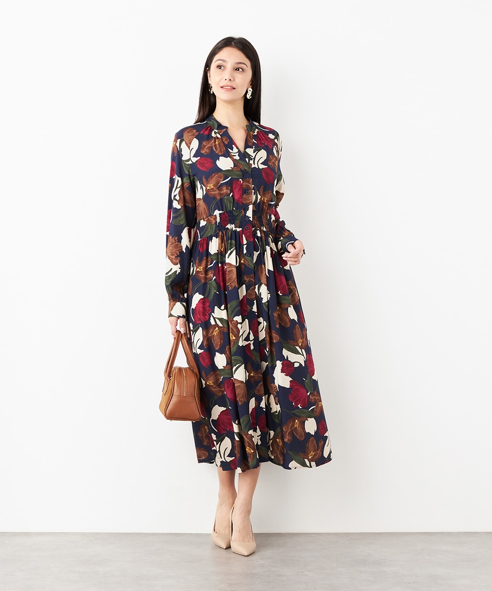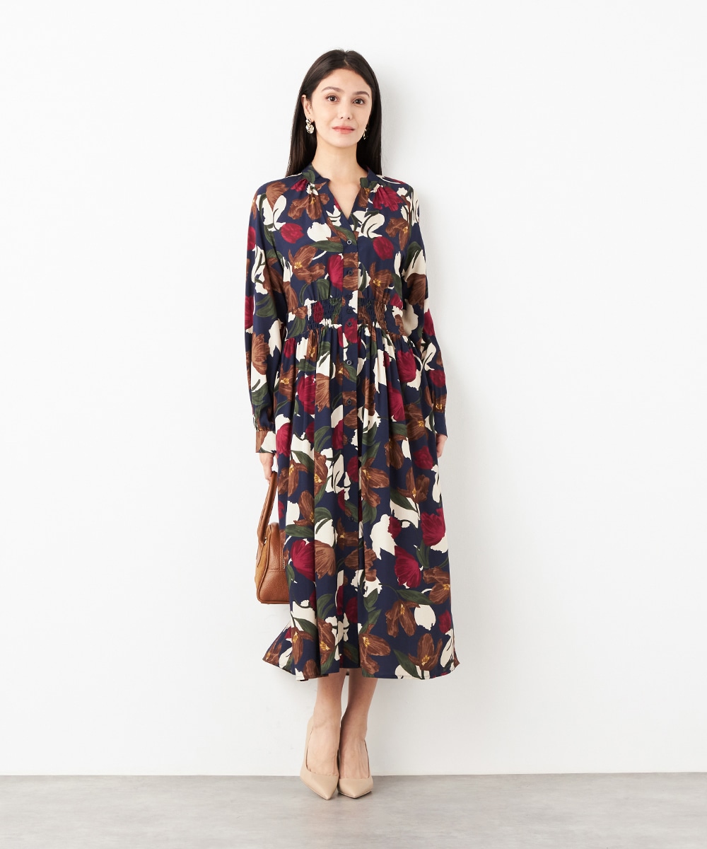 エレガントかつ華やかにまとまり、特別な場面での着用もおすすめのデザインです。Vネックに立ち襟でフェイスラインがすっきりと見えるのも特徴。ウエストはシャーリングが施され、スタイルのメリハリが強調されています。大人っぽく品良く着こなせる長めの着丈です。