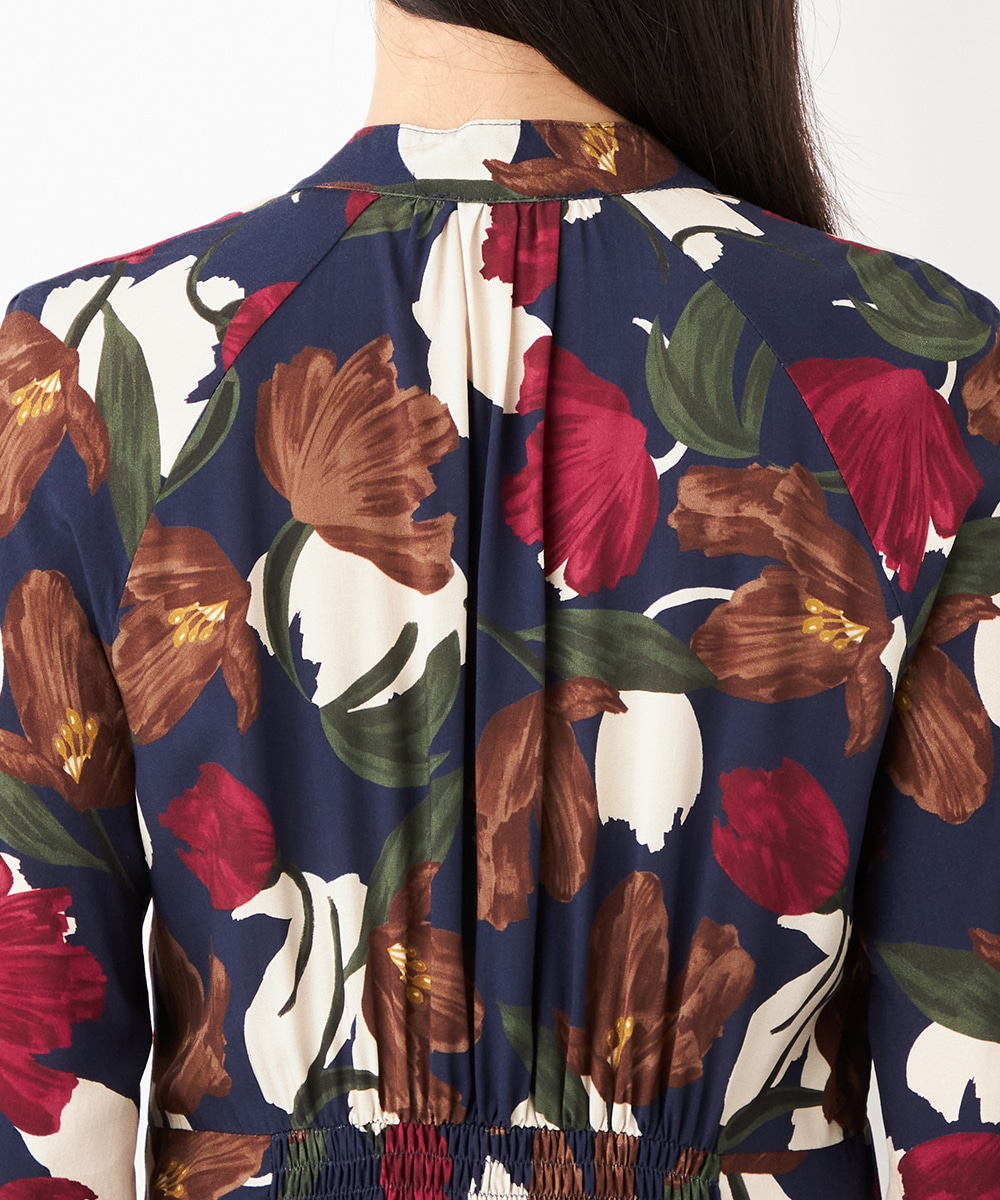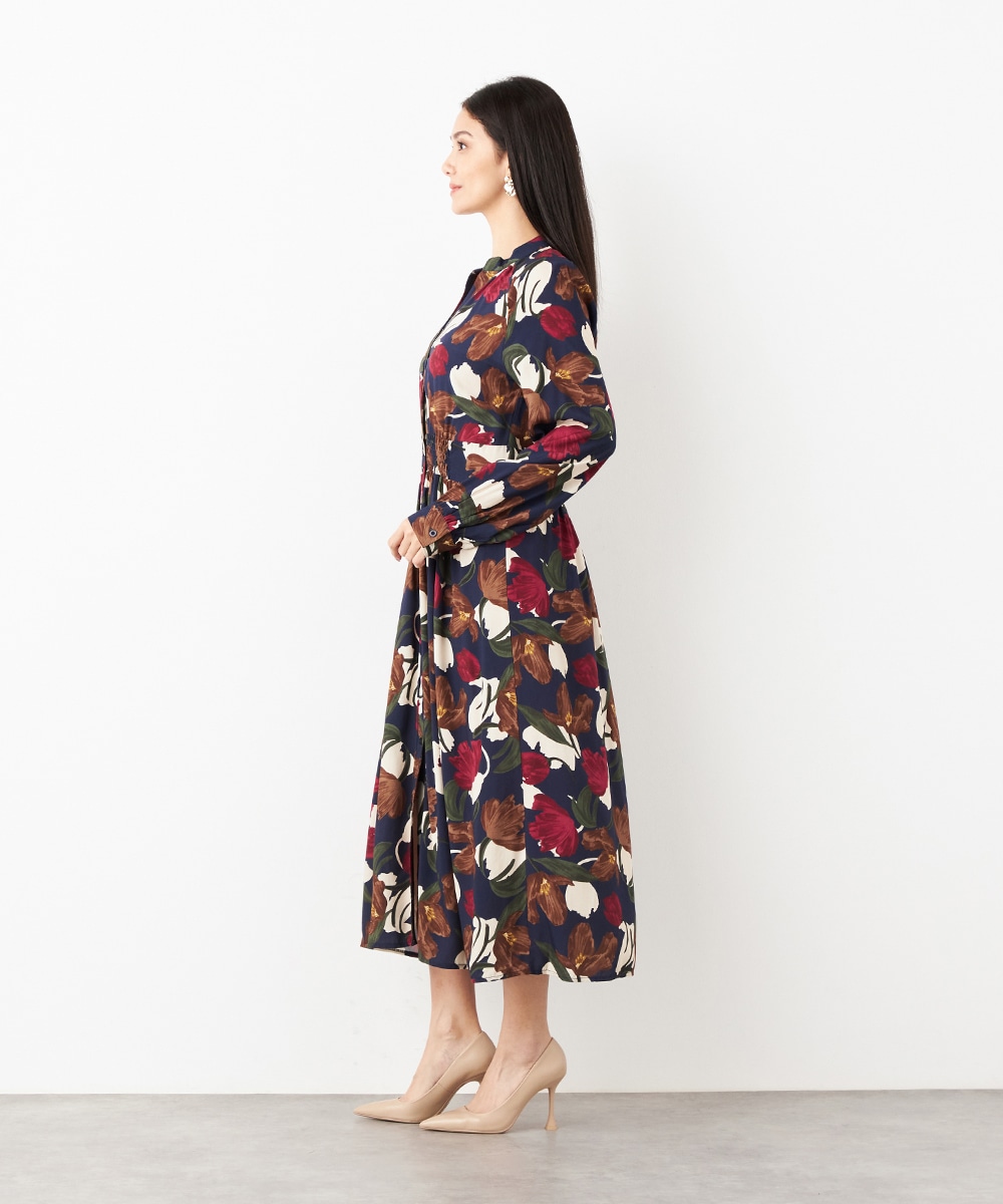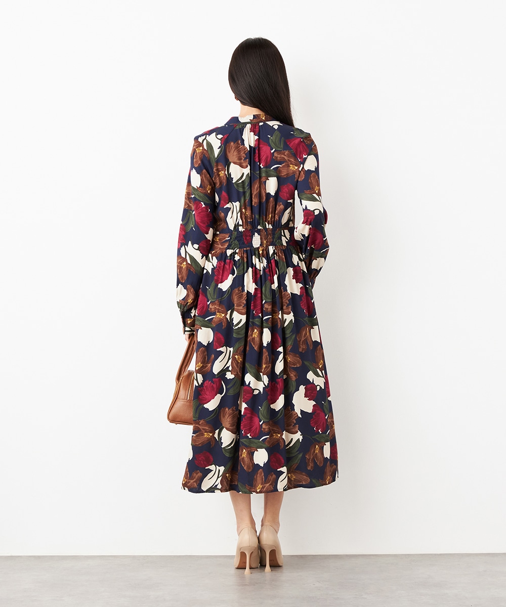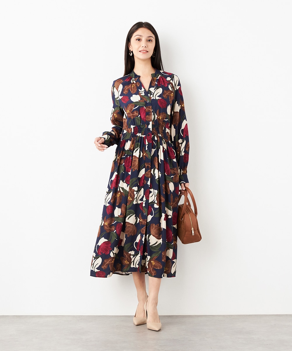 エレガントかつ華やかにまとまり、特別な場面での着用もおすすめのデザインです。Vネックに立ち襟でフェイスラインがすっきりと見えるのも特徴。ウエストはシャーリングが施され、スタイルのメリハリが強調されています。大人っぽく品良く着こなせる長めの着丈です。
