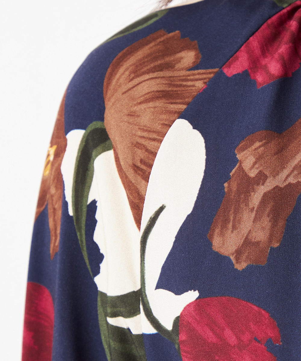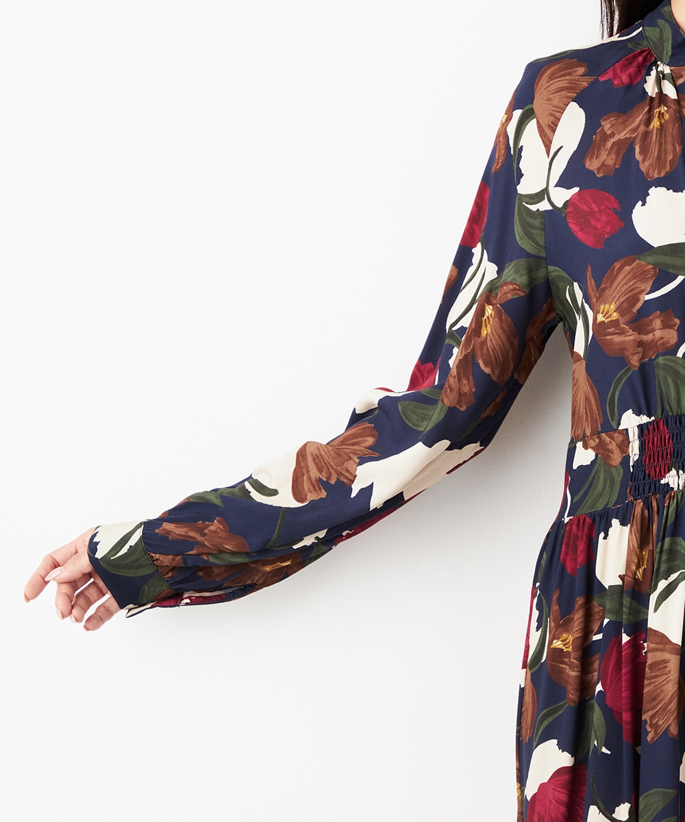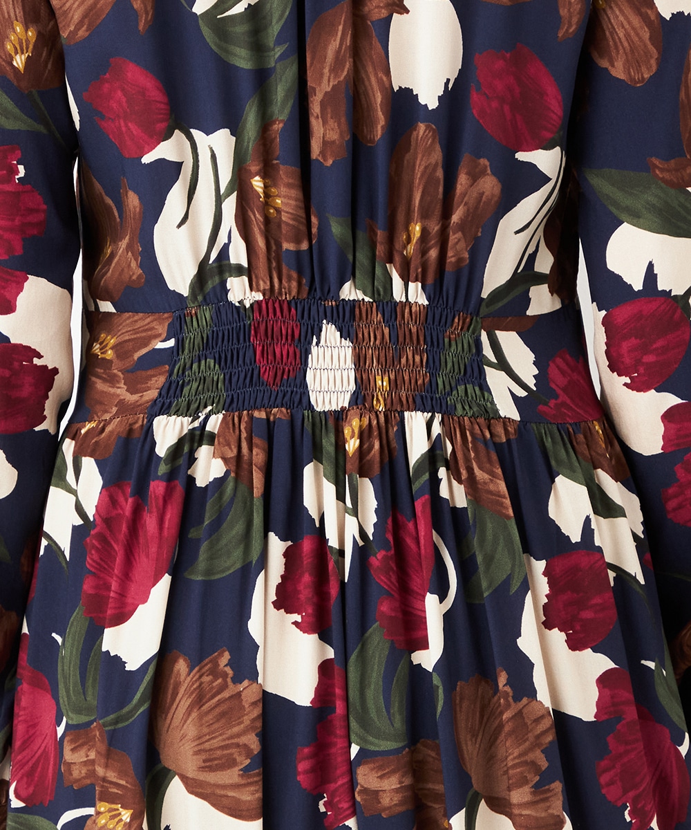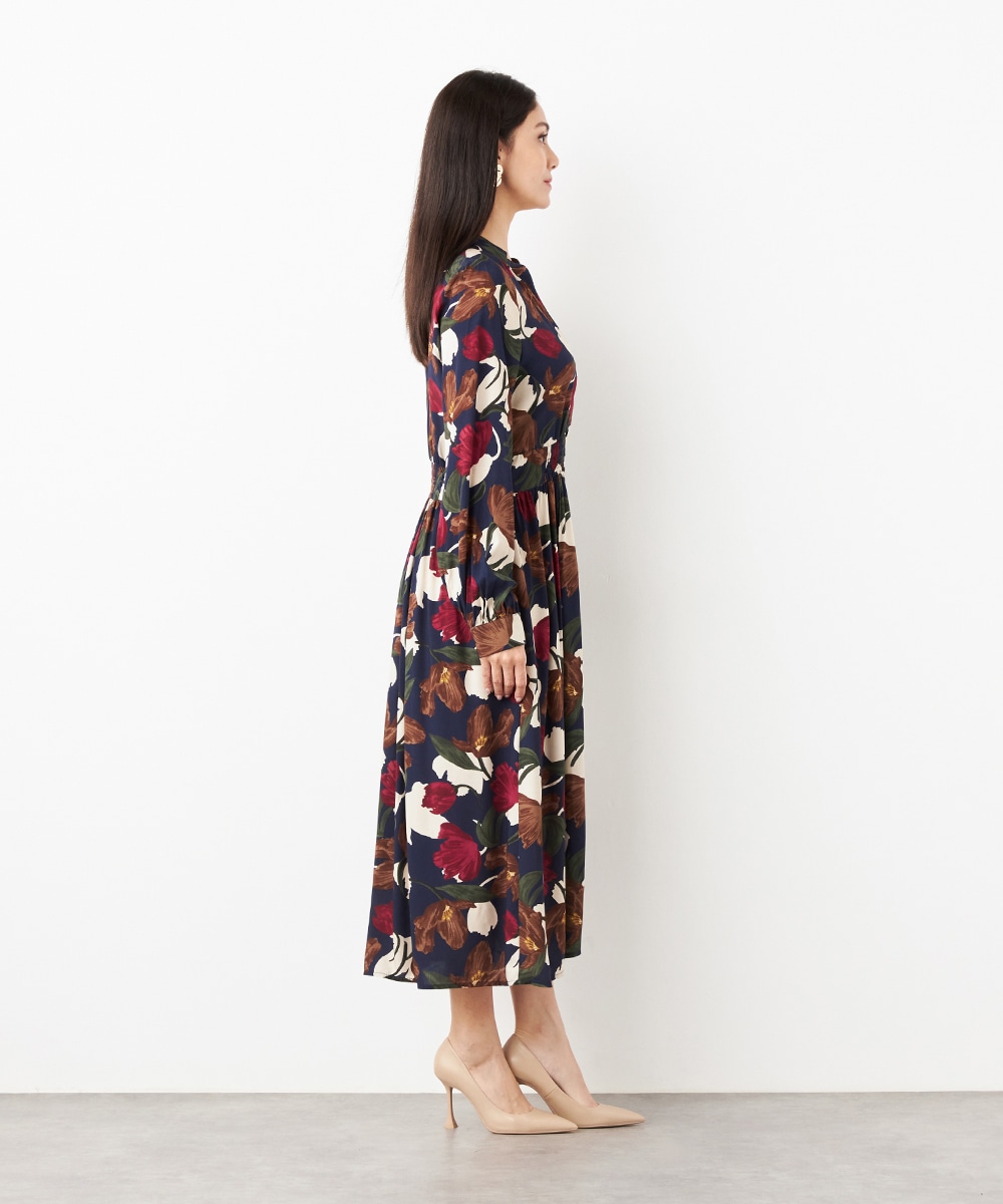 エレガントかつ華やかにまとまり、特別な場面での着用もおすすめのデザインです。Vネックに立ち襟でフェイスラインがすっきりと見えるのも特徴。ウエストはシャーリングが施され、スタイルのメリハリが強調されています。大人っぽく品良く着こなせる長めの着丈です。