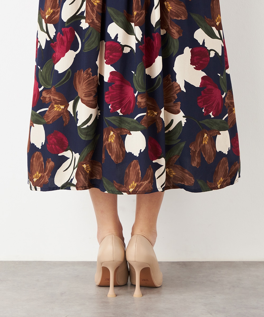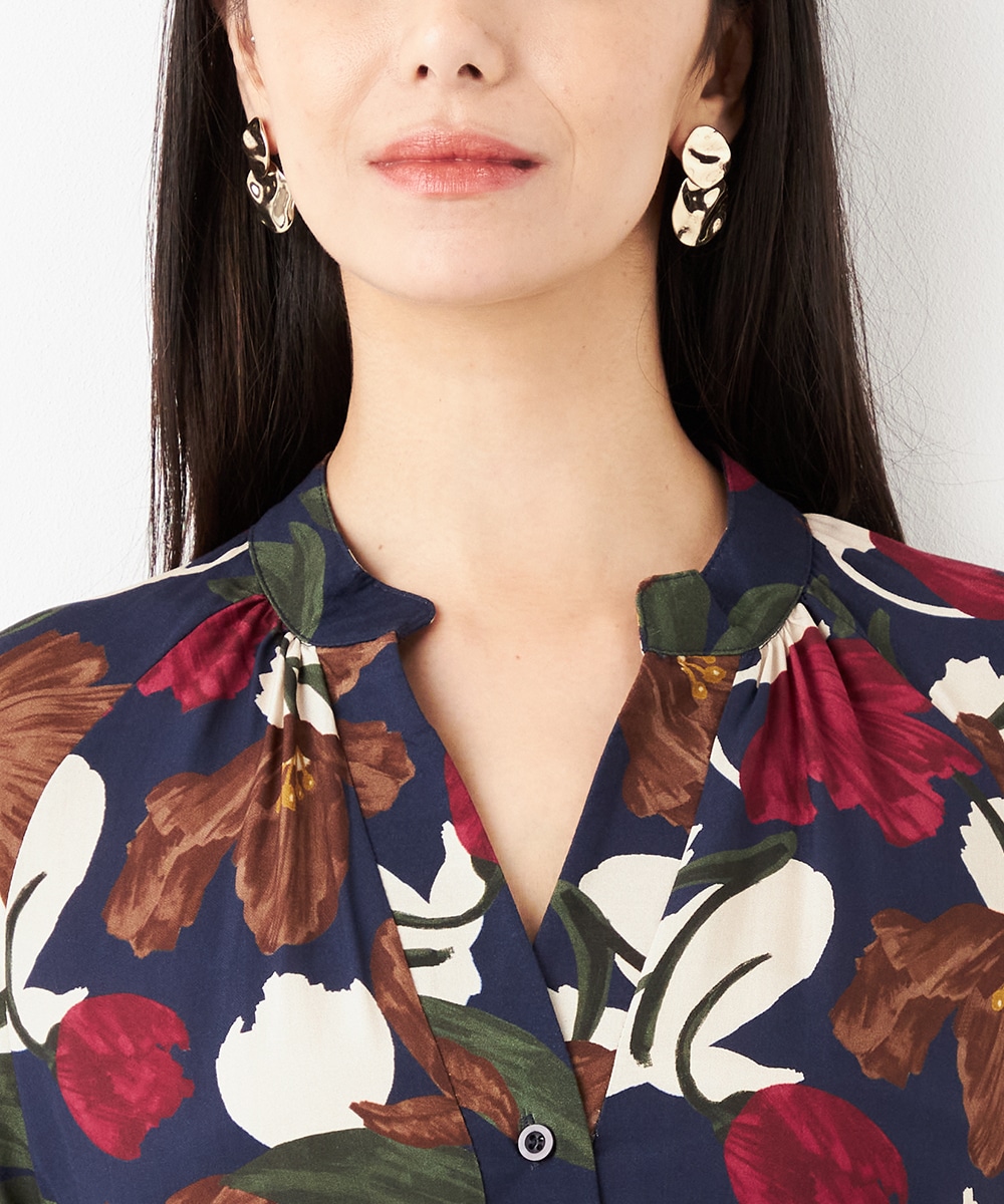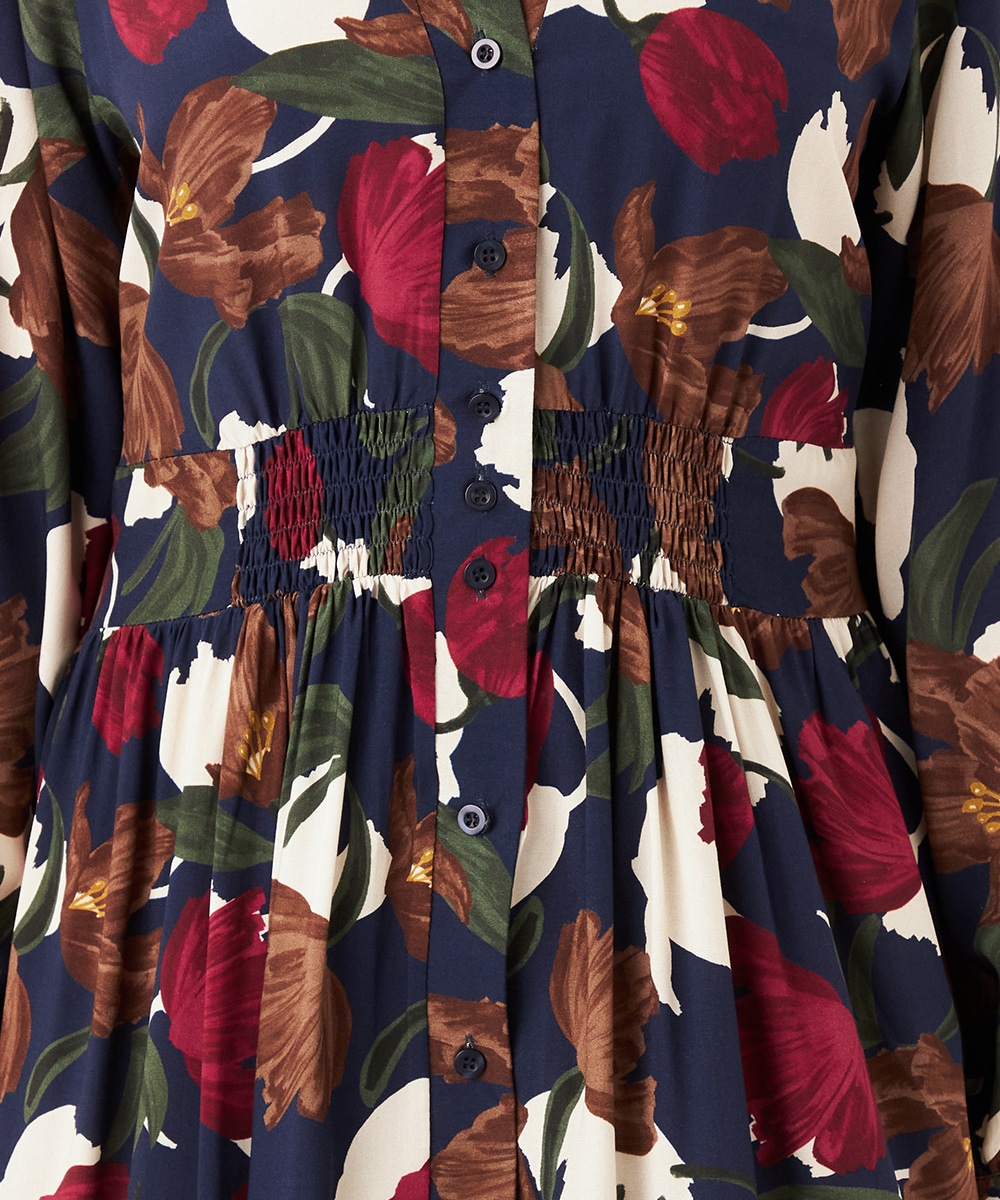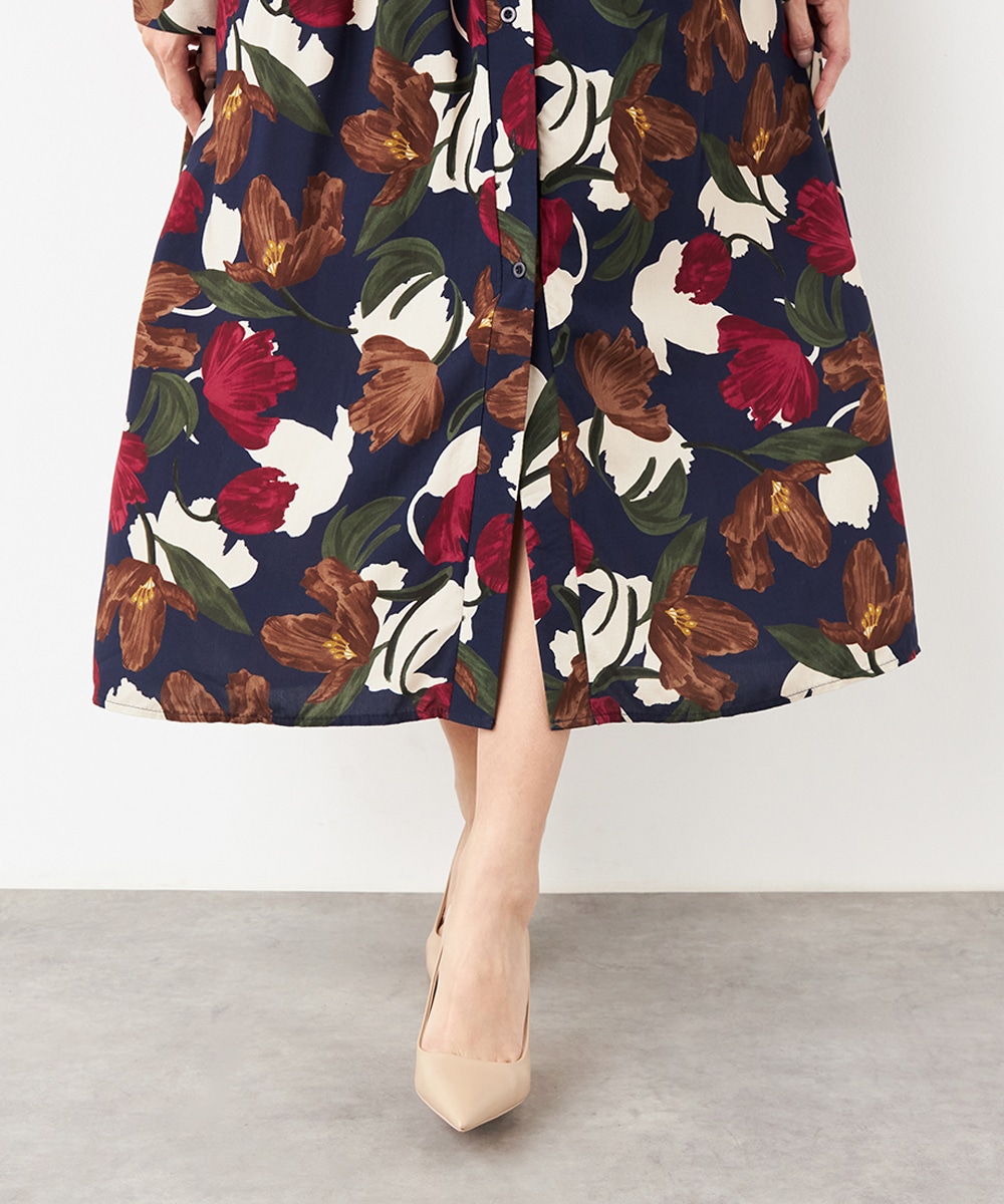 エレガントかつ華やかにまとまり、特別な場面での着用もおすすめのデザインです。Vネックに立ち襟でフェイスラインがすっきりと見えるのも特徴。ウエストはシャーリングが施され、スタイルのメリハリが強調されています。大人っぽく品良く着こなせる長めの着丈です。