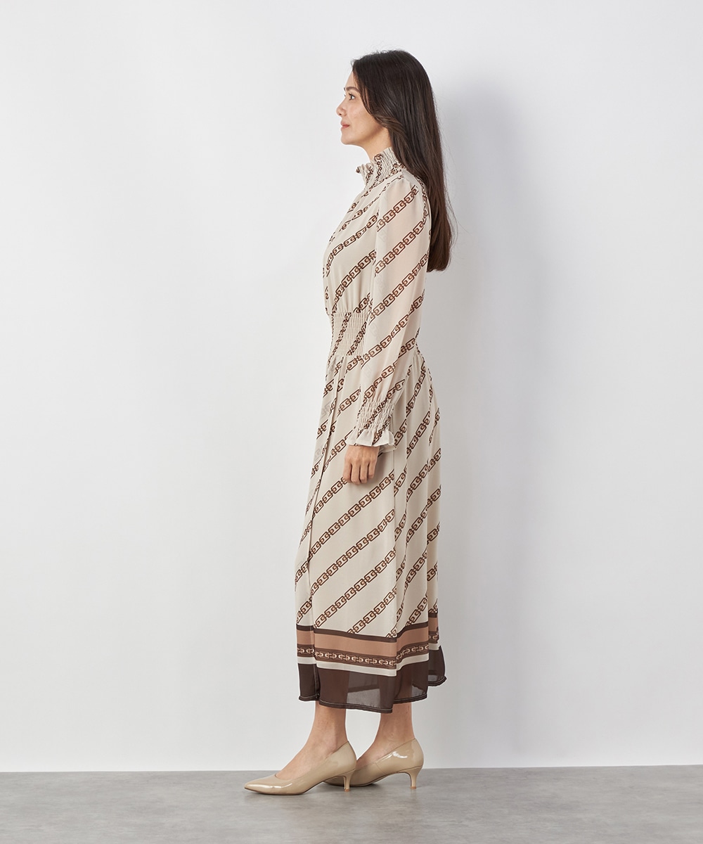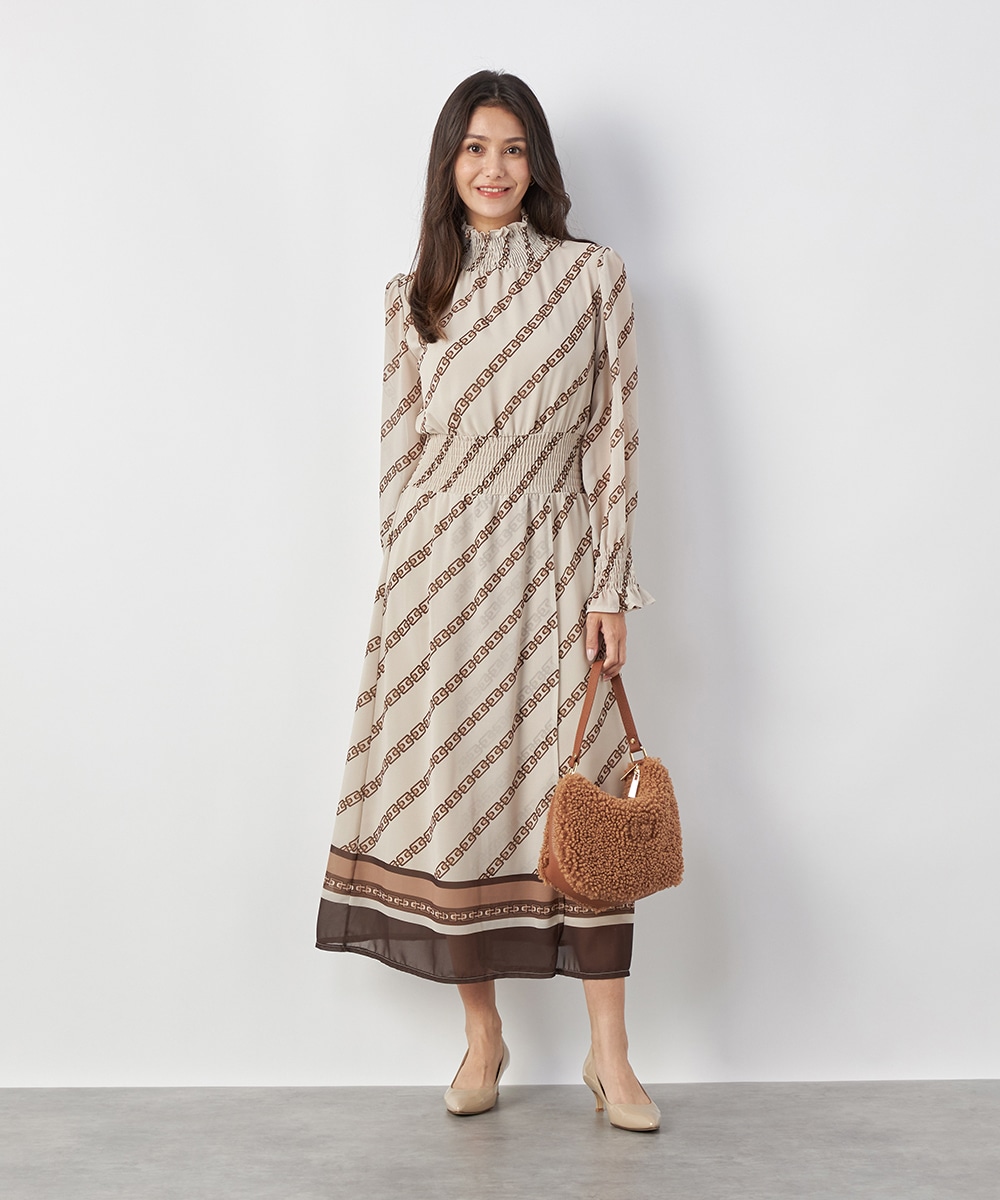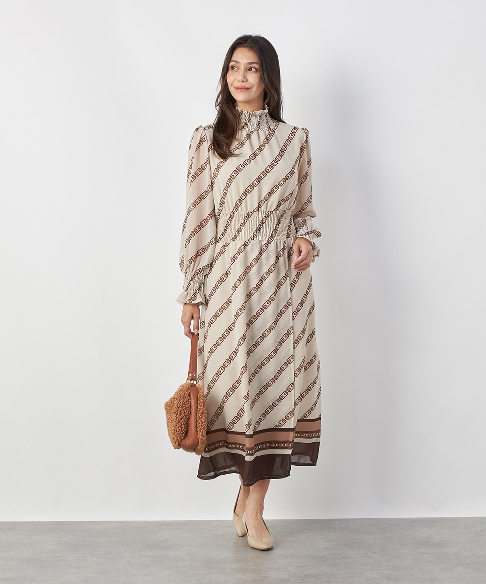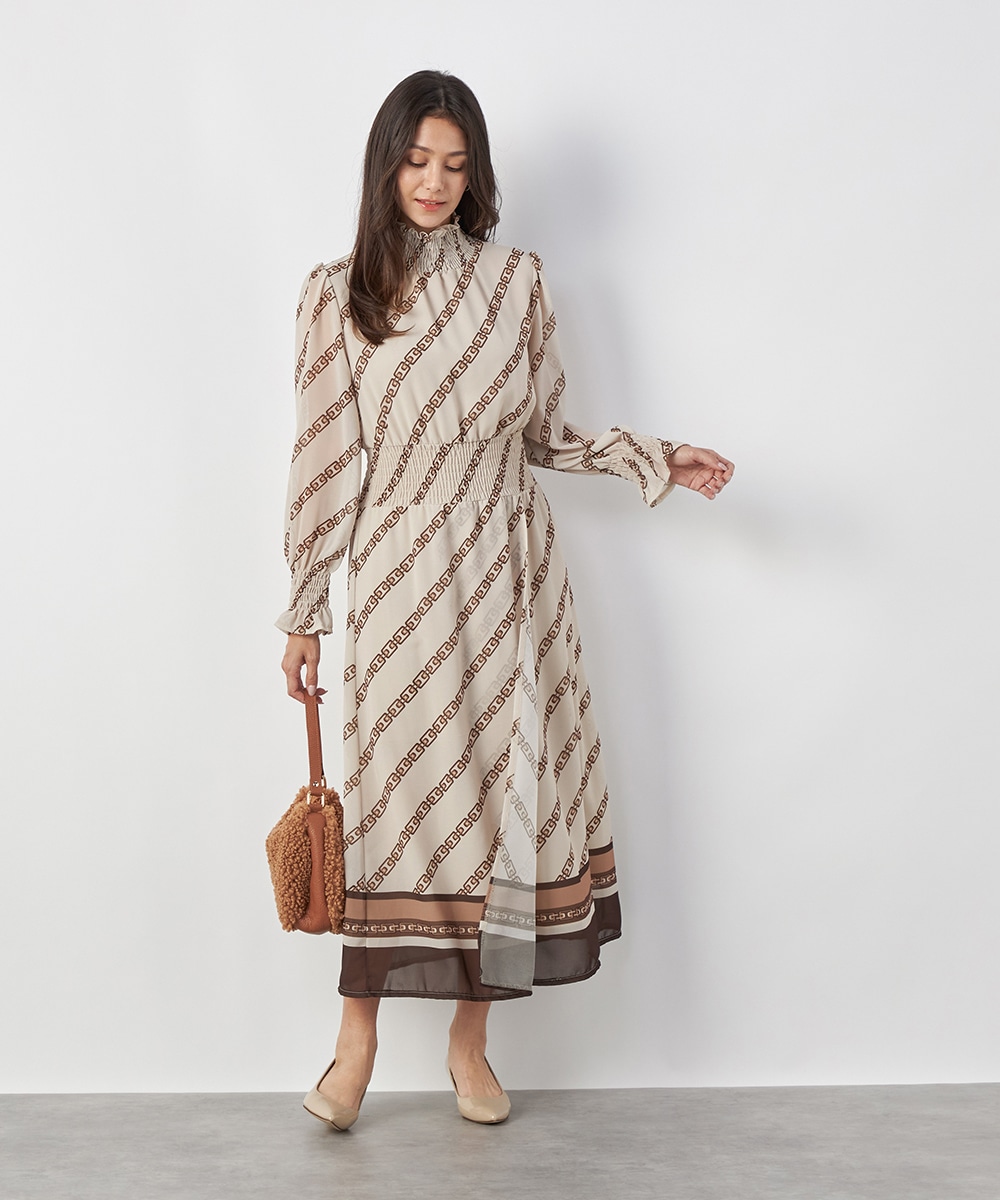 エレガントに着られるベージュベースにトレンドカラーのブラウンを組み合わせています。柄が斜めに配置されてシャープさが効いているのもデザインのポイント。裾のパネル柄が印象を引き締めます。スカート部分はラップ風の作りです。ネックとウエスト、袖口にはシャーリングを施しています。