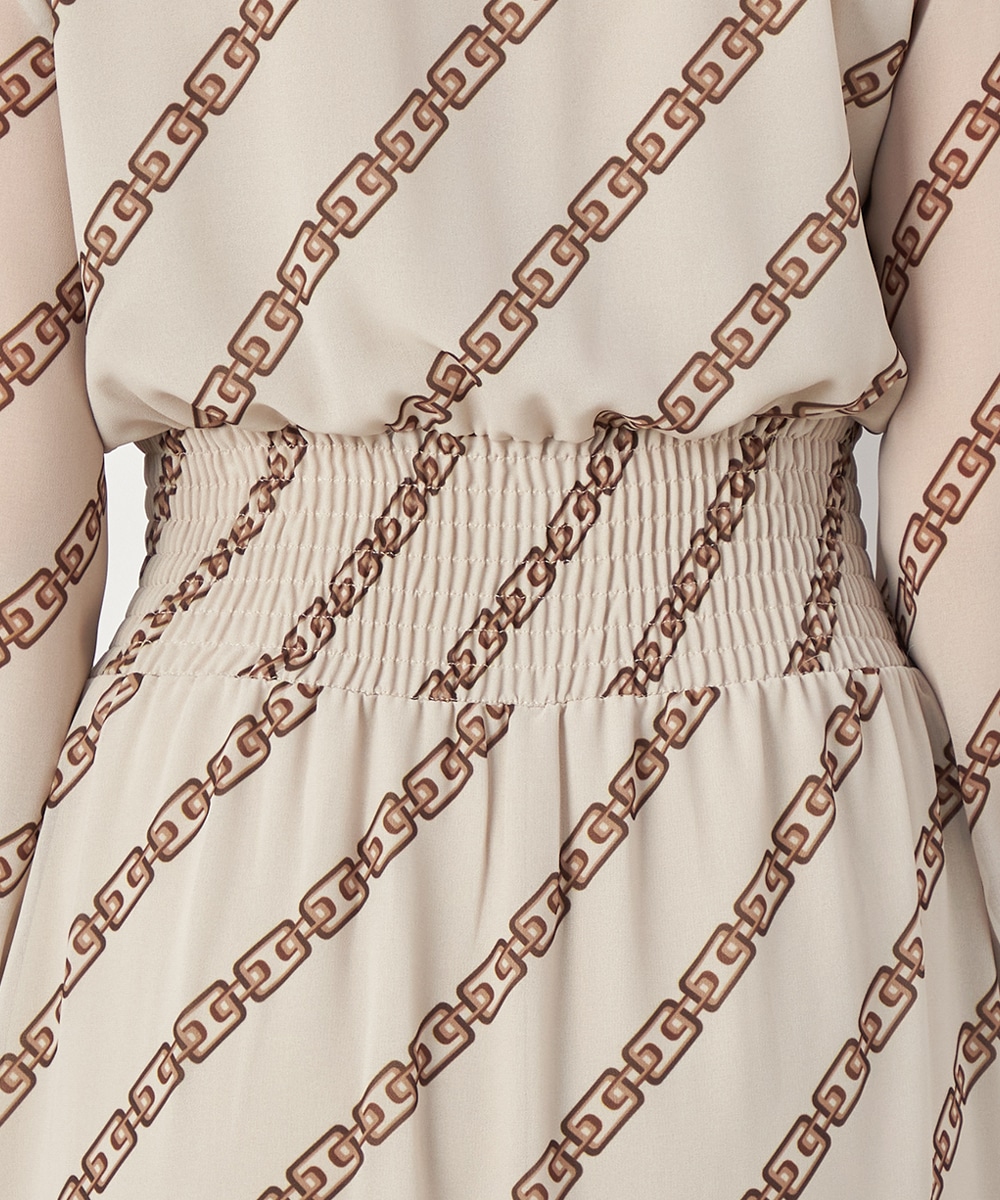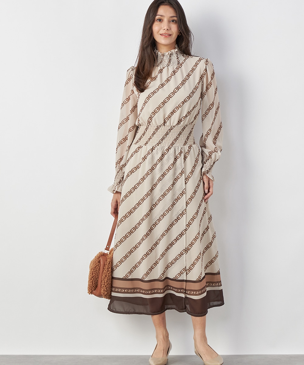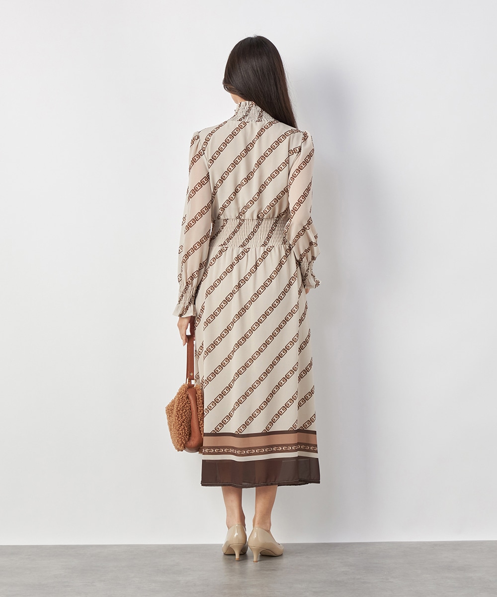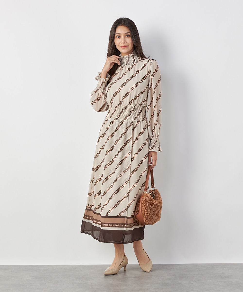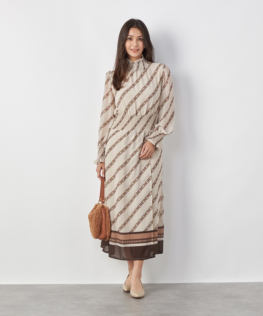 エレガントに着られるベージュベースにトレンドカラーのブラウンを組み合わせています。柄が斜めに配置されてシャープさが効いているのもデザインのポイント。裾のパネル柄が印象を引き締めます。スカート部分はラップ風の作りです。ネックとウエスト、袖口にはシャーリングを施しています。