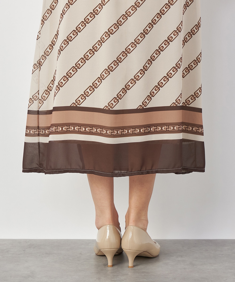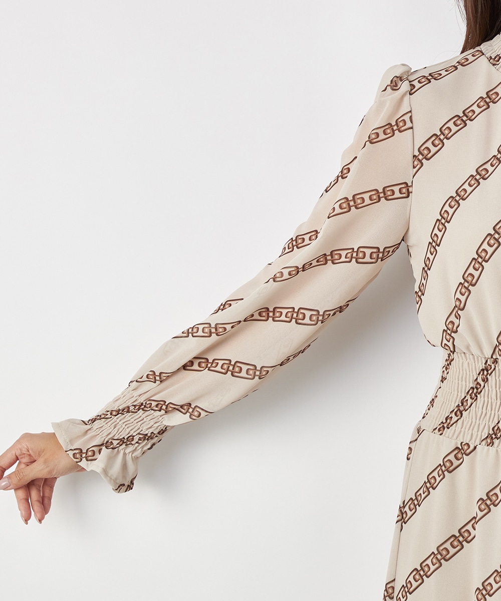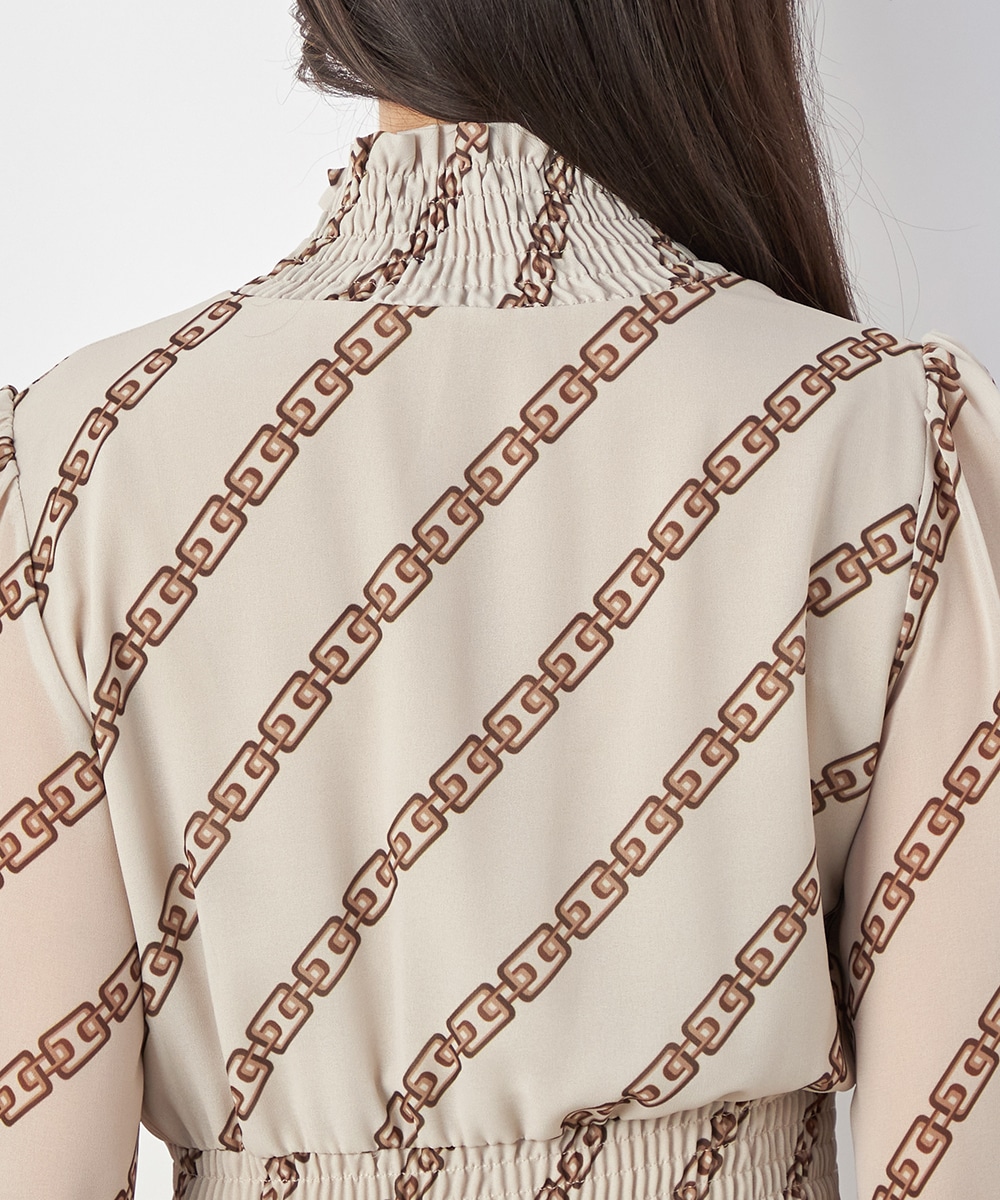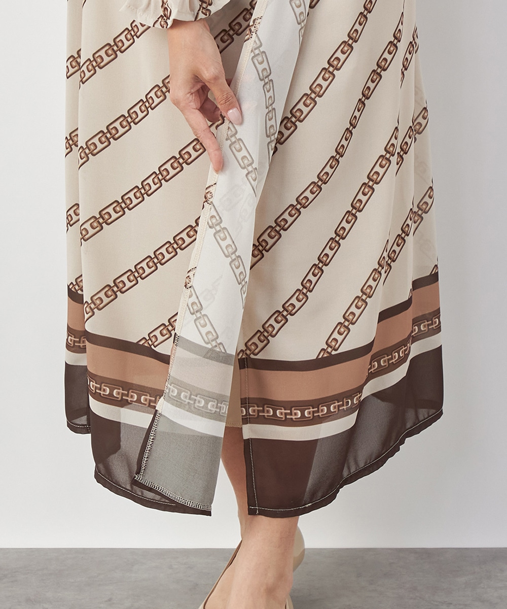 エレガントに着られるベージュベースにトレンドカラーのブラウンを組み合わせています。柄が斜めに配置されてシャープさが効いているのもデザインのポイント。裾のパネル柄が印象を引き締めます。スカート部分はラップ風の作りです。ネックとウエスト、袖口にはシャーリングを施しています。
