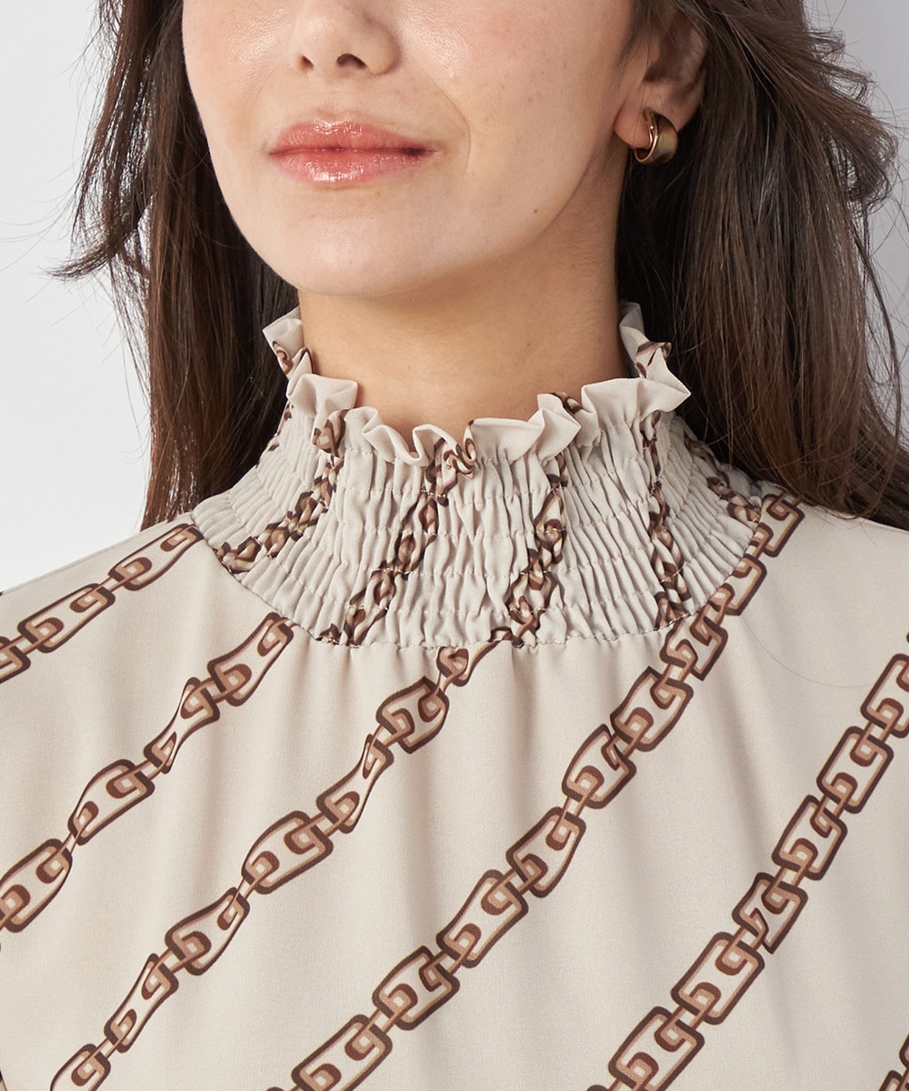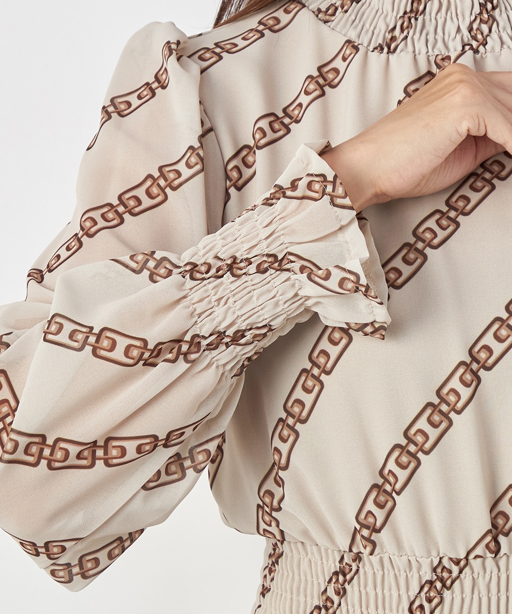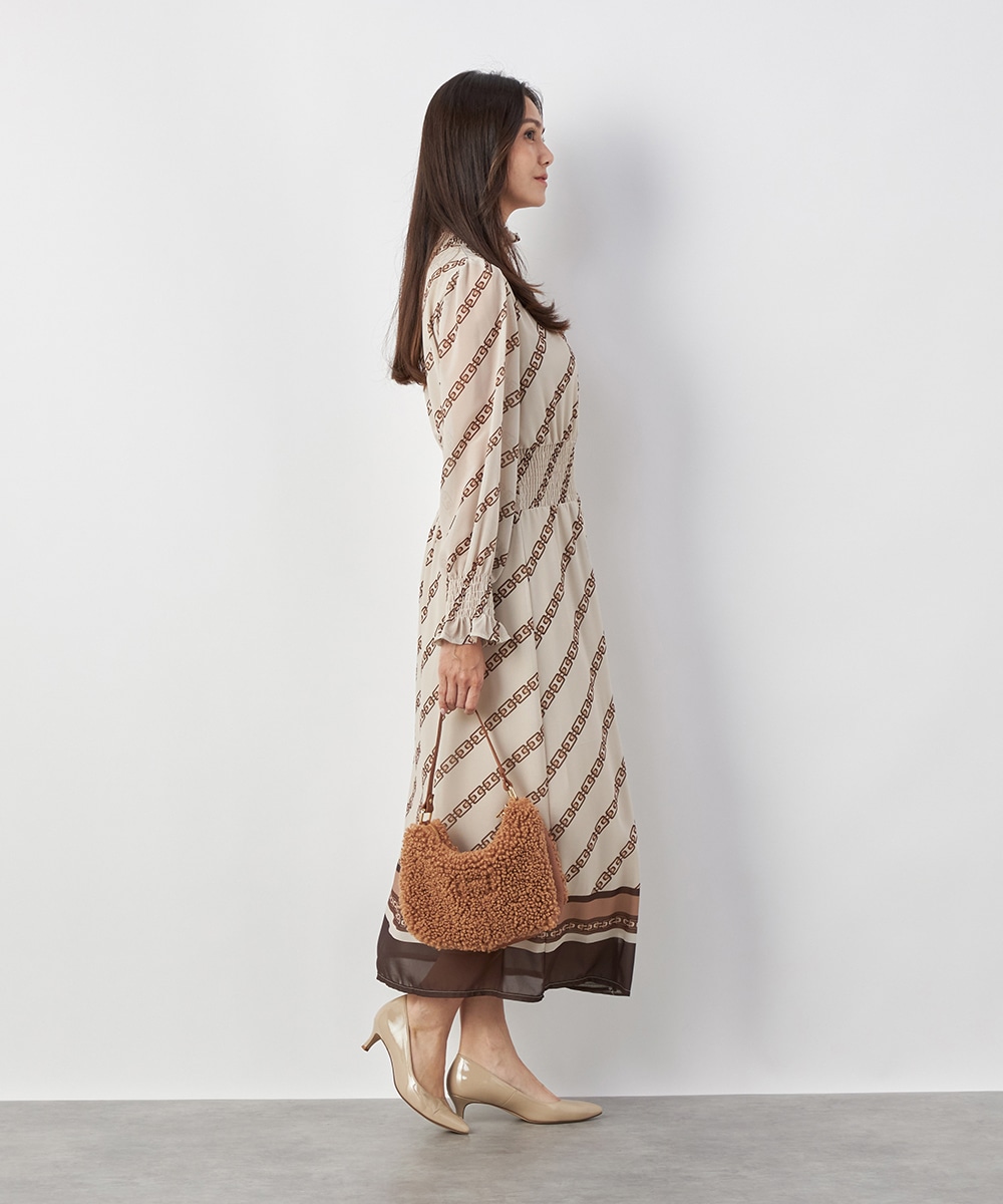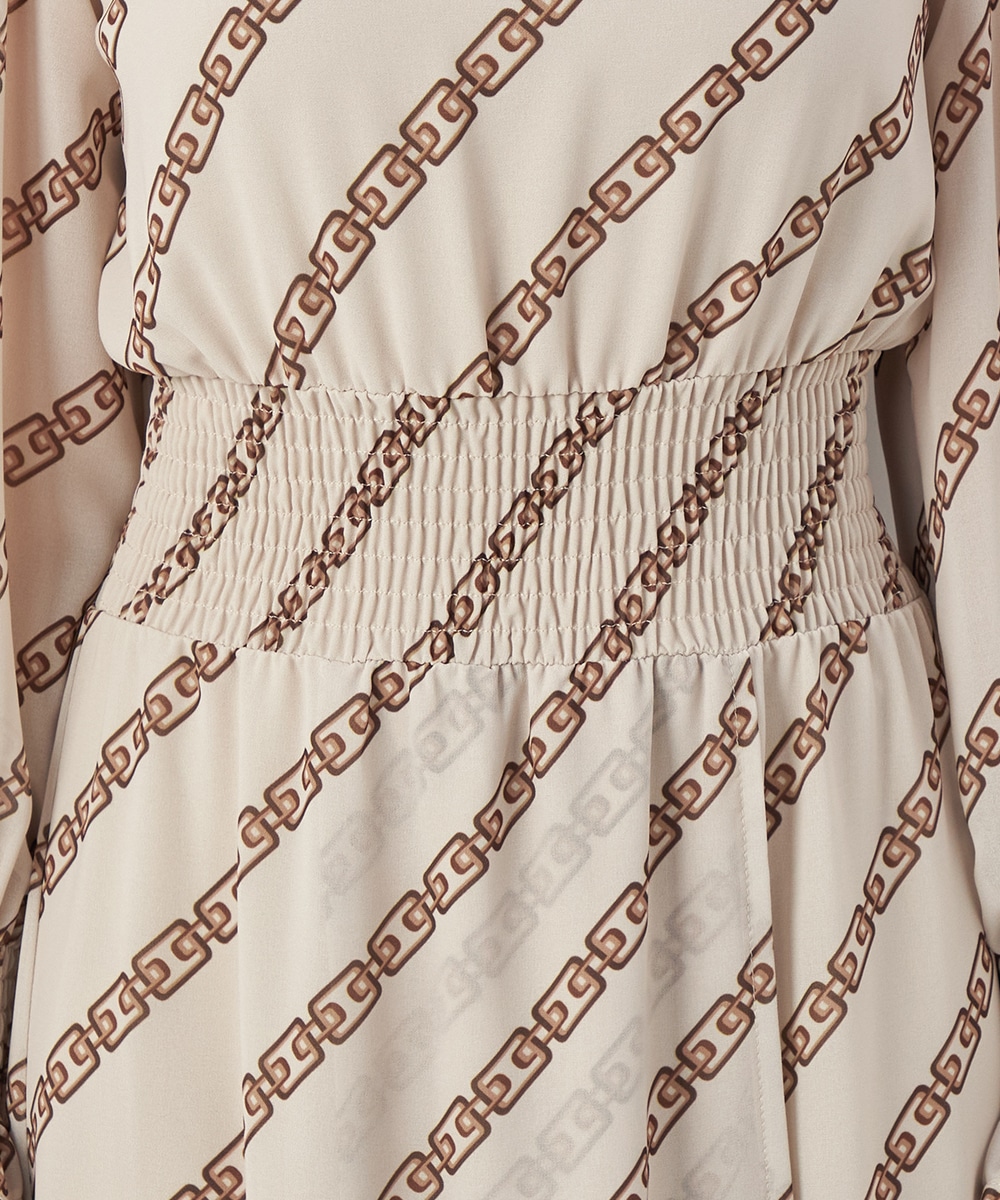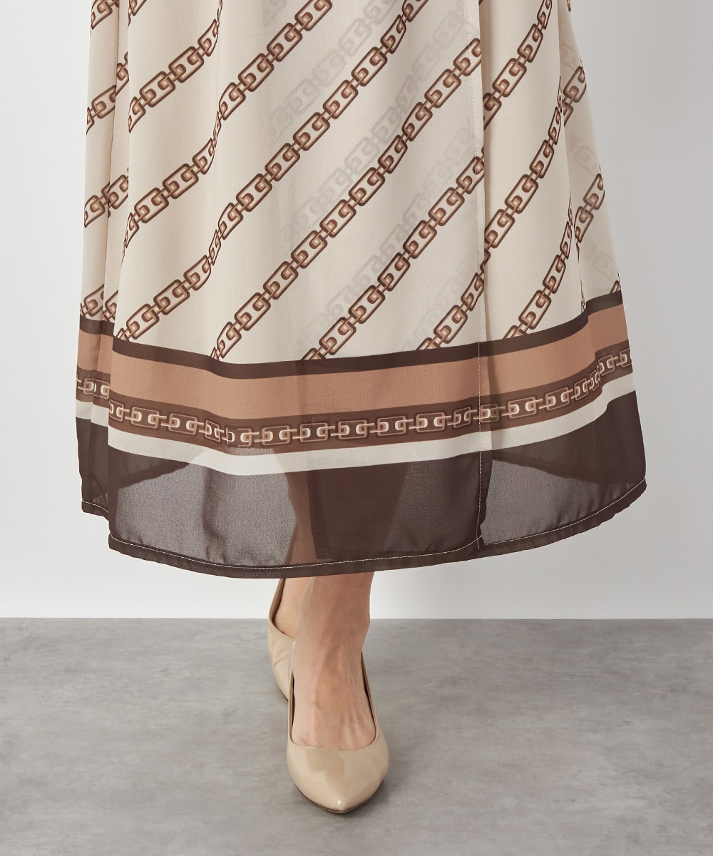 エレガントに着られるベージュベースにトレンドカラーのブラウンを組み合わせています。柄が斜めに配置されてシャープさが効いているのもデザインのポイント。裾のパネル柄が印象を引き締めます。スカート部分はラップ風の作りです。ネックとウエスト、袖口にはシャーリングを施しています。