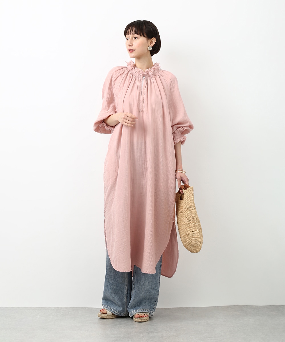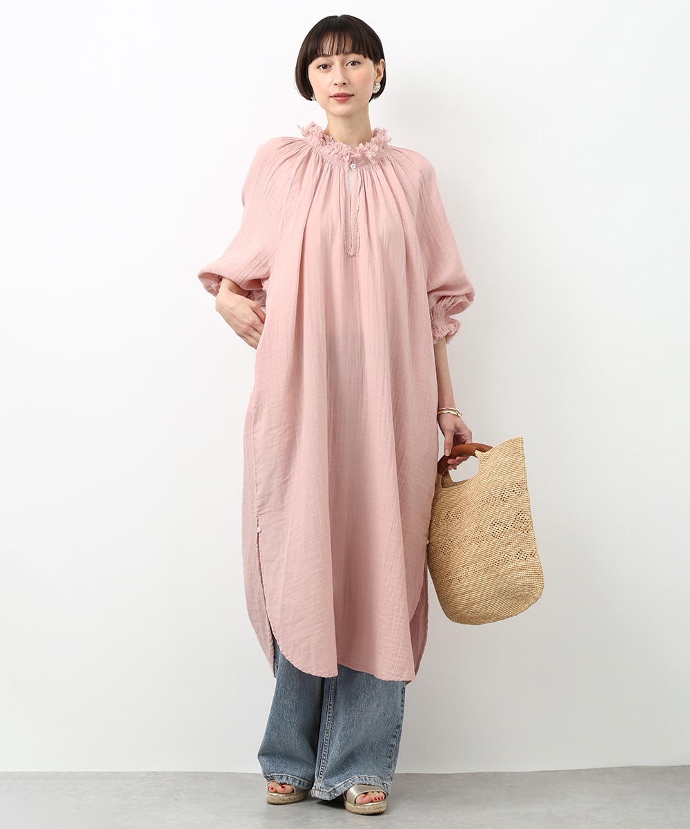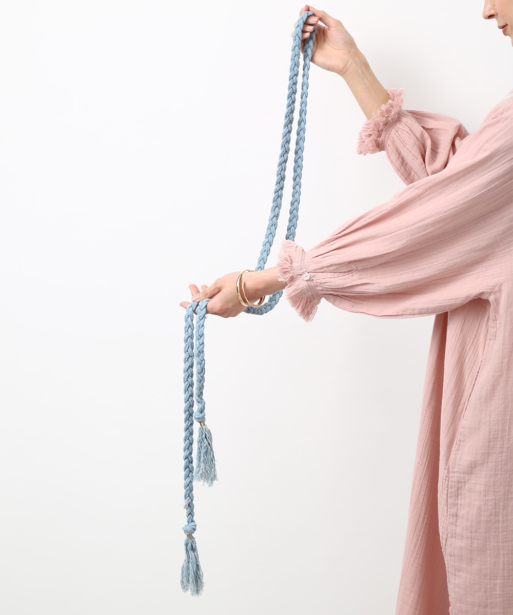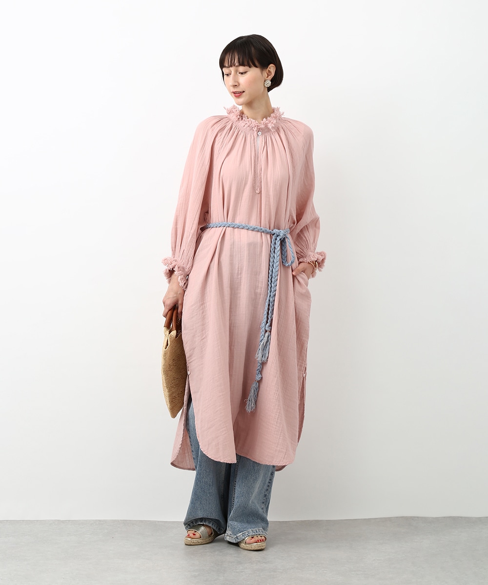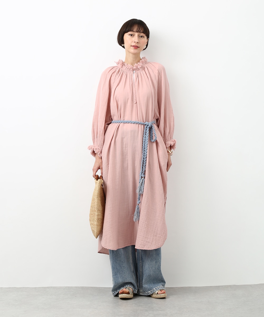 ガーゼ素材ならではのやさしい肌触りが魅力のロングワンピース。ゆとりのあるシルエットでリラックス感がありながらも、落ち感のあるラインでバランスよく着られるのもポイント。配色の編みベルトでシルエットに変化をつけて楽しめます。デニムを穿いてレイヤードした、抜け感のある着こなしもおすすめです。