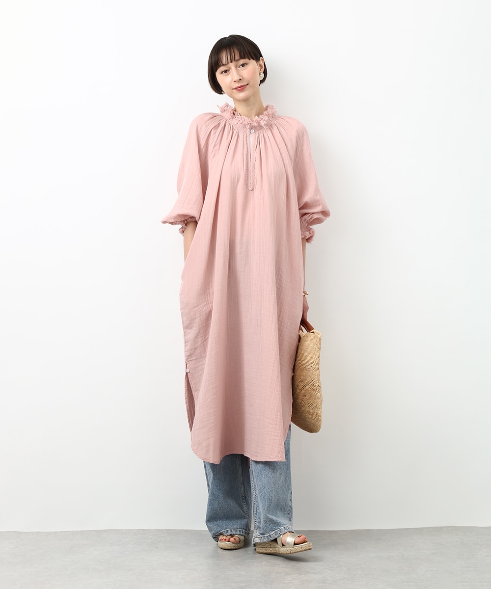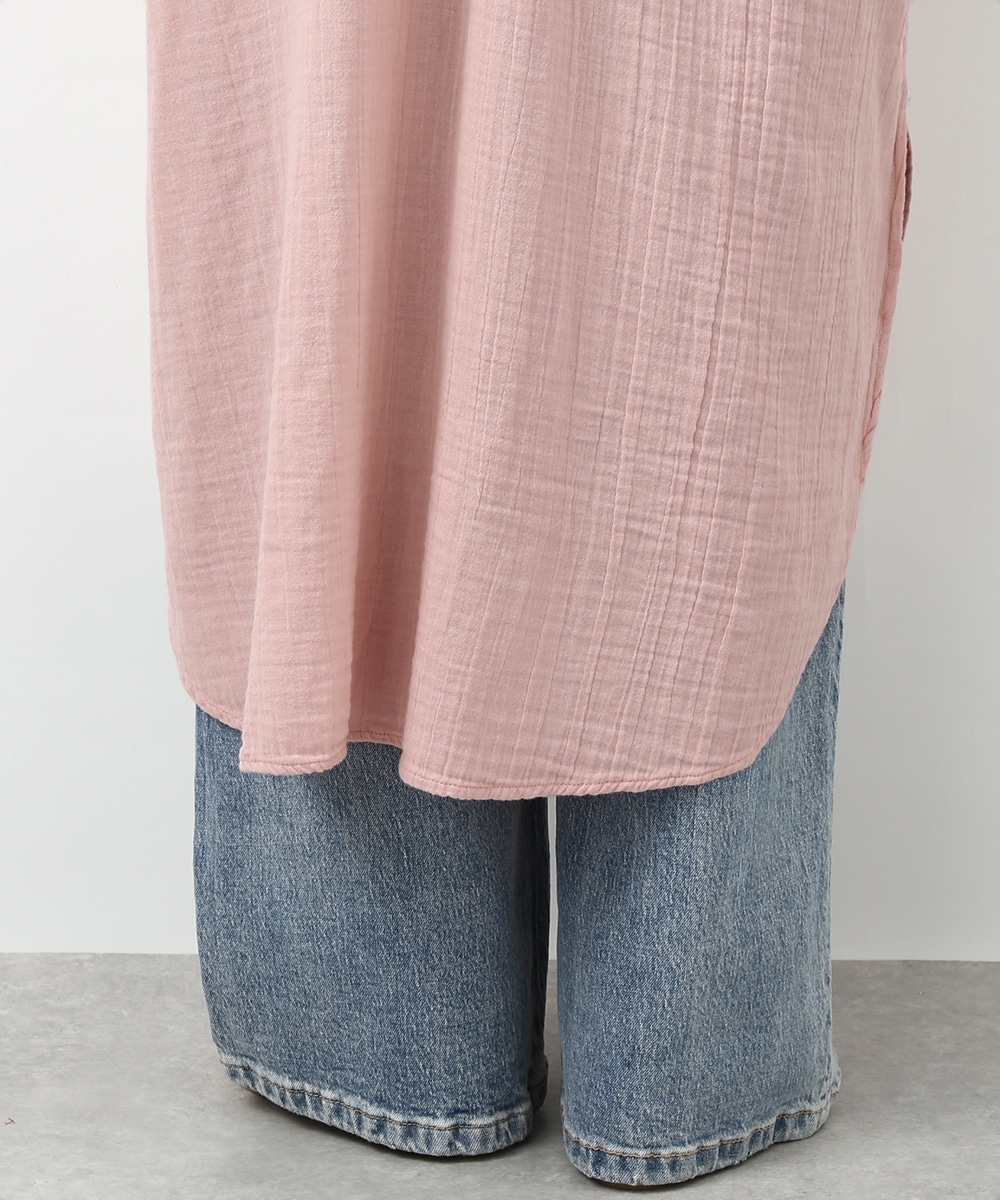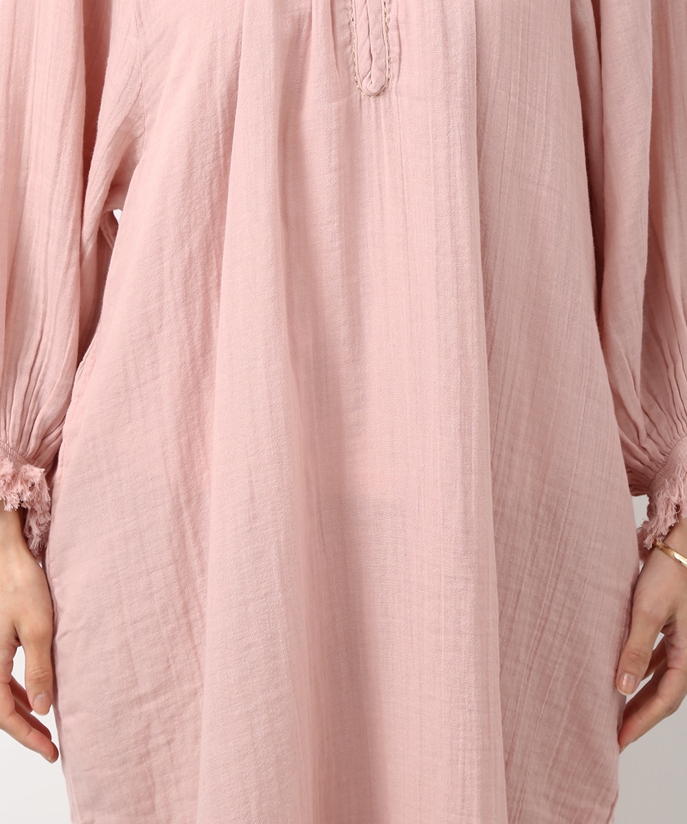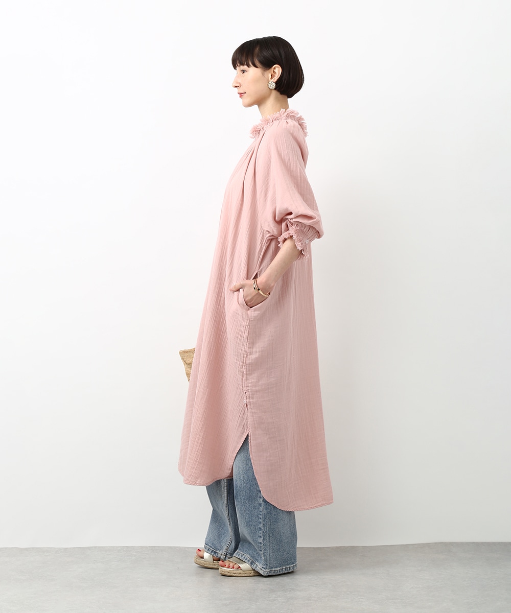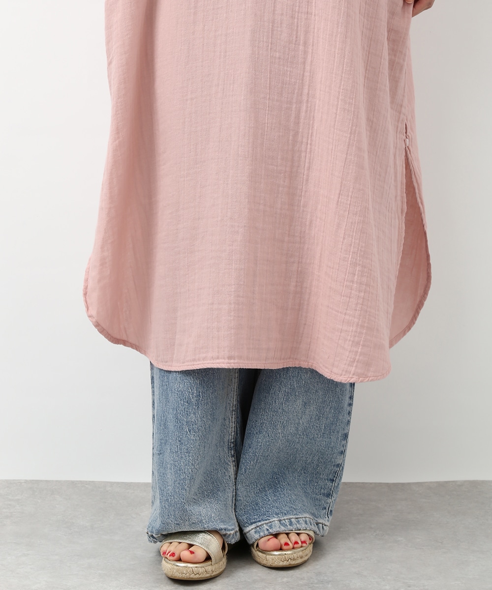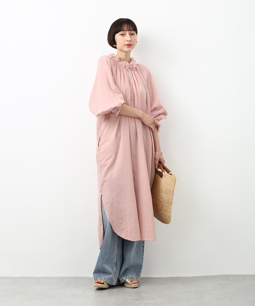 ガーゼ素材ならではのやさしい肌触りが魅力のロングワンピース。ゆとりのあるシルエットでリラックス感がありながらも、落ち感のあるラインでバランスよく着られるのもポイント。配色の編みベルトでシルエットに変化をつけて楽しめます。デニムを穿いてレイヤードした、抜け感のある着こなしもおすすめです。