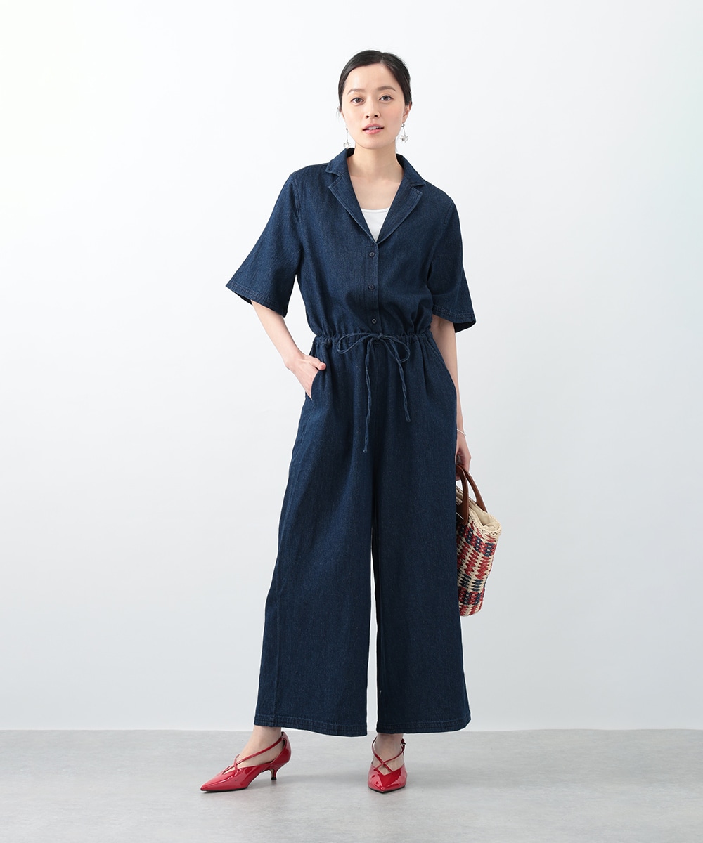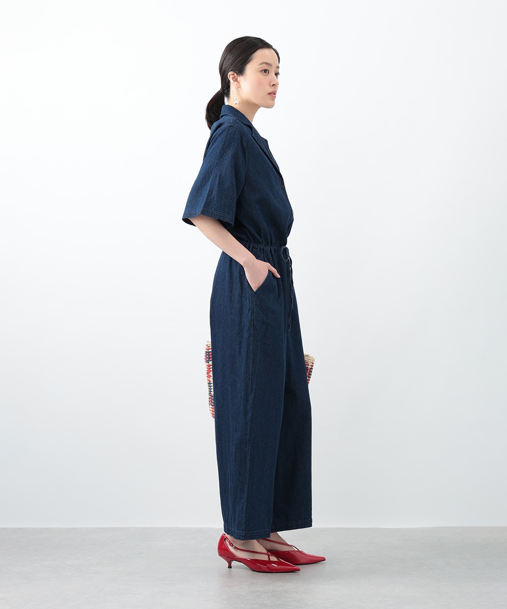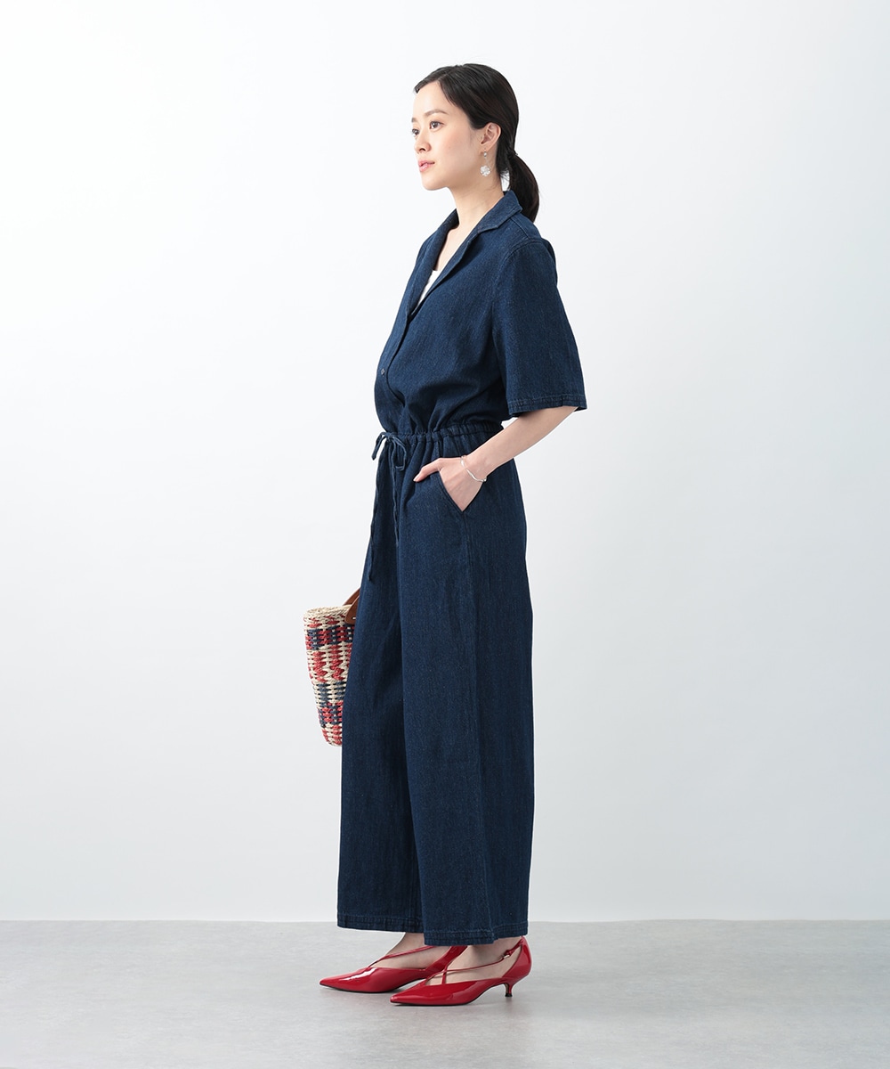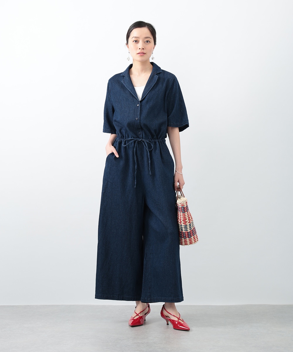 デニム生地のラフさと、テーラードカラーのきちんと感を併せ持つコンビネゾン。ゆったりとしたシルエットのためこなれ感があり、お手持ちのトップスとのレイヤードも楽しめます。ウエストのリボンでシルエットを調整可能。春から夏にかけてのお出かけスタイルに重宝するアイテムです。