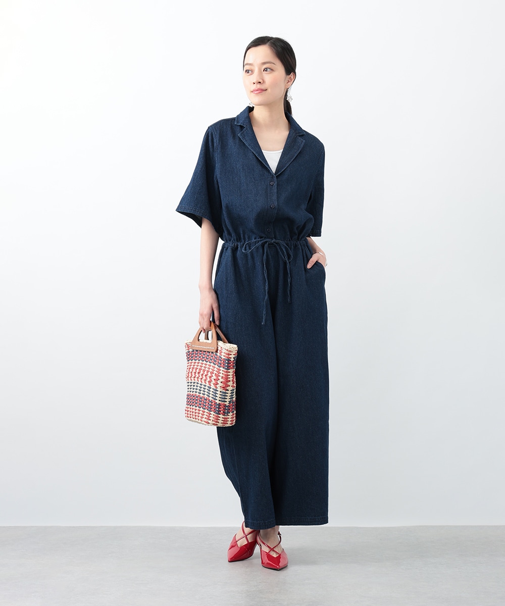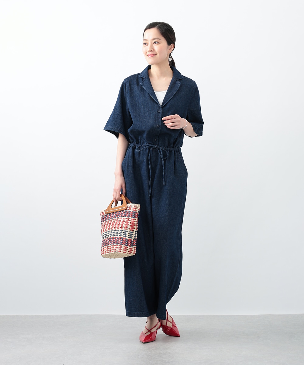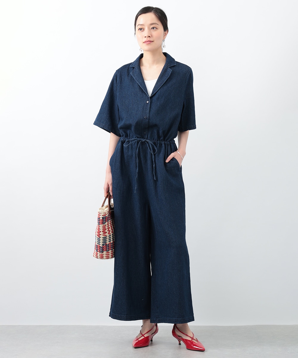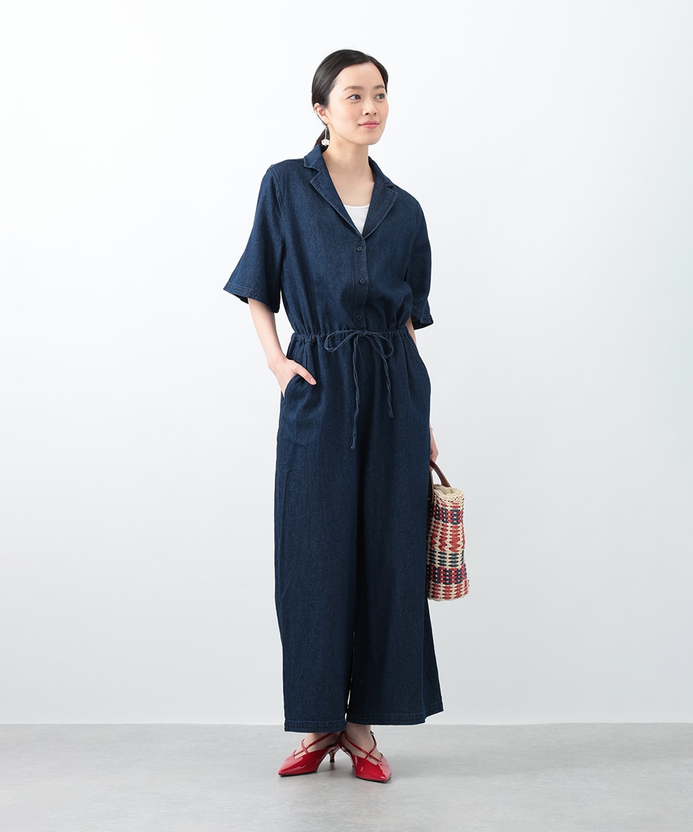 デニム生地のラフさと、テーラードカラーのきちんと感を併せ持つコンビネゾン。ゆったりとしたシルエットのためこなれ感があり、お手持ちのトップスとのレイヤードも楽しめます。ウエストのリボンでシルエットを調整可能。春から夏にかけてのお出かけスタイルに重宝するアイテムです。