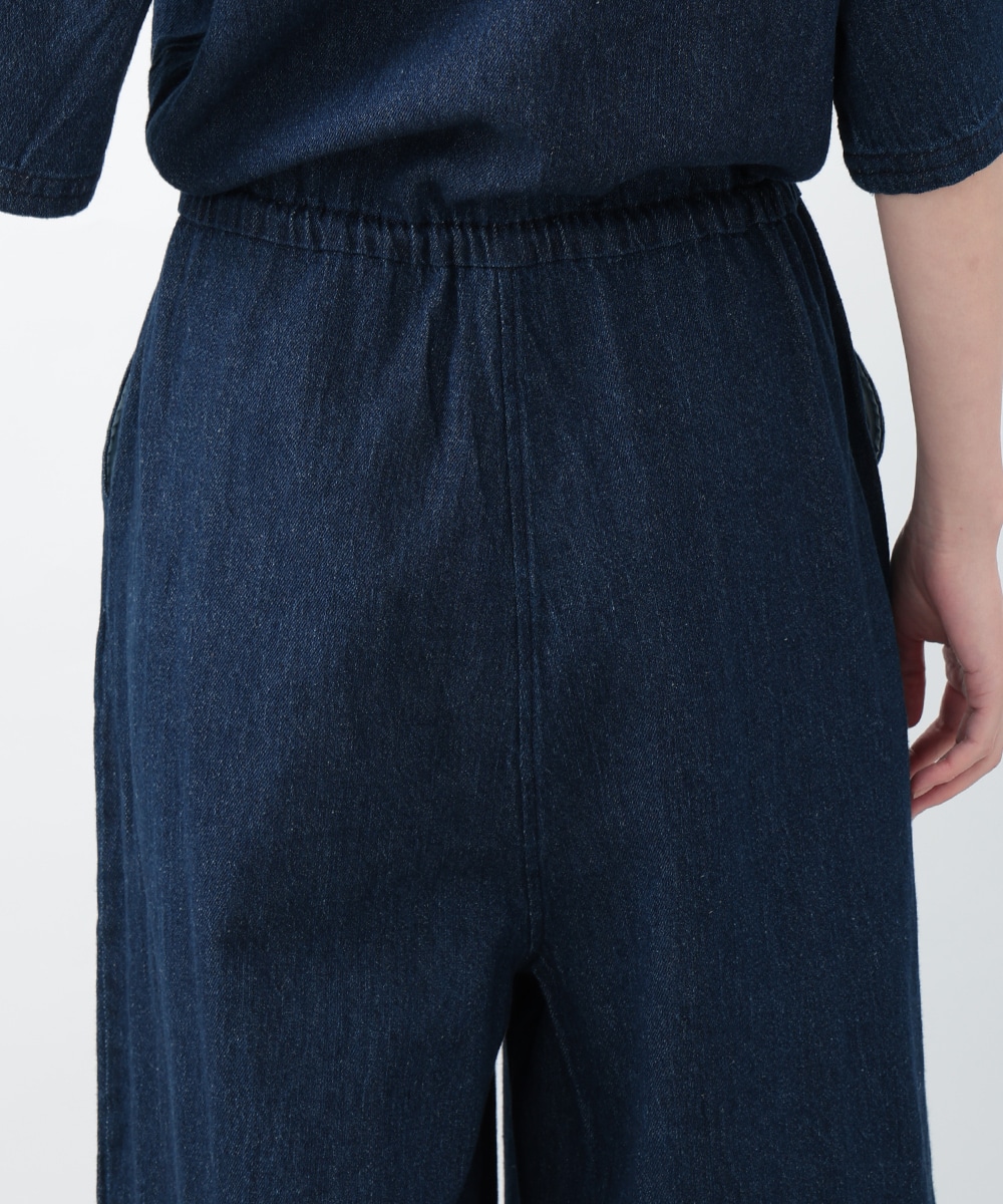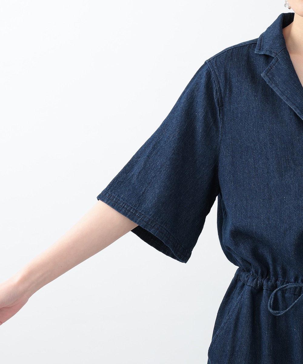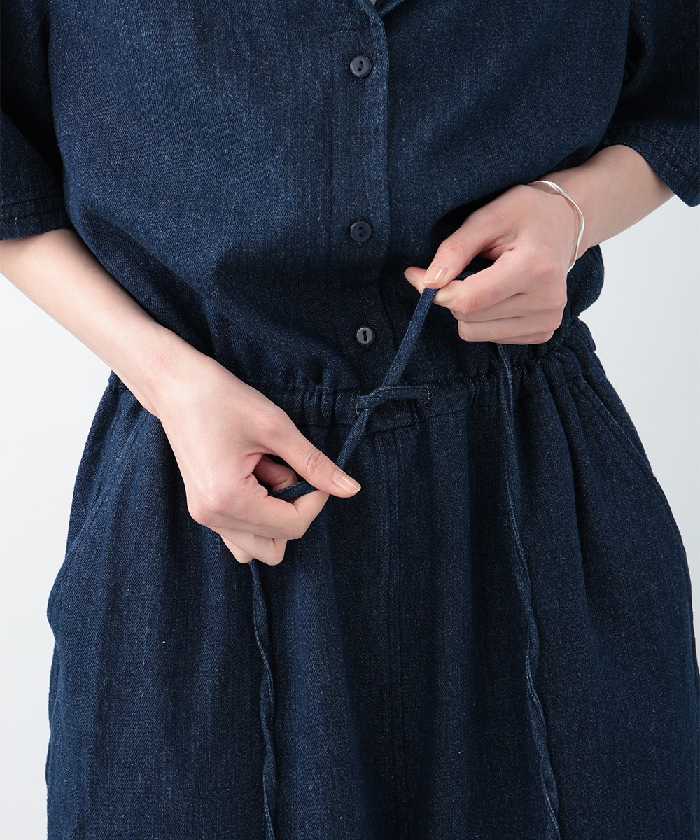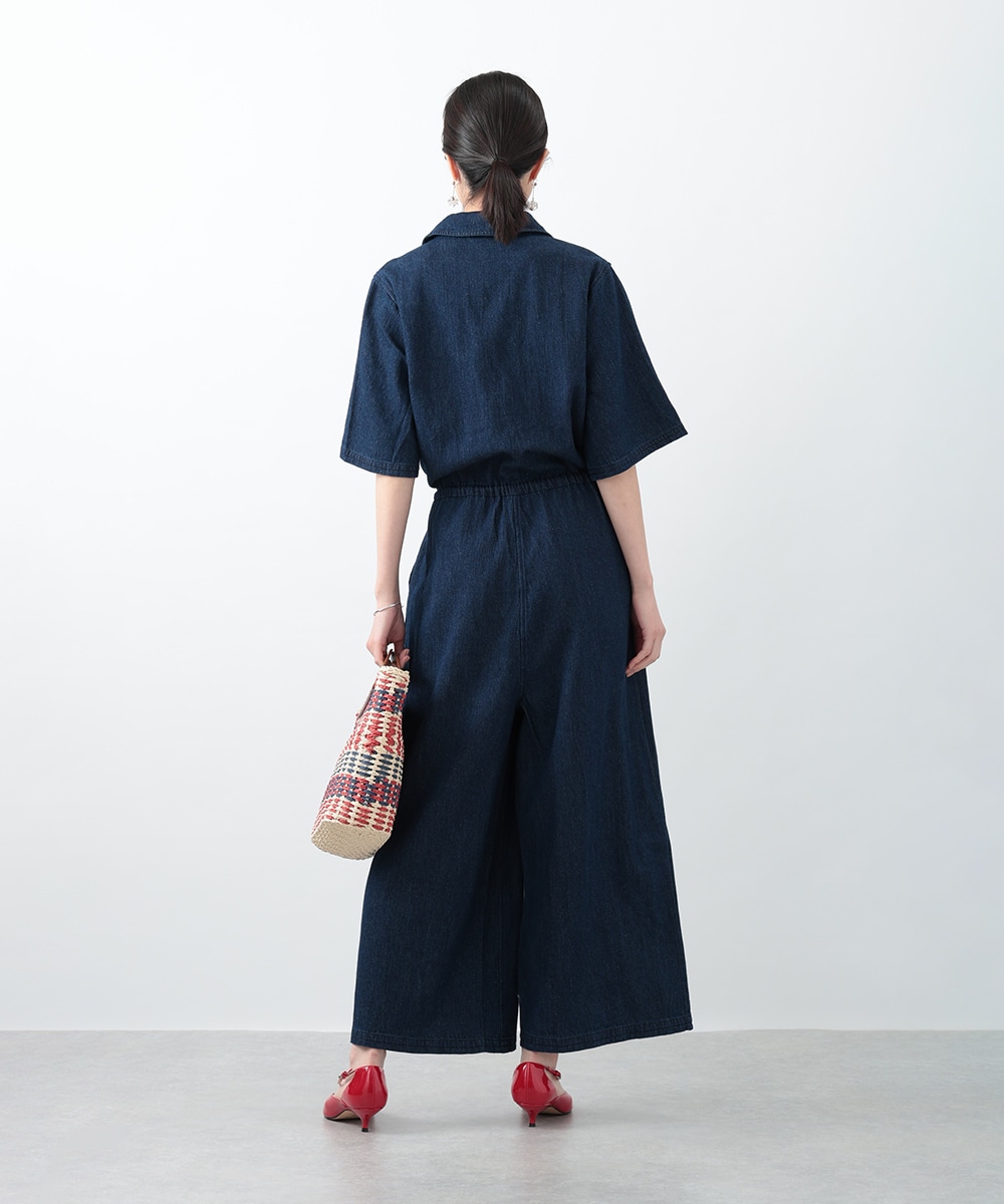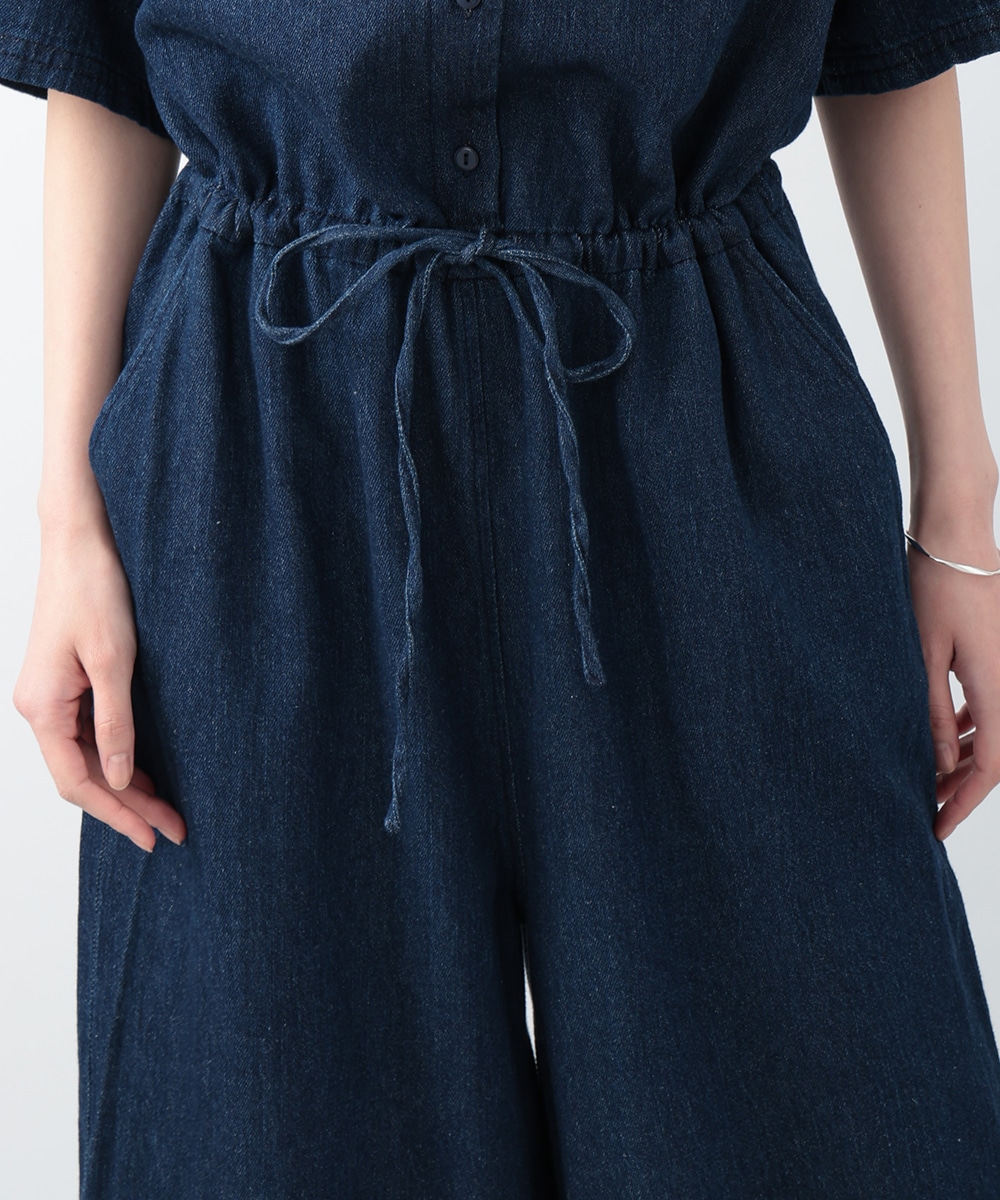 デニム生地のラフさと、テーラードカラーのきちんと感を併せ持つコンビネゾン。ゆったりとしたシルエットのためこなれ感があり、お手持ちのトップスとのレイヤードも楽しめます。ウエストのリボンでシルエットを調整可能。春から夏にかけてのお出かけスタイルに重宝するアイテムです。